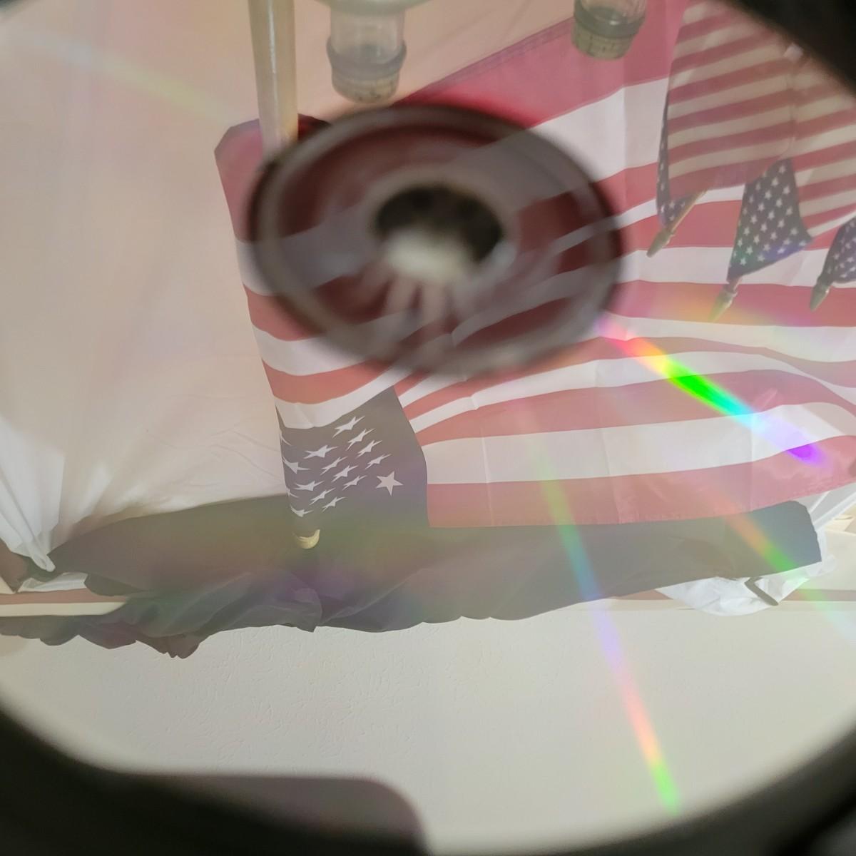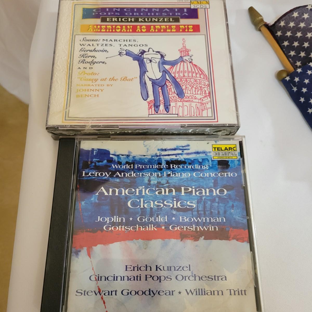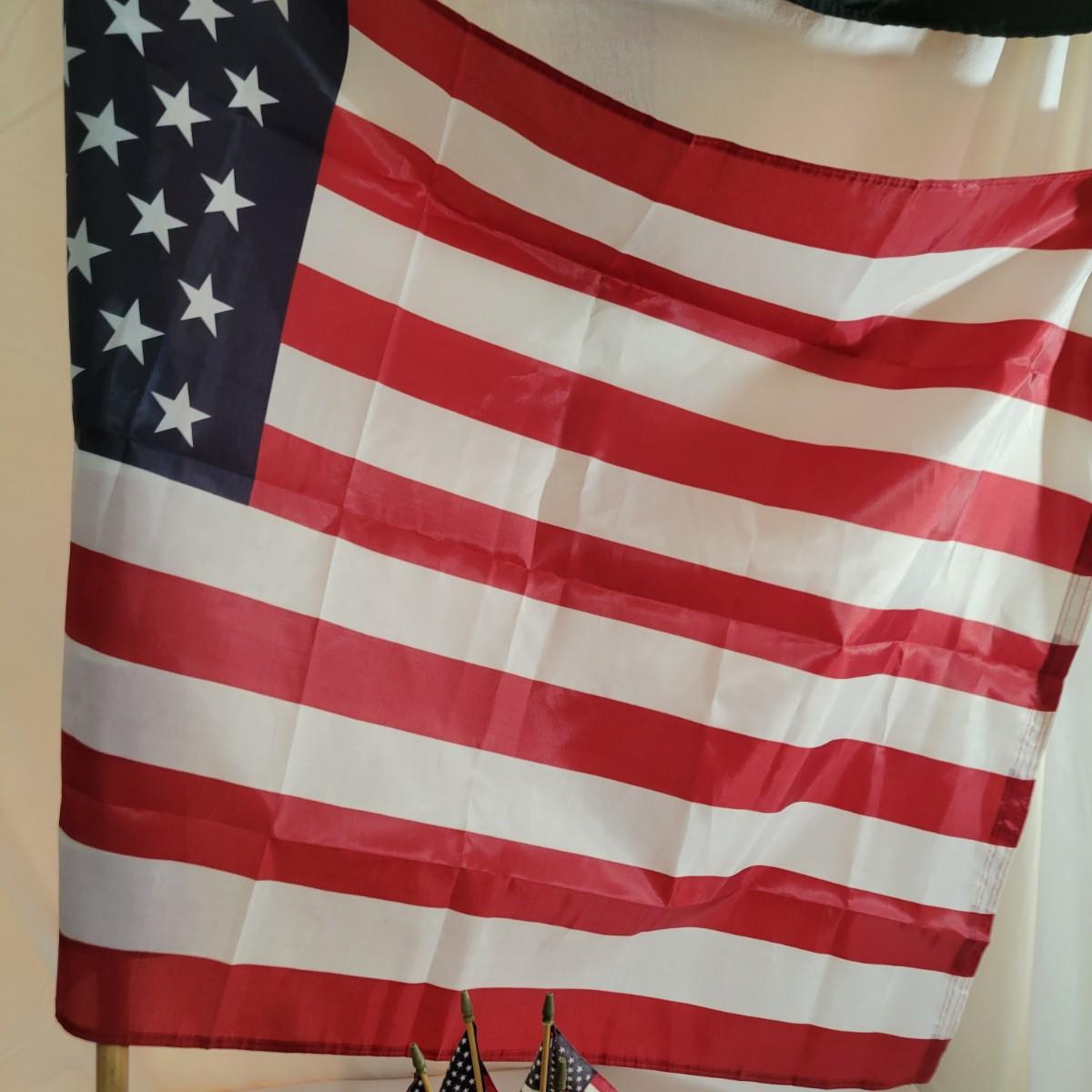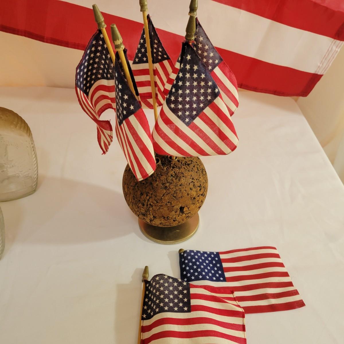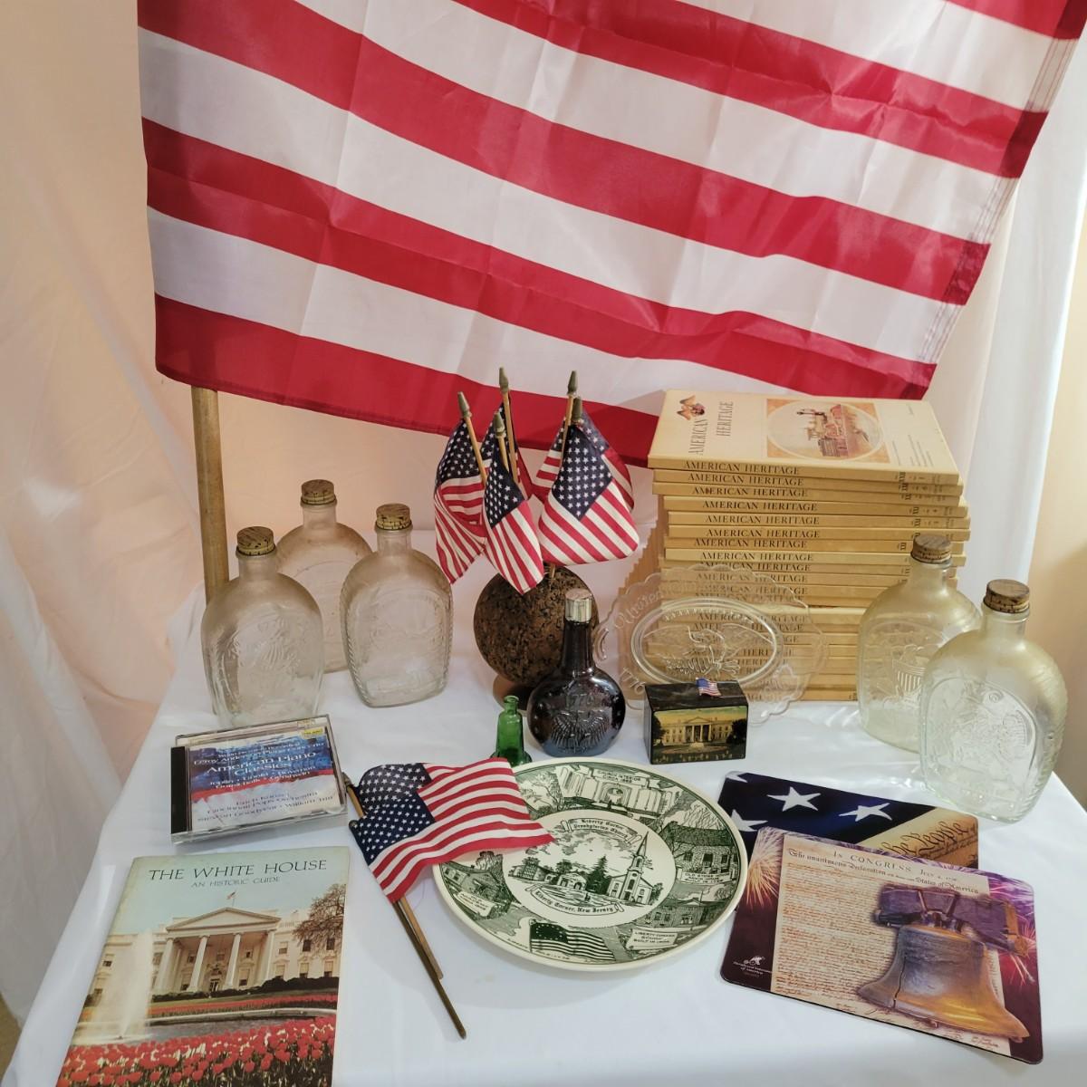 A large assortment of flags, books, bottles and other Americana memorabilia in good condition. Lot includes approximately 22 volumes of American Heritage, multiple small flags, a large American flag. CDs, commemorative plates, bottles and more. The large American flag measures approximately 56" x 36". Local pickup only
