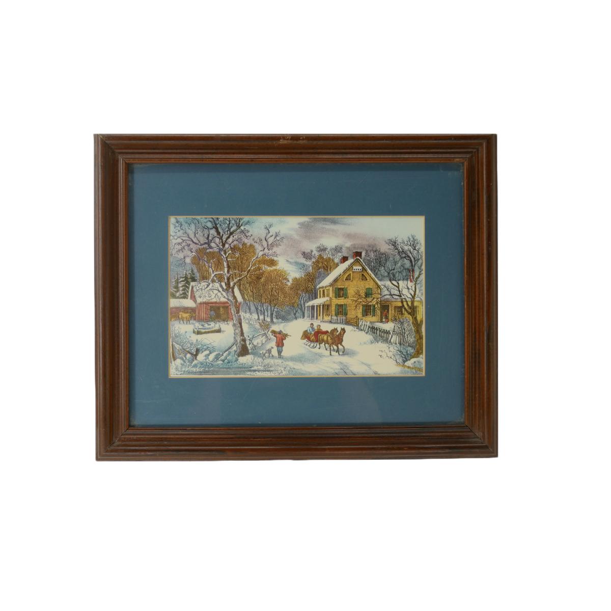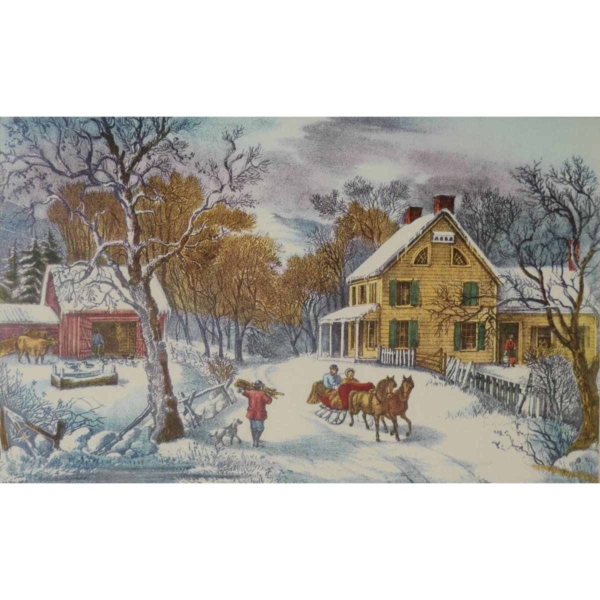"American Homestead Winter" by Currier & Ives, originally 1868. Art depicts a quaint homestead with snow and horses and sleigh. Lithograph is in excellent condition. Framed and matted, frame has wear. Artwork measures 10.5" x 6.5", total frame measures. 16.25" x 13.5" x 1". (A25)