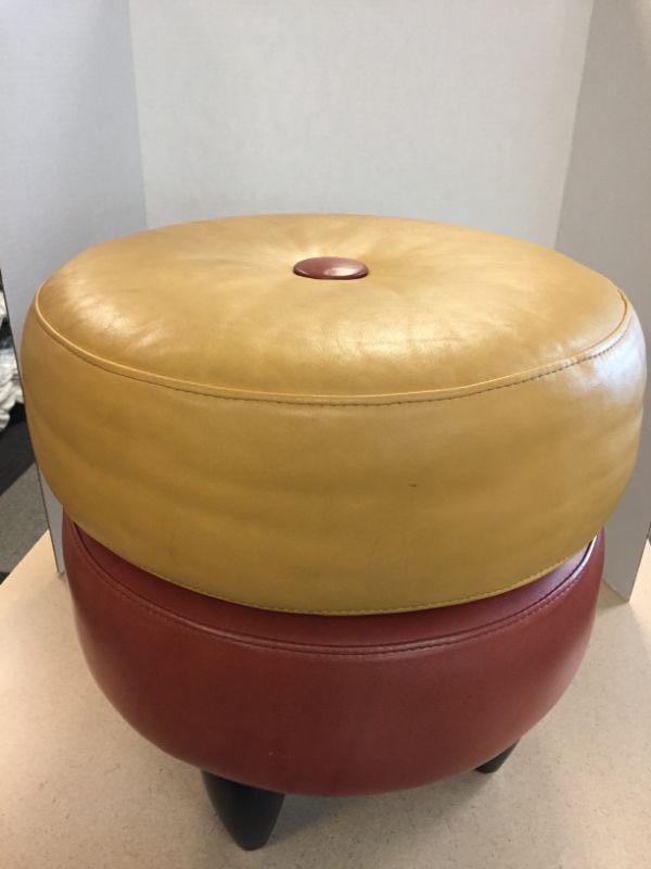 American Leather two tone round footstool with button detail. Minor scuffs on legs, otherwise in excellent condition.