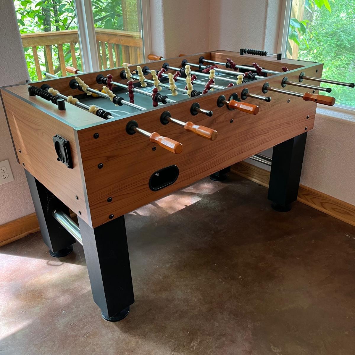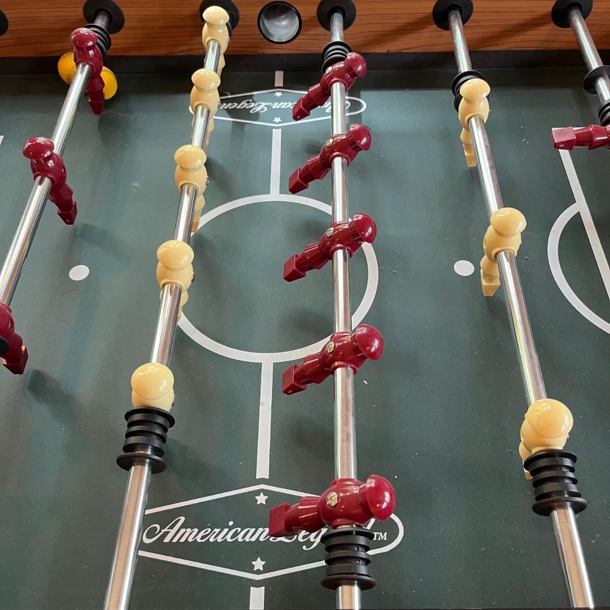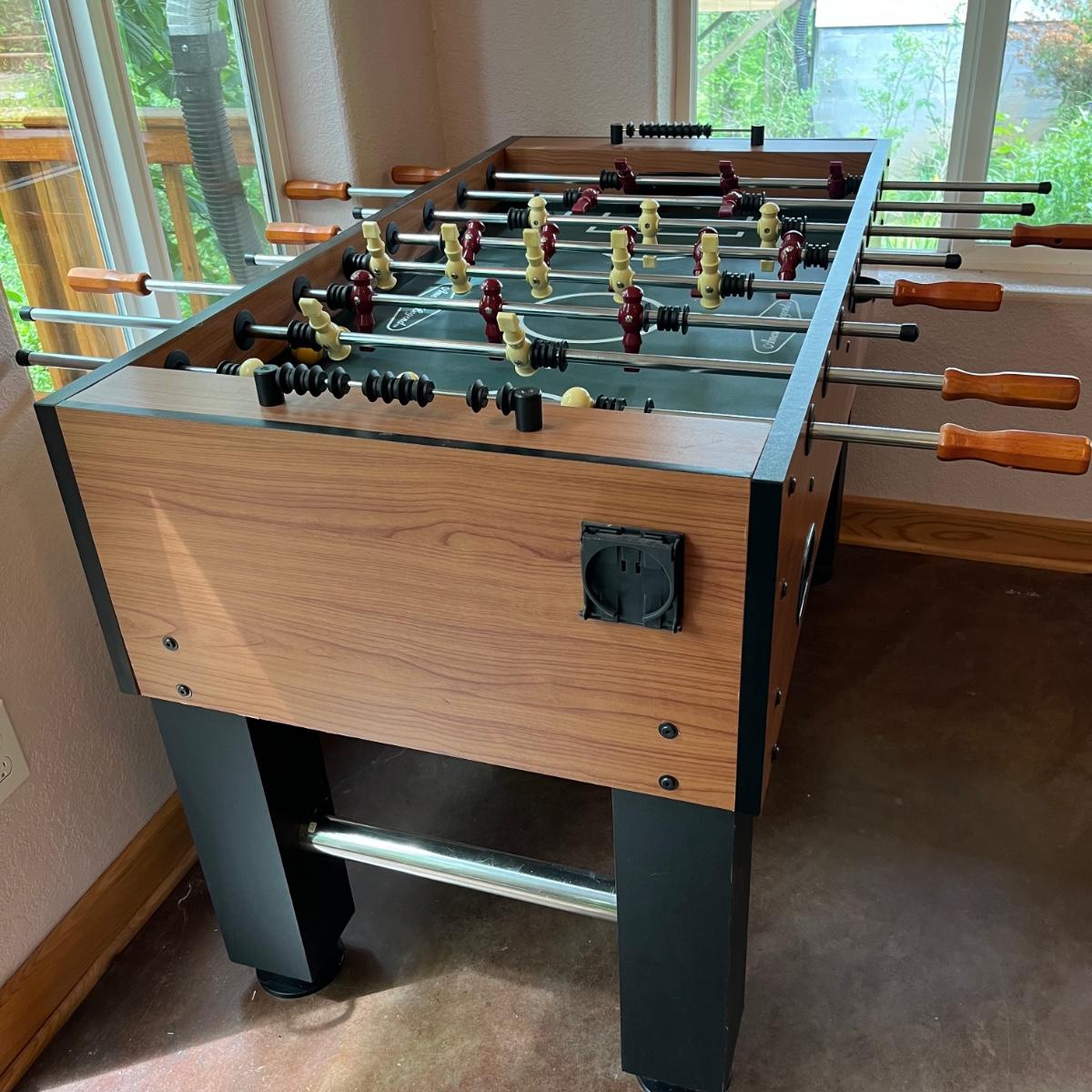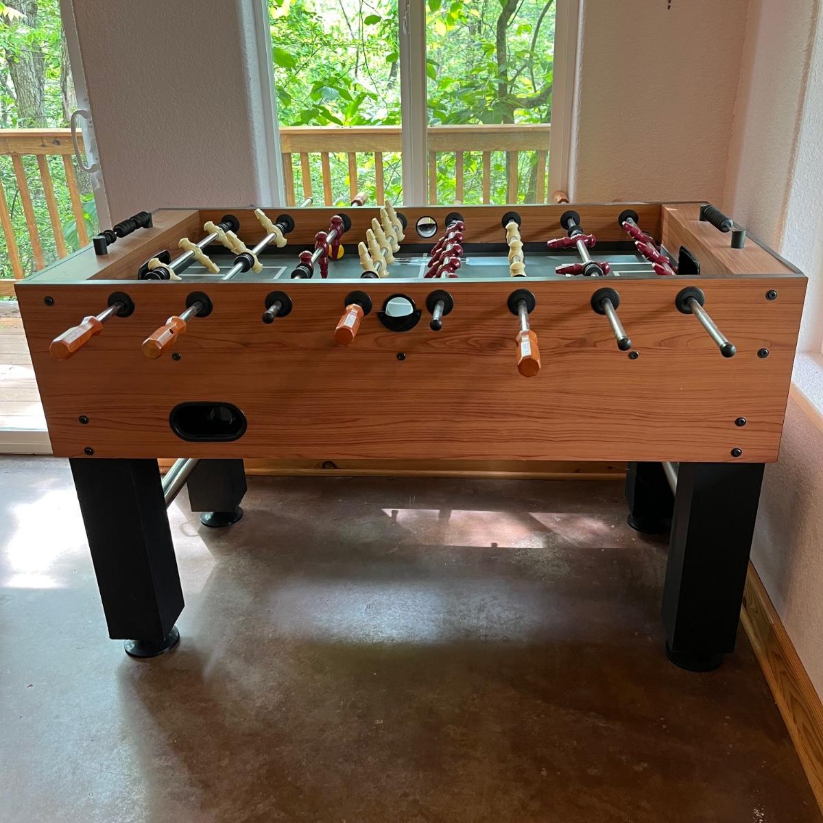 This lot includes one large American Legend foosball table and balls. The table appears to have no scratches or signs of wear. The table includes about 7 foam balls. The foosball table measures about 55” x 50” x 34.5”H. Local pickup only. Winning bidder must bring assistance to help move and load this item due to its weight and/or size.