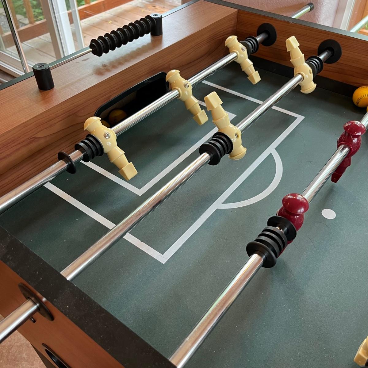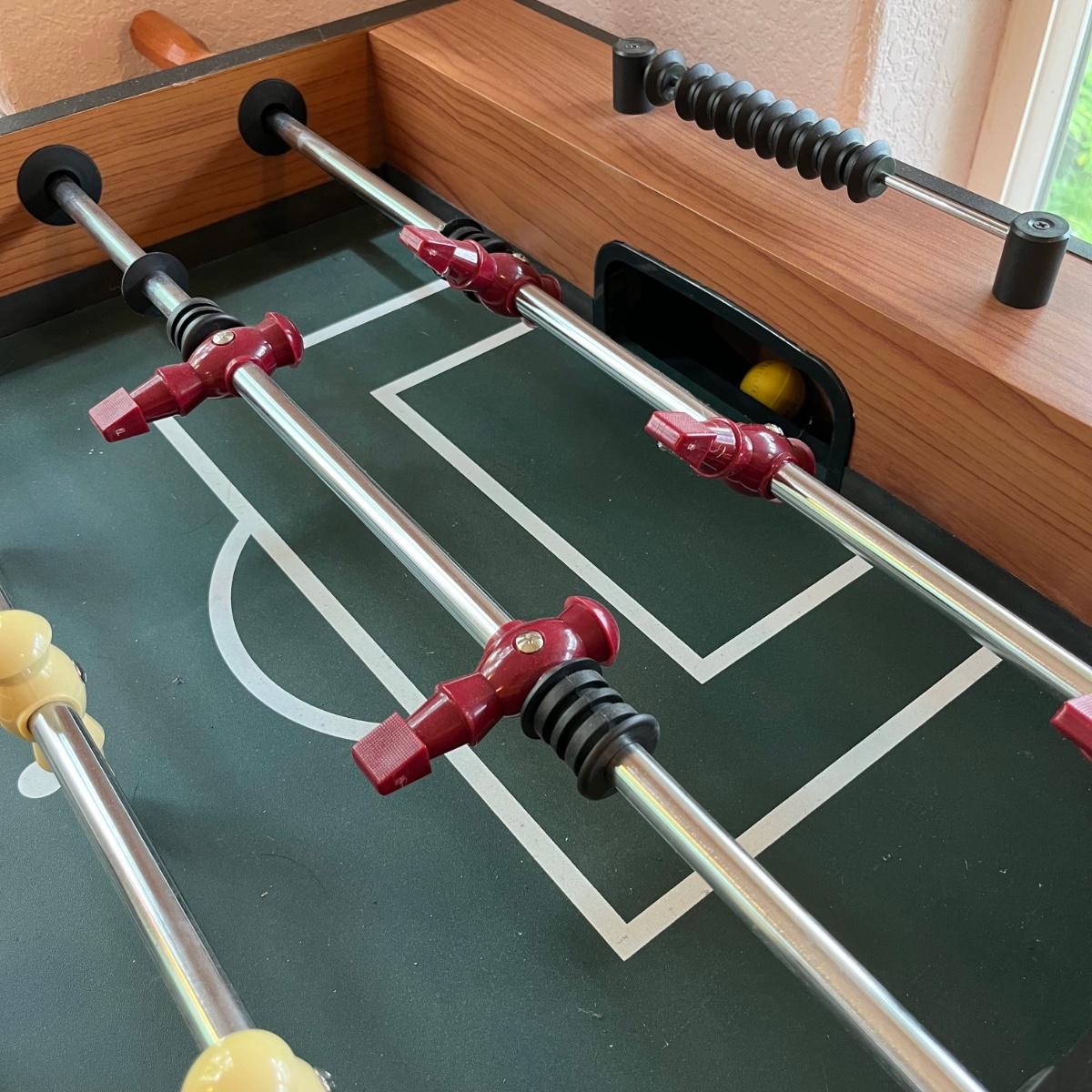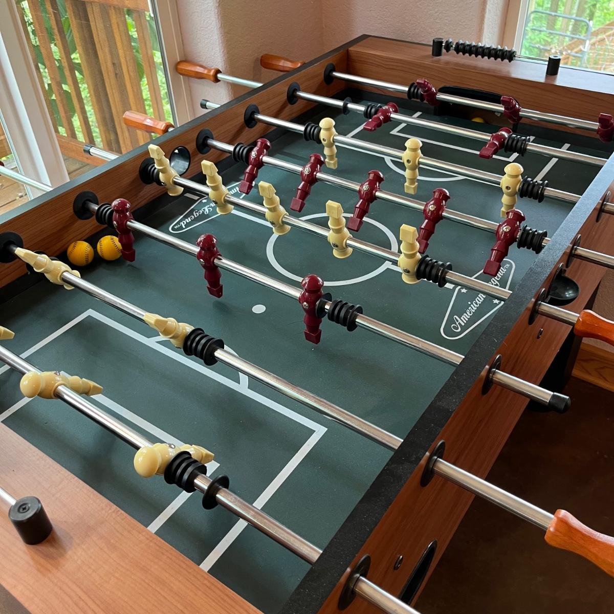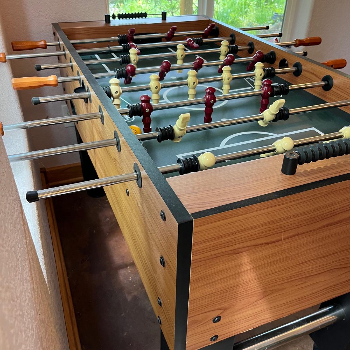 This lot includes one large American Legend foosball table and balls. The table appears to have no scratches or signs of wear. The table includes about 7 foam balls. The foosball table measures about 55” x 50” x 34.5”H. Local pickup only. Winning bidder must bring assistance to help move and load this item due to its weight and/or size.