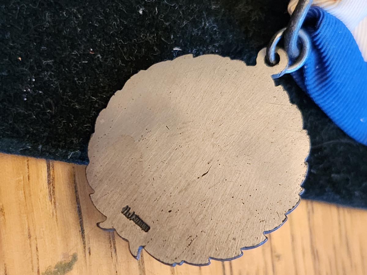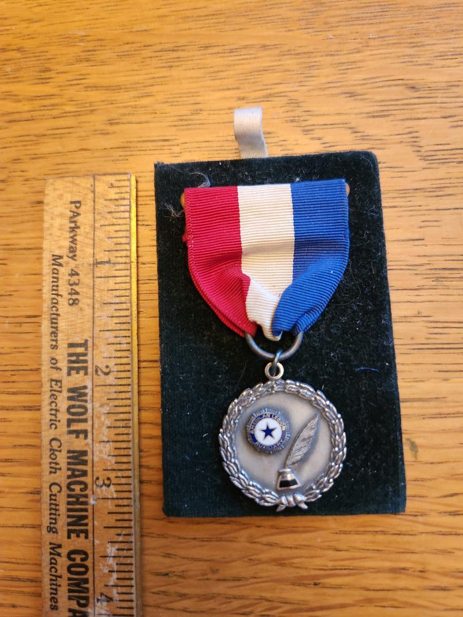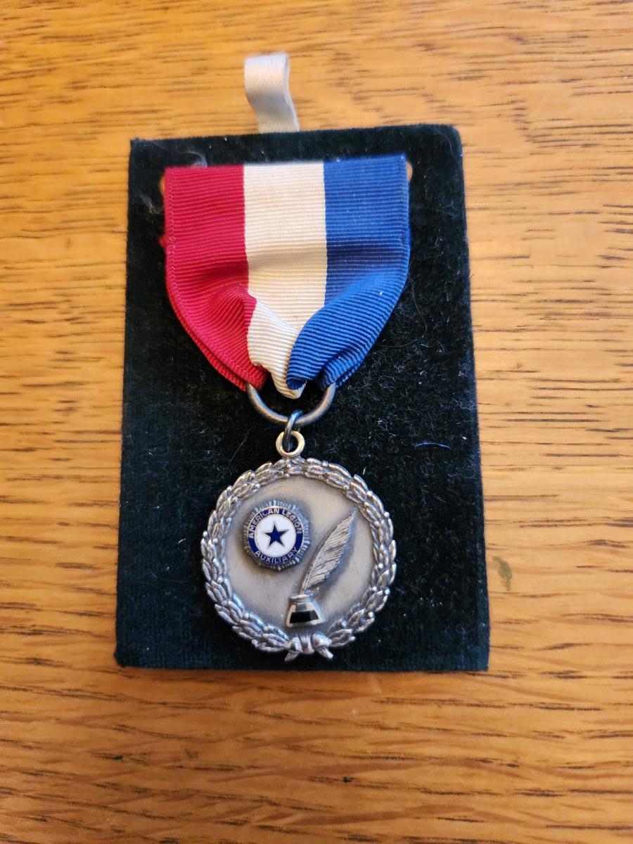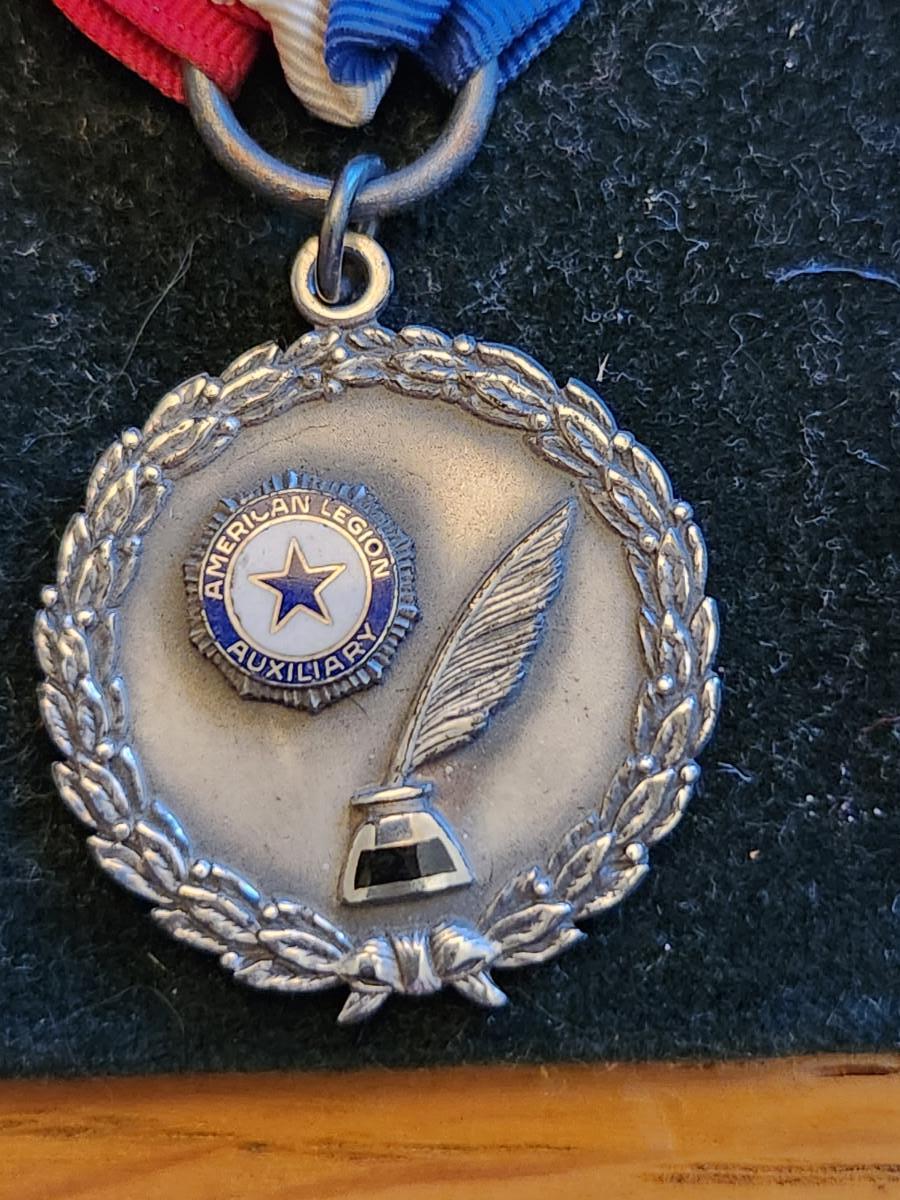 This auction lot is for a American Legion Auxiliary Award Medal. This medal was found in the cedar chest tray in a recent estate we are liquidating. It appears to be in recognition of writing or penmanship based on the design. The medal is mounted on a velvet board. Ther verso is marked H.J. Sterling.