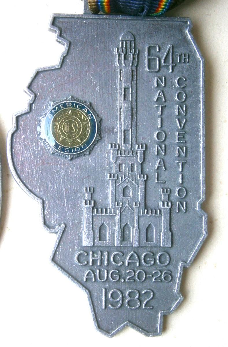 3 Vintage American Legion National Convention Medals, 1982 Chicago, 1983 Seattle Washington, & 1985 New Orleans, made of cast metal, 1 3/4 to 2 1/4 in. tall (medals only).