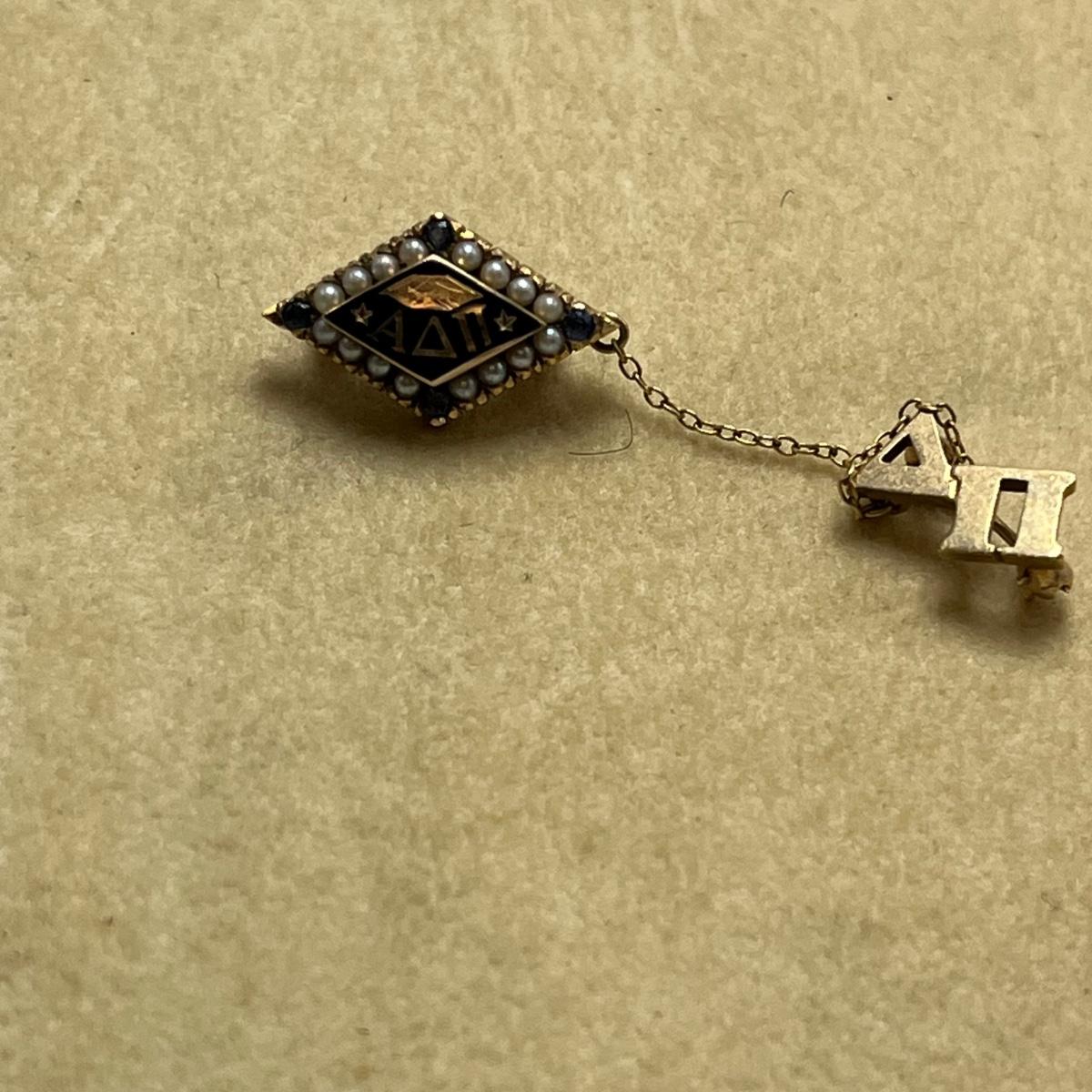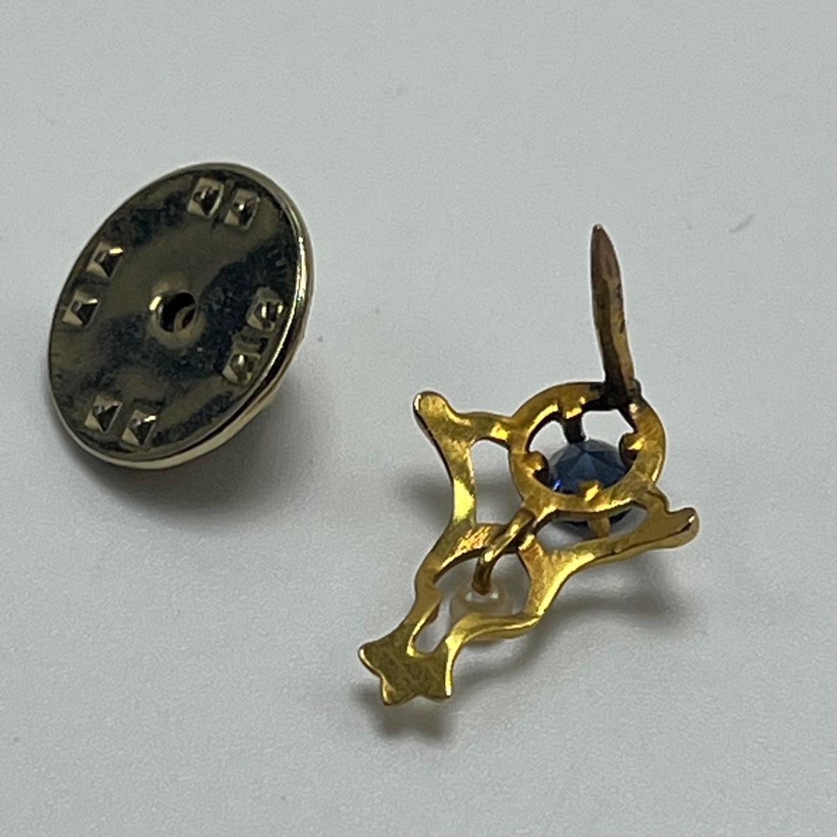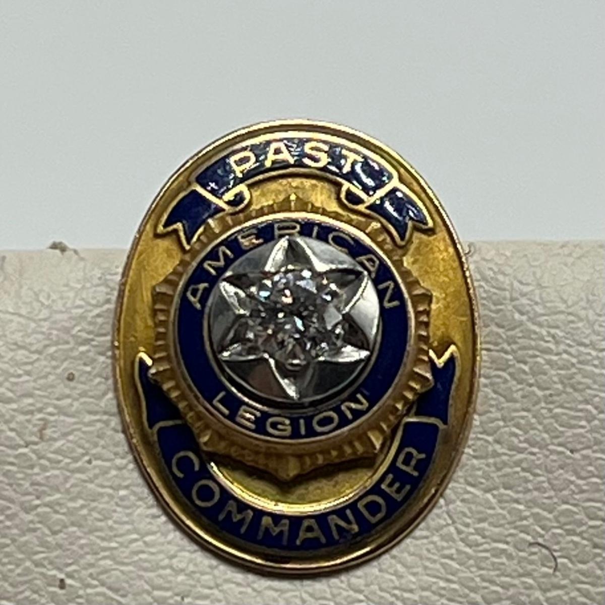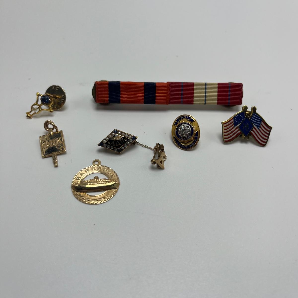 Lot includes an American Legion pin and marked '10KB.C.' with a gemstone that our diamond tester indicated is a diamond, a Barbados Charm marked 14k, a fraternity pin marked 10k, a fraternity charm, and a flag pin with two military ribbons. Also includes pin with sapphire colored stone. All sales are final. No returns or refunds. Please bid accordingly.