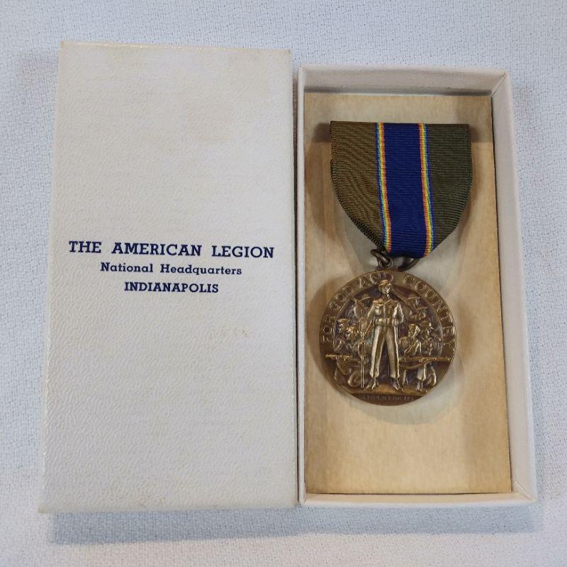 This offering is for an American Legion Ribbon and Metal as placed in the original box. States on back it was a School Award Scholarship Metal. In very good condition.