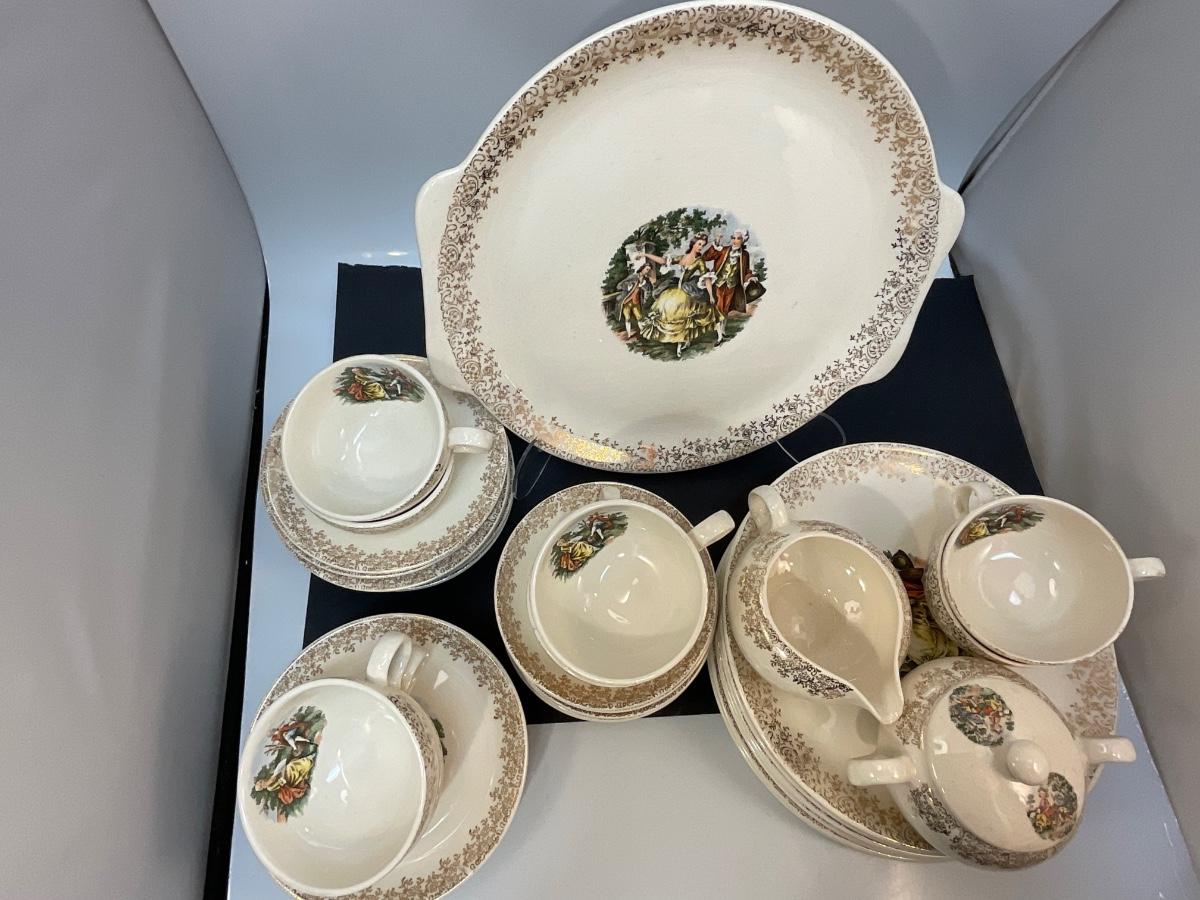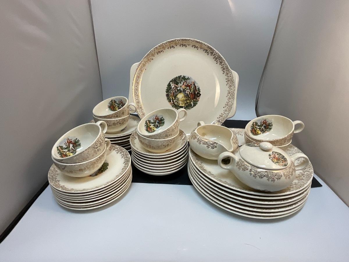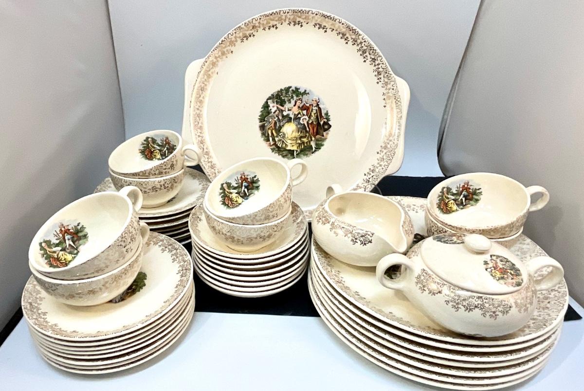 In very good used condition. One small chip on back edge of platter that cannot be seen in the front. Dinner Plates, Salad plates, fruit bowls, teacups and saucers, platter.