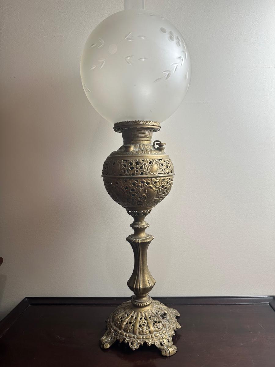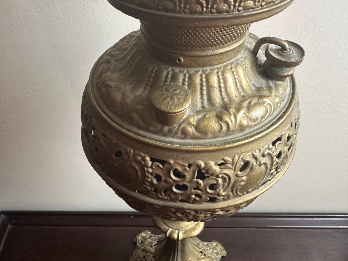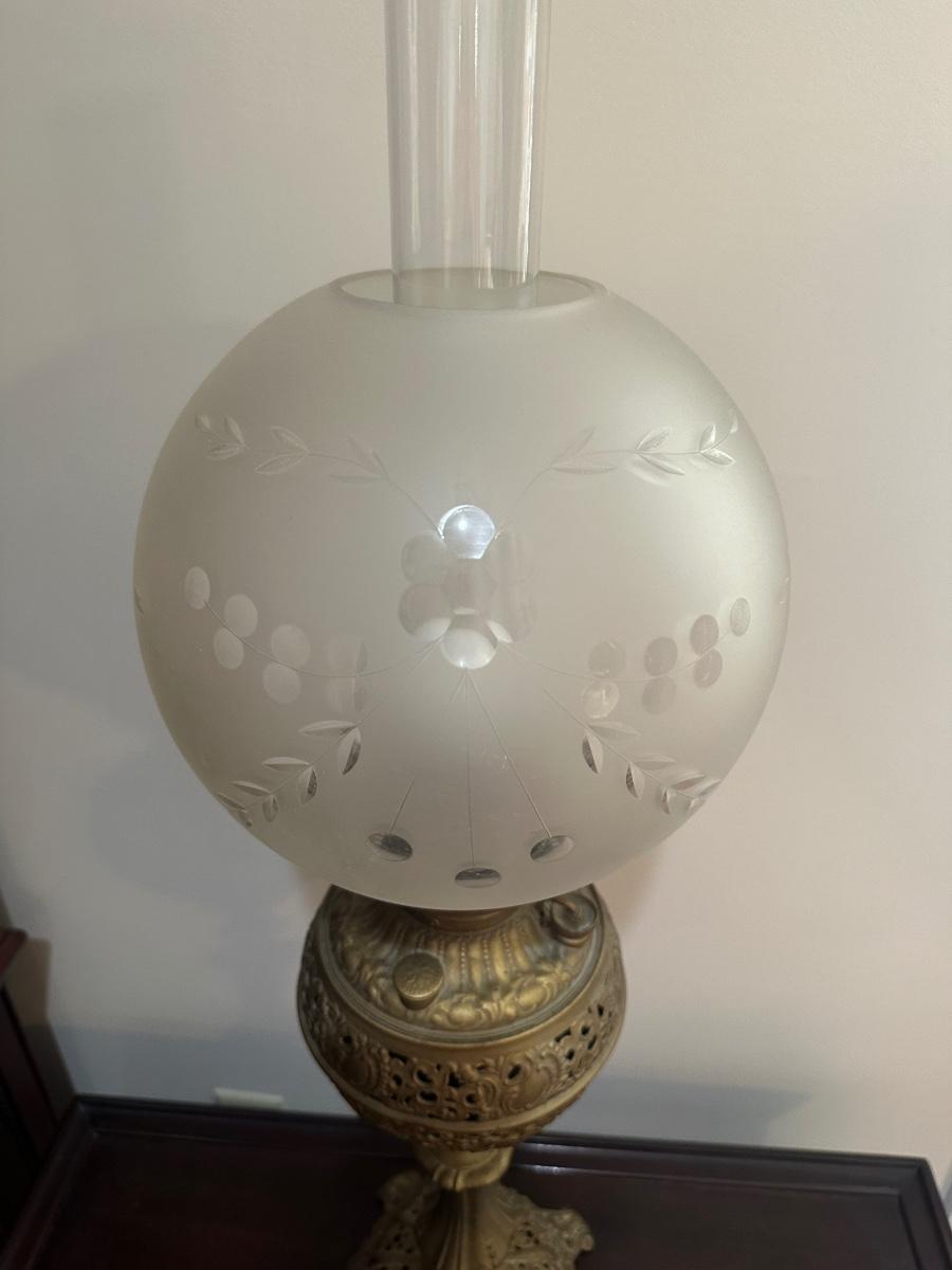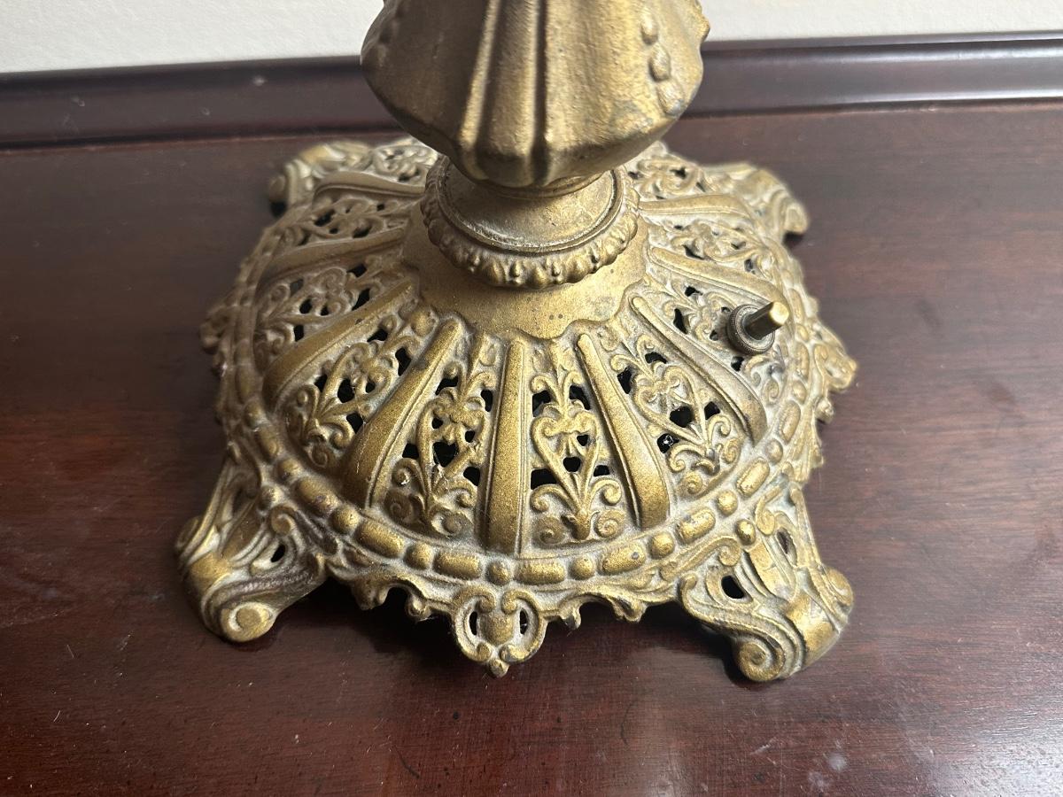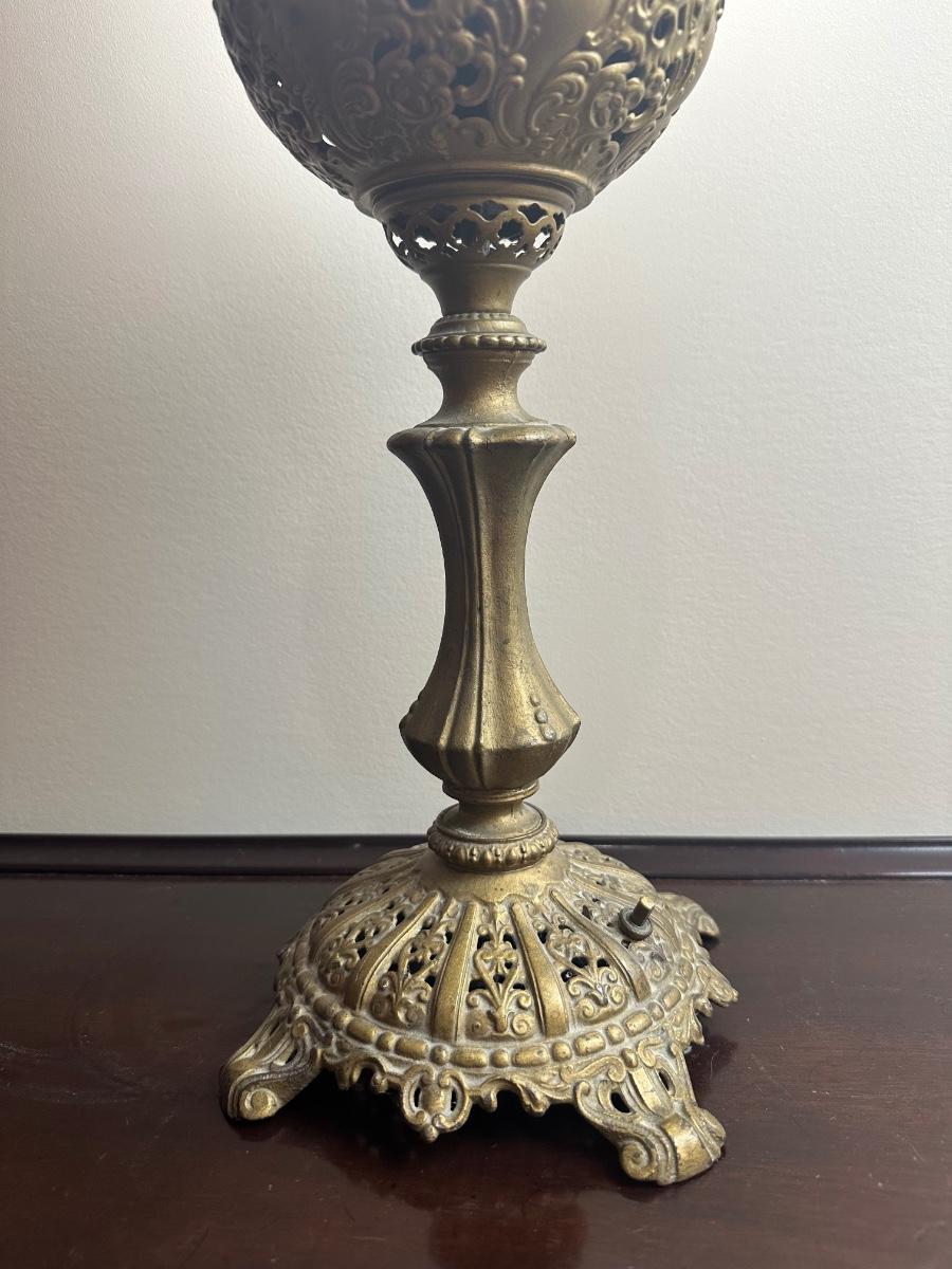 American Made Ornate Brass-Tone Table Lamp with Etched Glass Globe