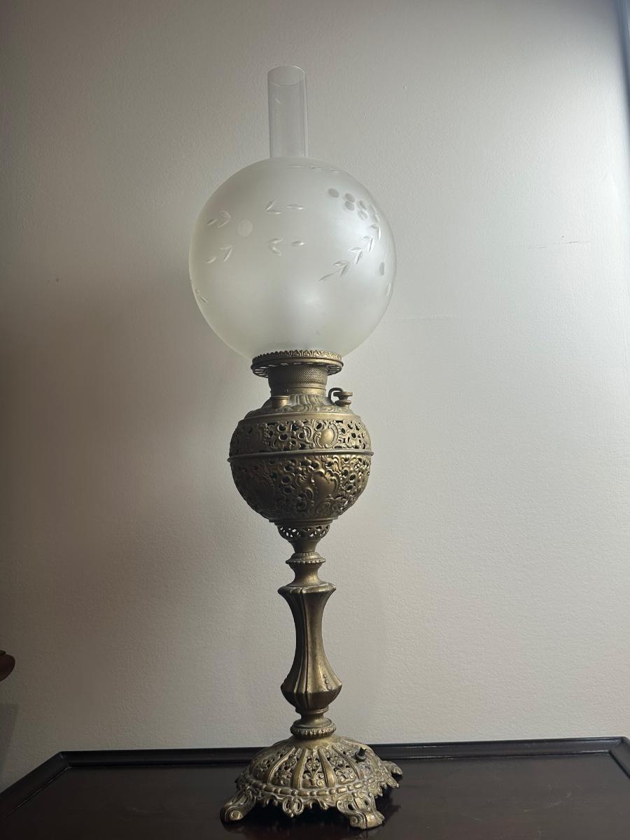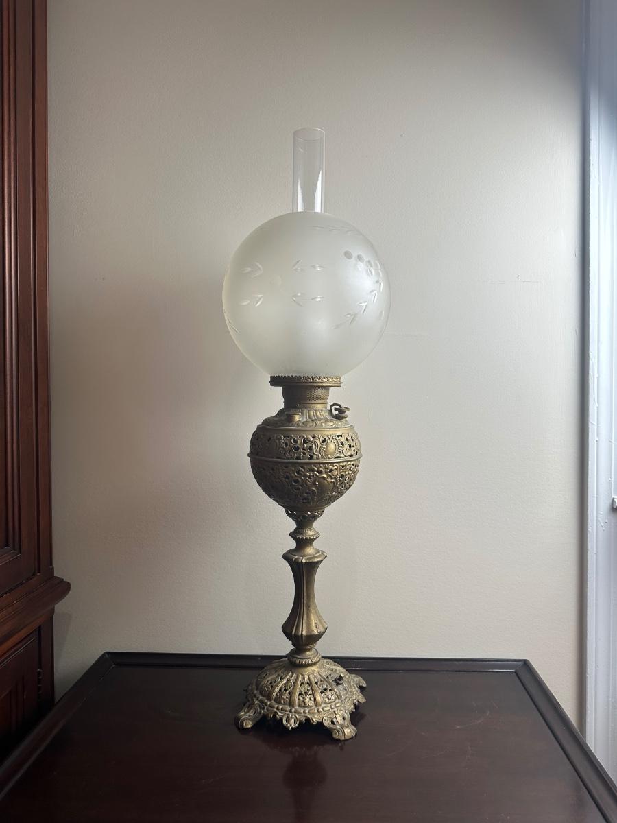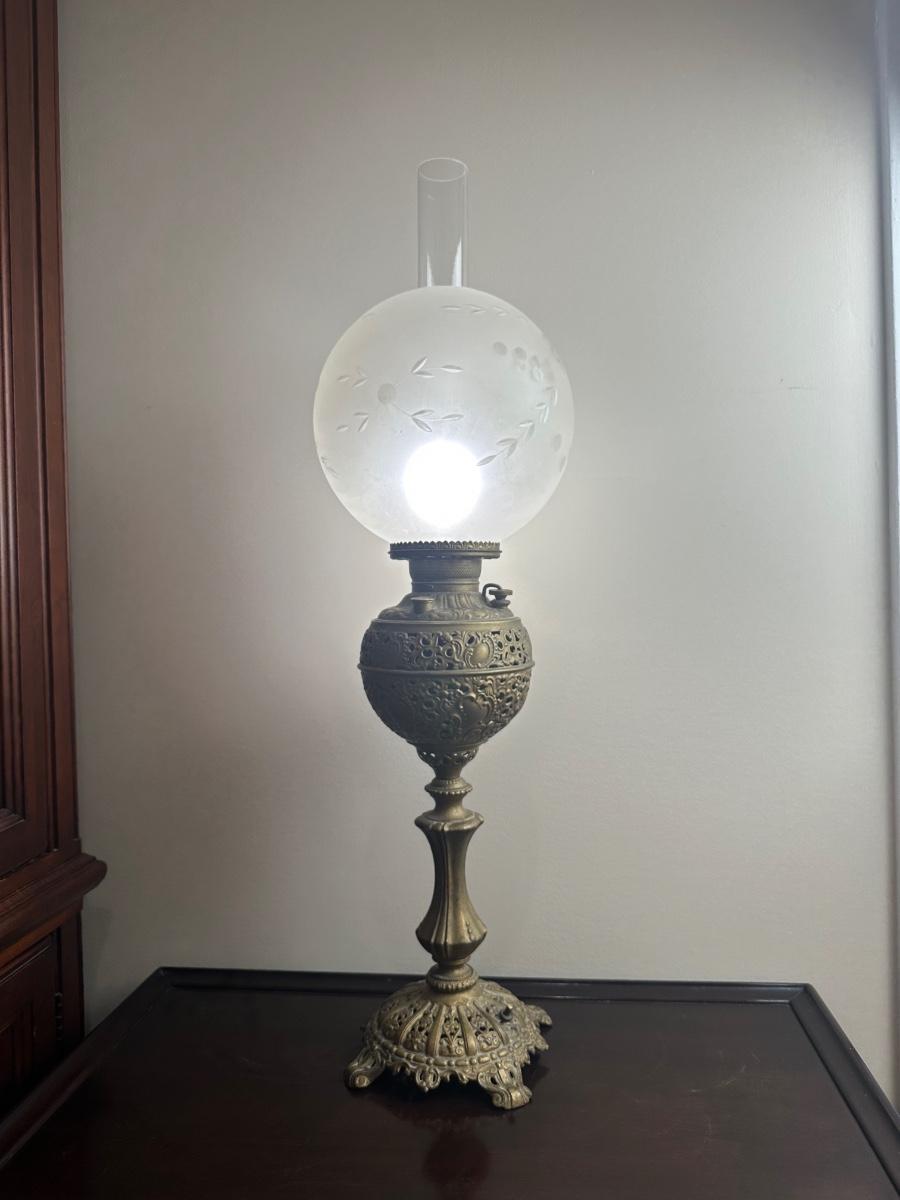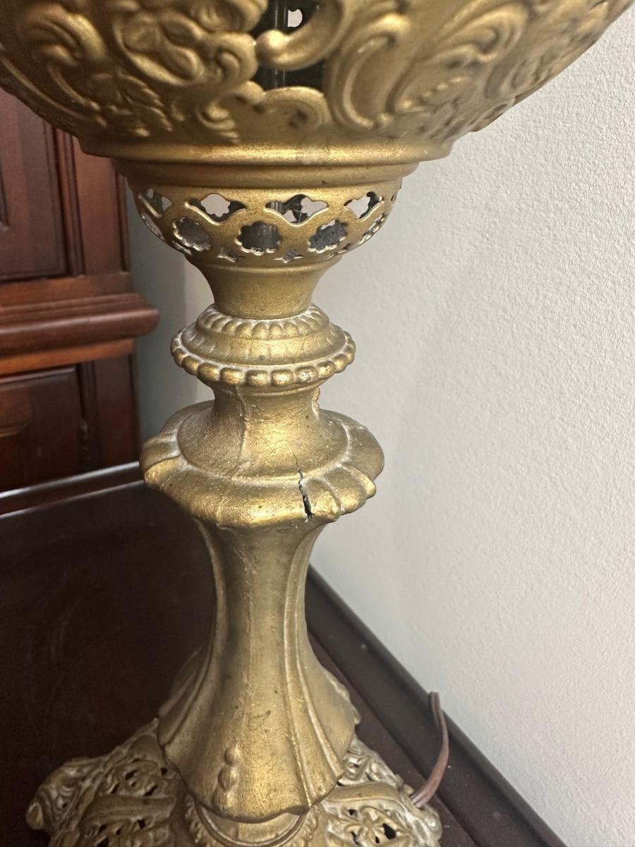 American Made Ornate Brass-Tone Table Lamp with Etched Glass Globe