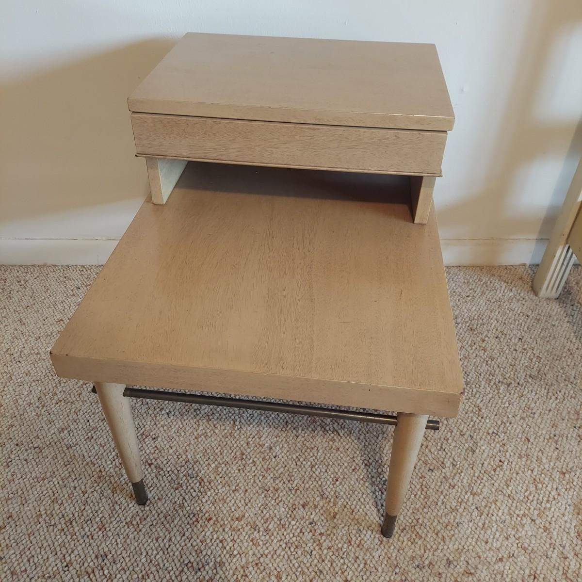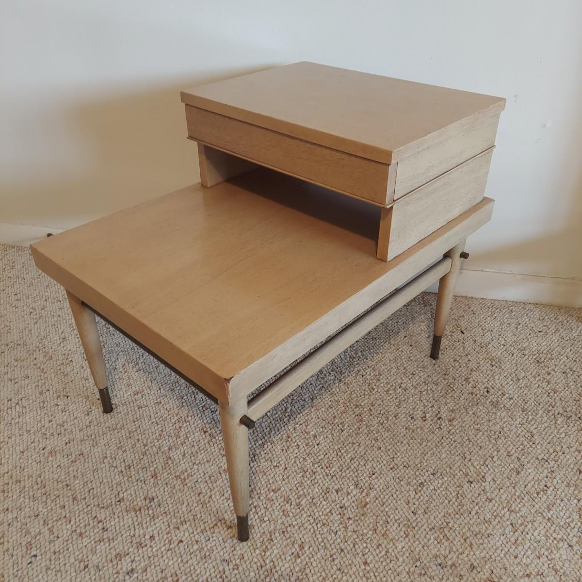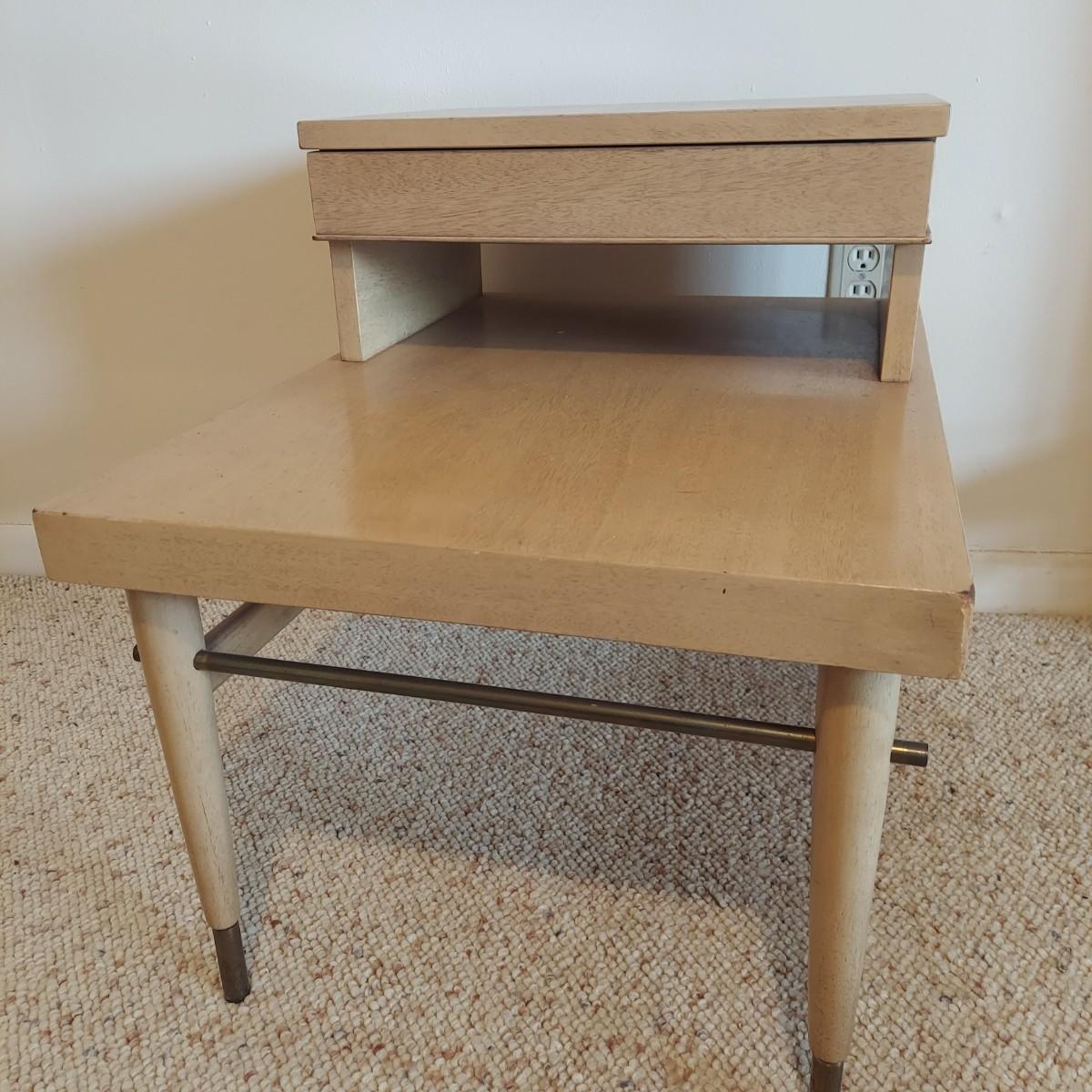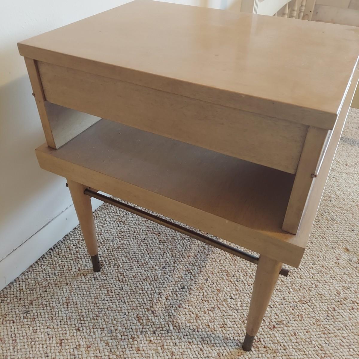 Vintage MCM nightstand by American of Martinsville. Two tier style with shallow drawer. Light blonde wood finish with brass-like accents. Measures 20” x 28” x 24"H. Please see photos for details. Local Pickup Only