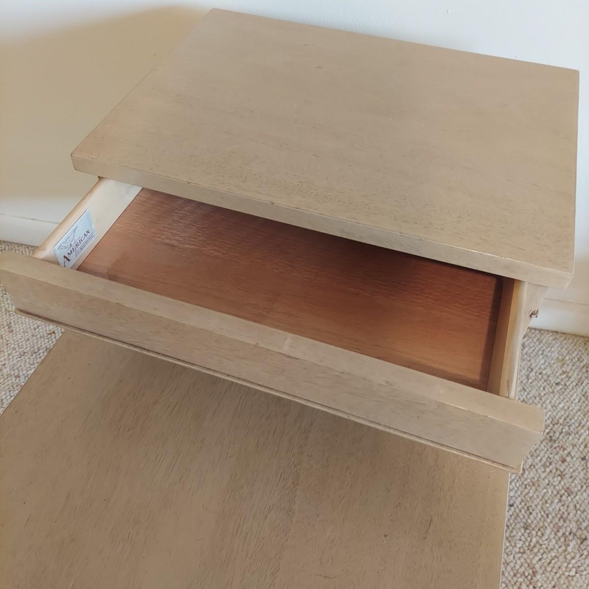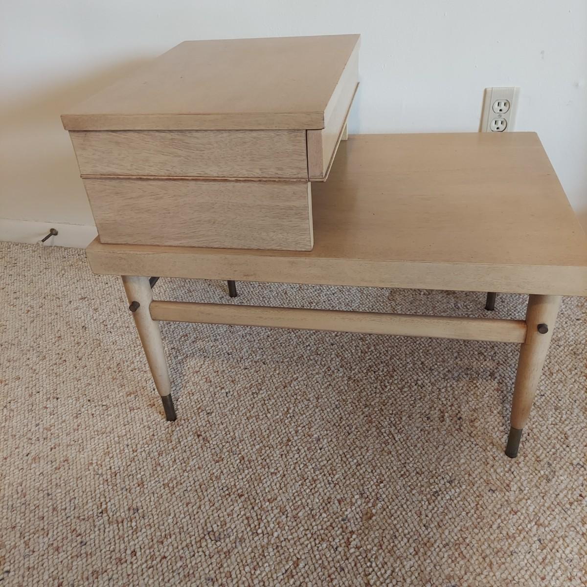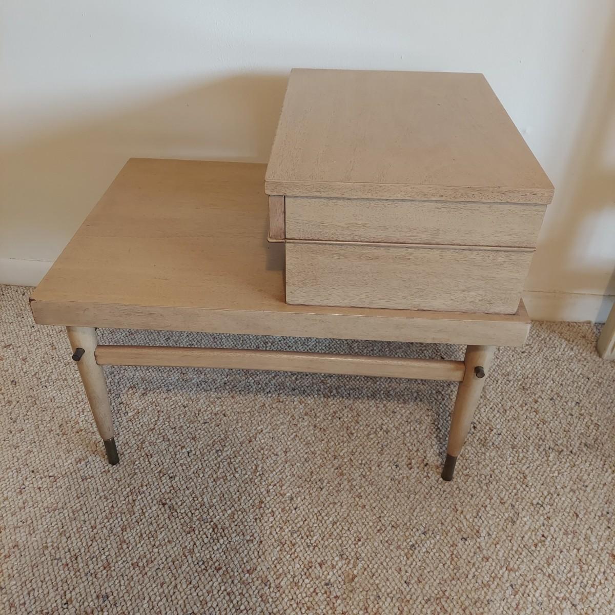 Vintage MCM nightstand by American of Martinsville. Two tier style with shallow drawer. Light blonde wood finish with brass-like accents. Measures 20” x 28” x 24"H. Please see photos for details. Local Pickup Only