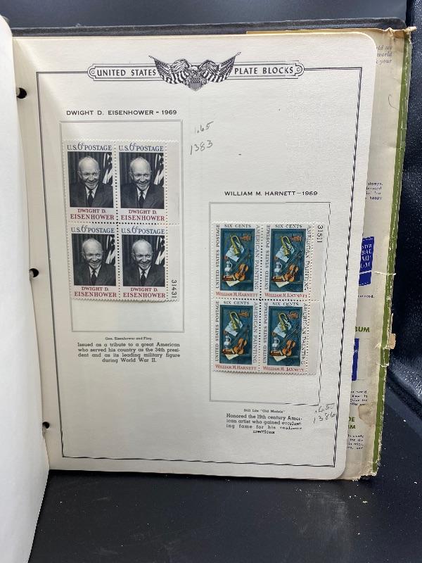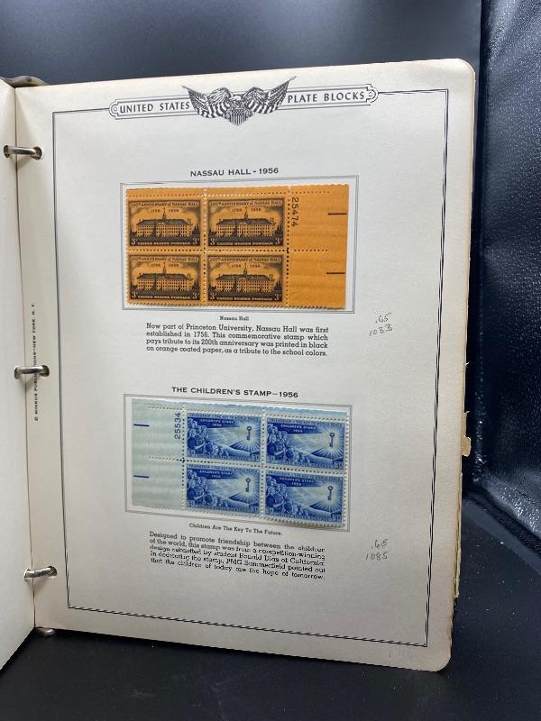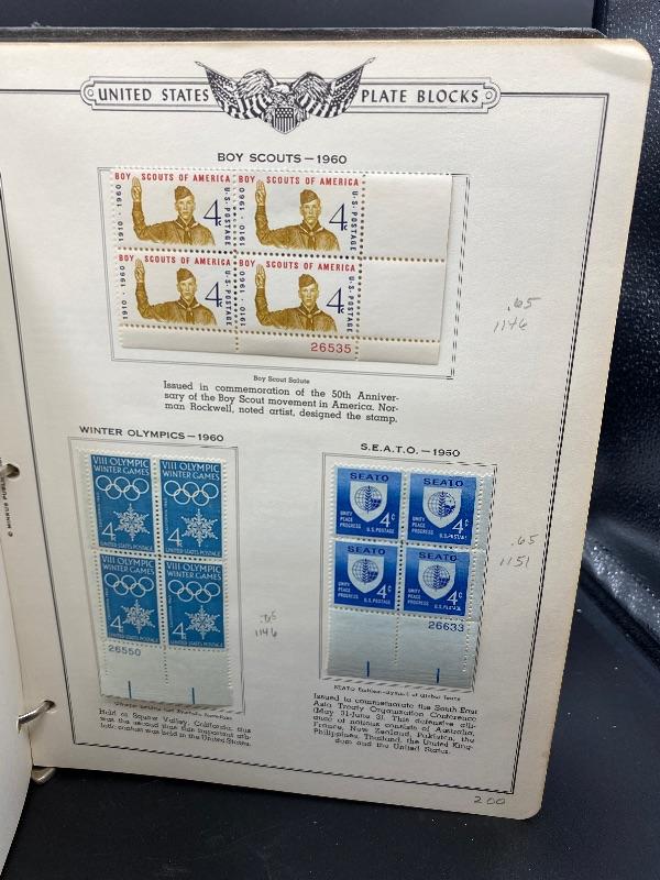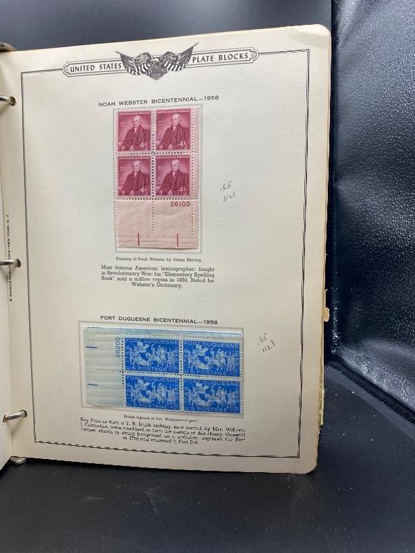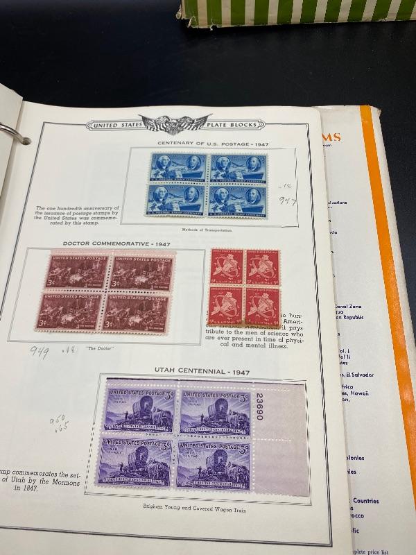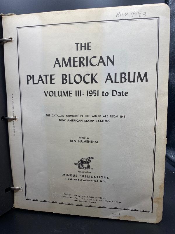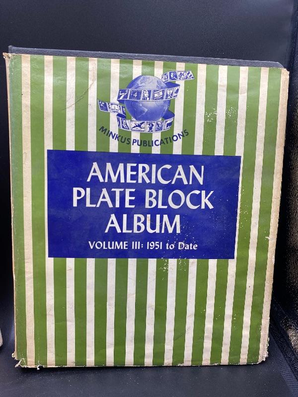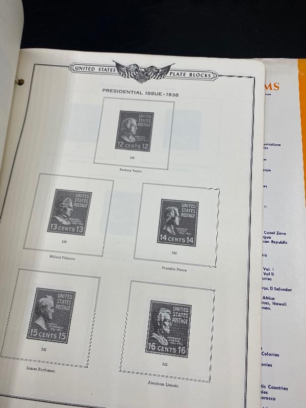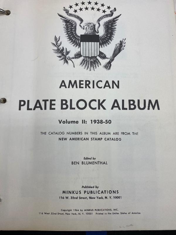 American Plate Block Albums Vol. 2 &3. Binder books with spots for specific stamps. These are United States stamps. A lot have been filled in but there are some spots still in need of the stamp. Stamps look in great condition, unused, no postmarks noticed when flipping through. Vol. 2 is 1938-1950 and Vol. 3 is 1951-1969.