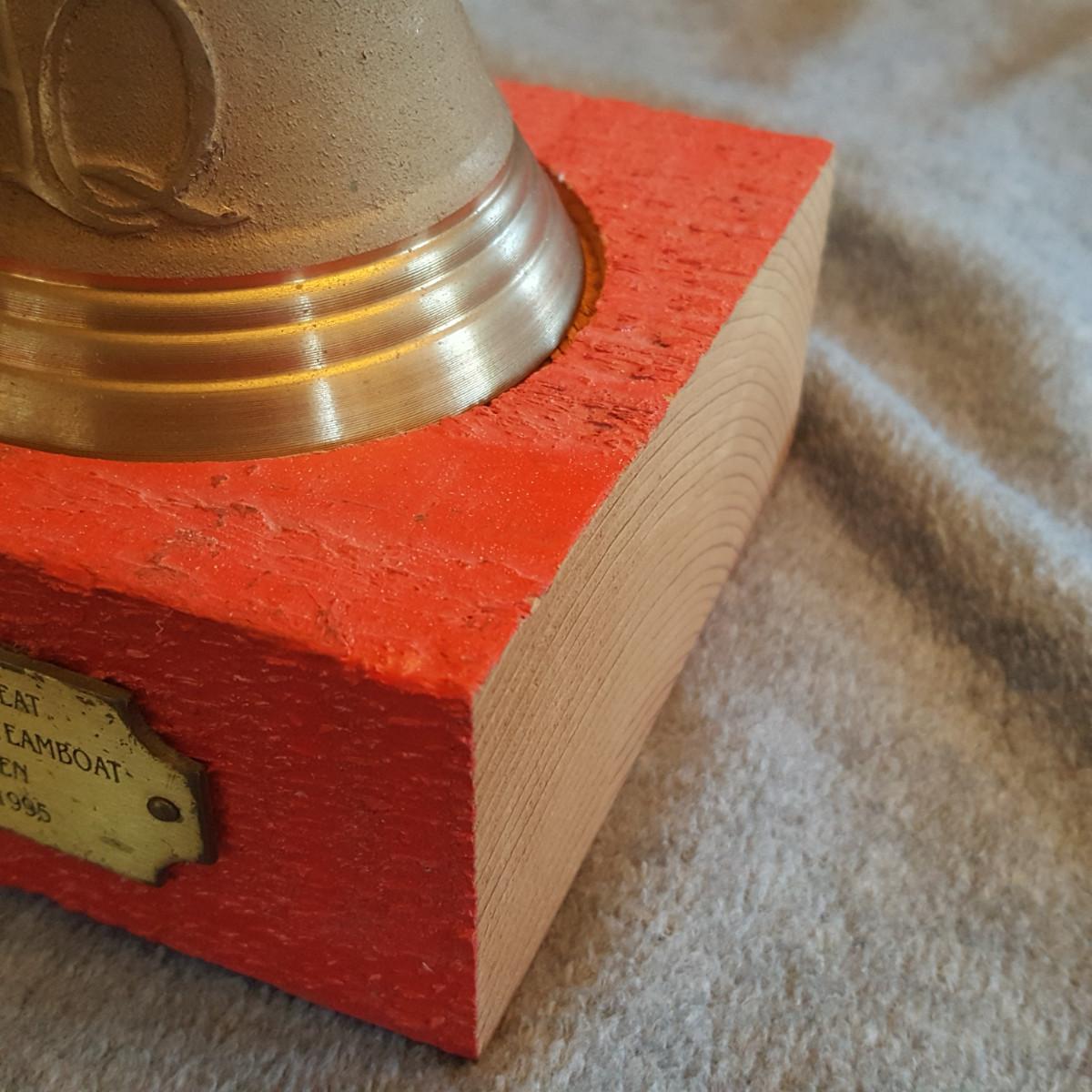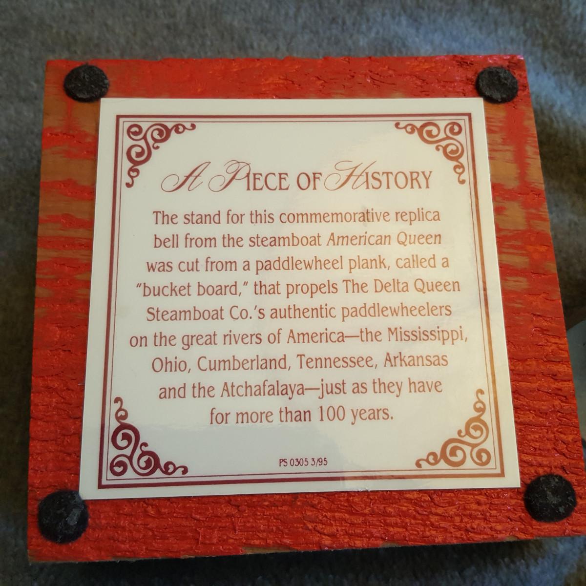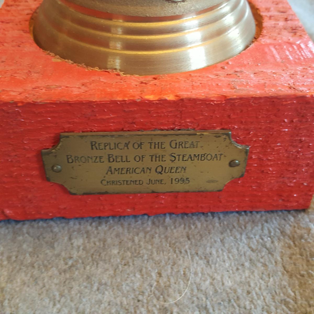 This auction lot is a for a Replica of the Great Bronze Bell of the Steamboat American Queen. This American Queen Steamboat Bell Replica was made to commemorate the christening of the steamboat in June of 1995. The bell sits in and upon a stand made a piece of wood cut from an authentic paddlewheel plank (or bucket board) from the Delta Queen Steamboat Companies stockpile. A real piece of Americana riverboat history. The bell is heavy for its size and rings clear. It measures about about 3.5-inches tall and 3.5-inches wide at the bell bottom. The stand measures about 4.5-inches square and 2-inches tall. Comes with the two postcards shown in photos.