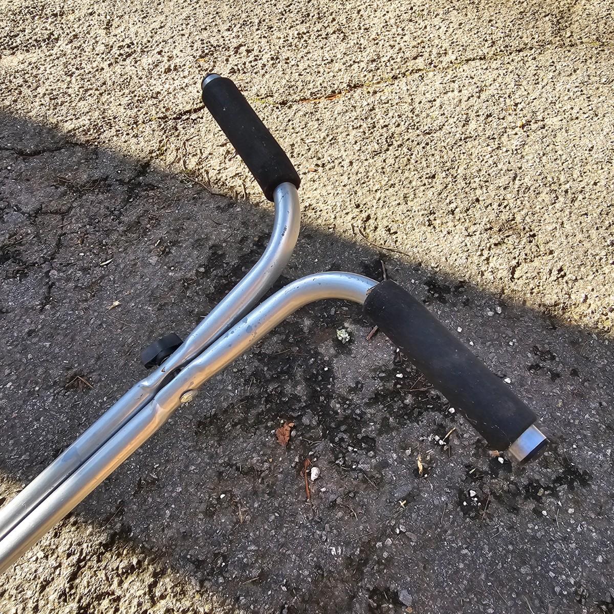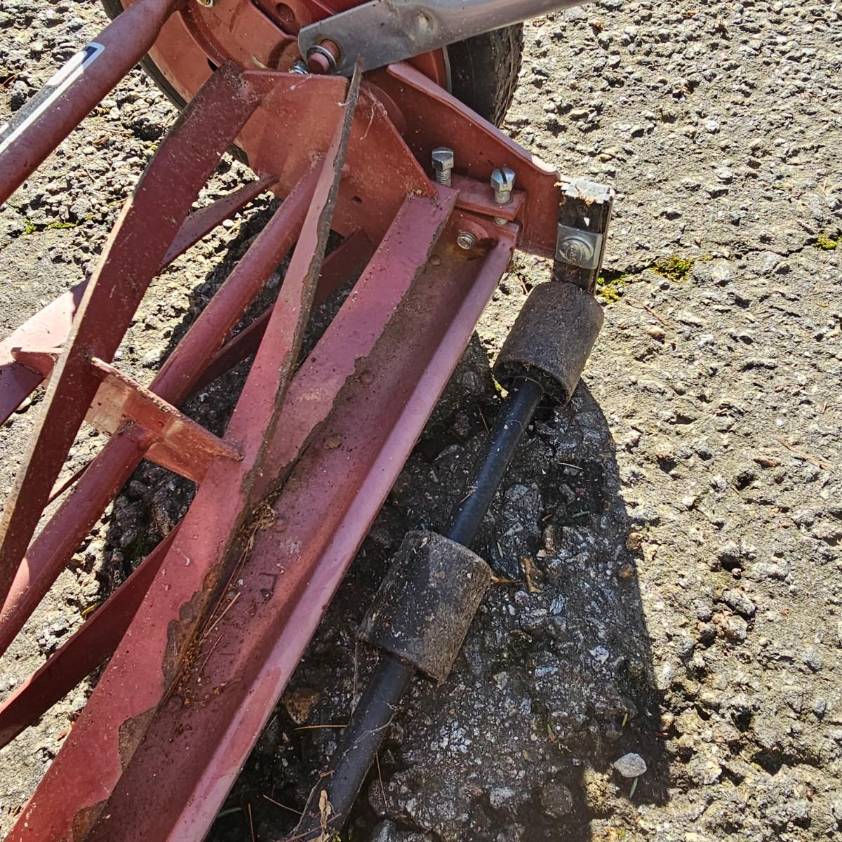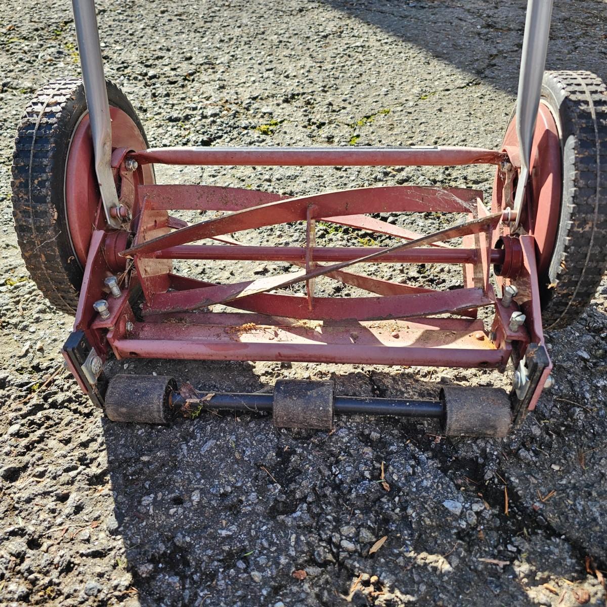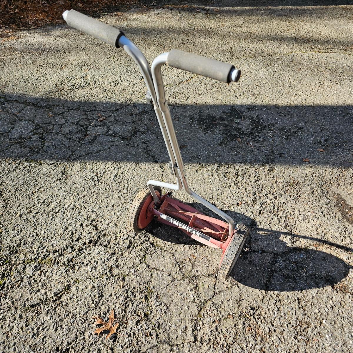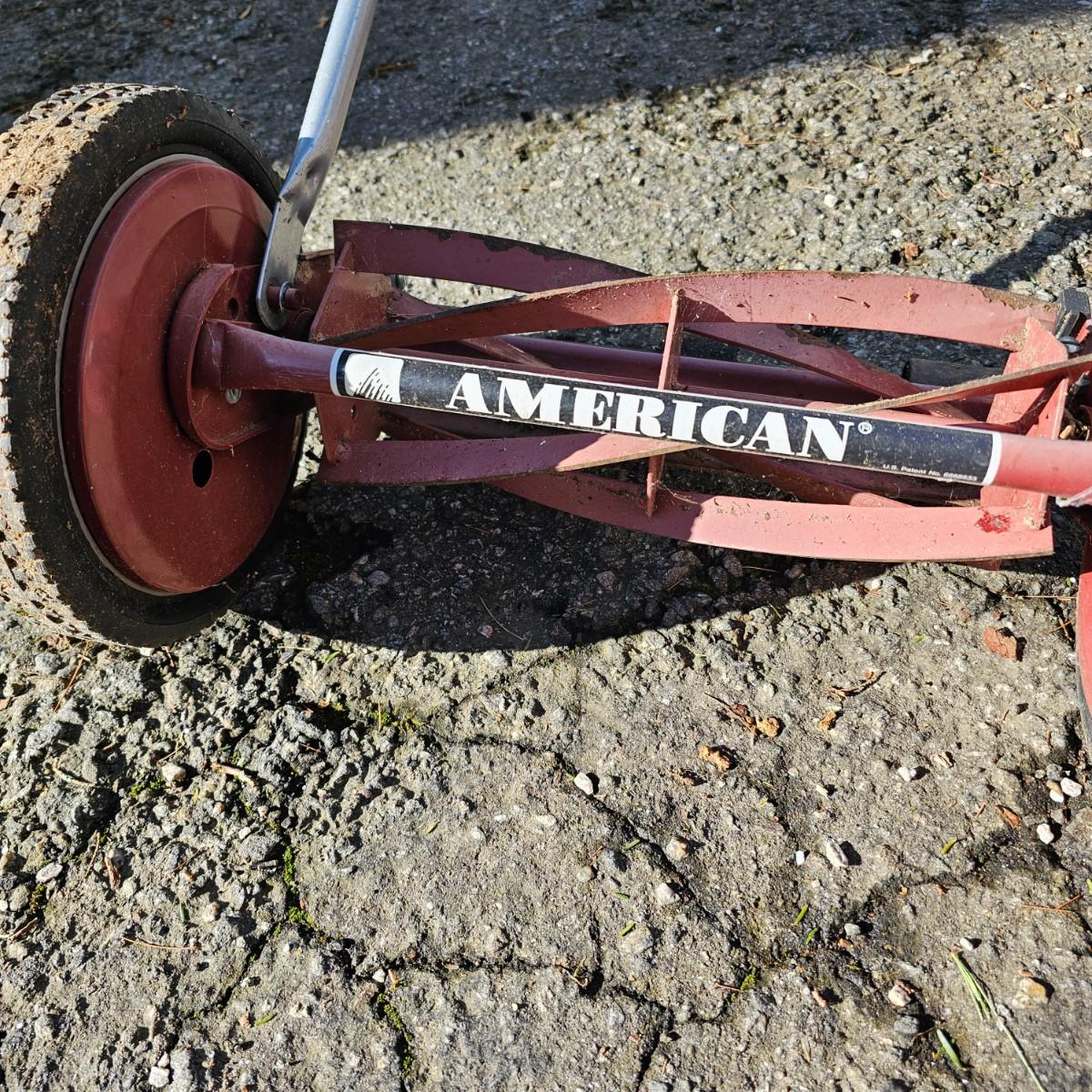 Old style push reel mower by American, this piece has steel frame and cutters, aluminum handles and foam rubber handgrips. Mower is 20" x 12" x 46"H, has 13"wide cut. Solid rubber tires. See photos for details. Local pickup only.