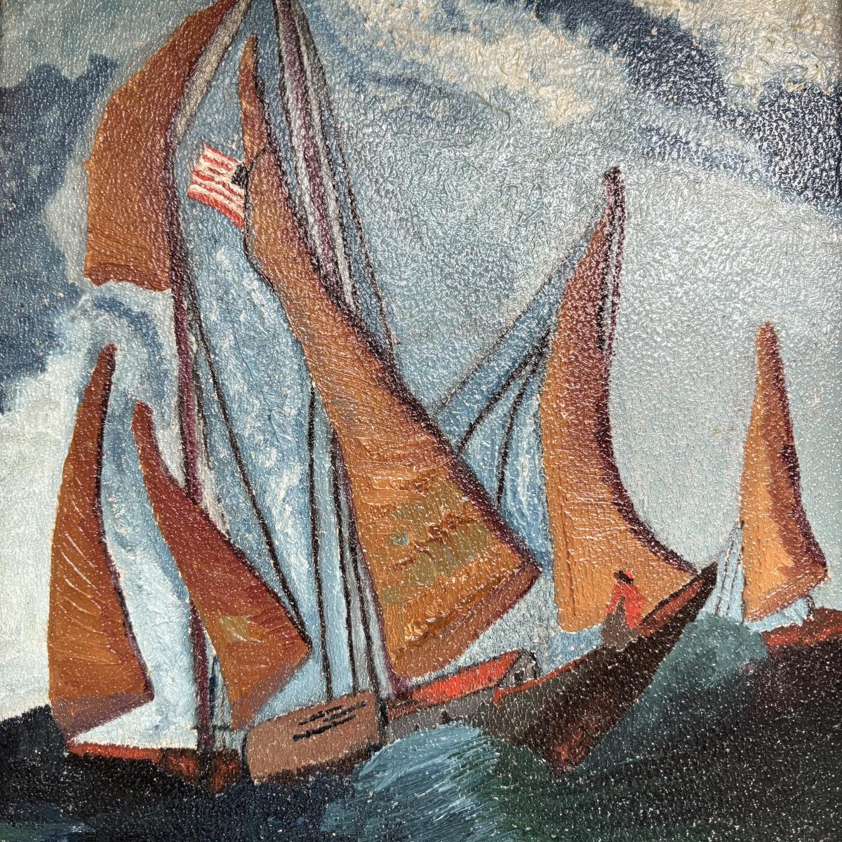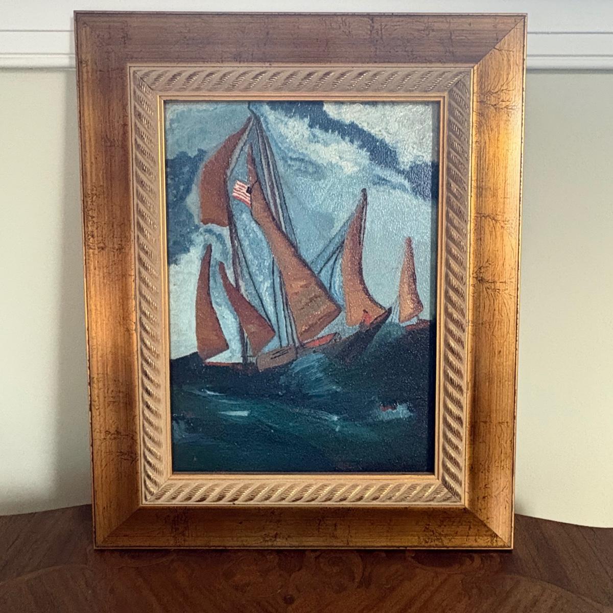Charming painting of sail boats, possibly oil. Signature present but not legible (see picture). Wood frame with antiqued effect. Not under glass. Piece measures 13.5”x 17”H. Shipping available.