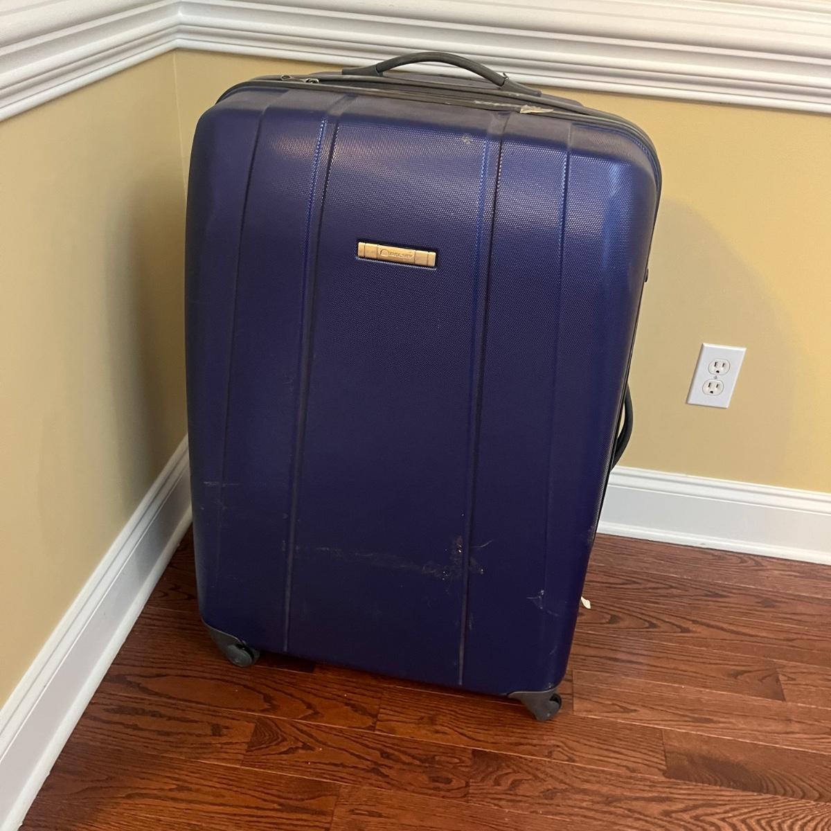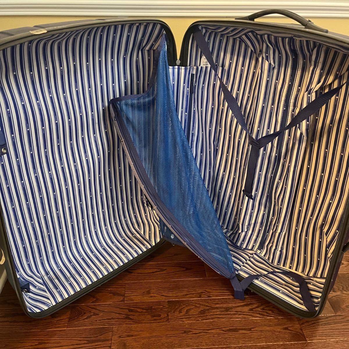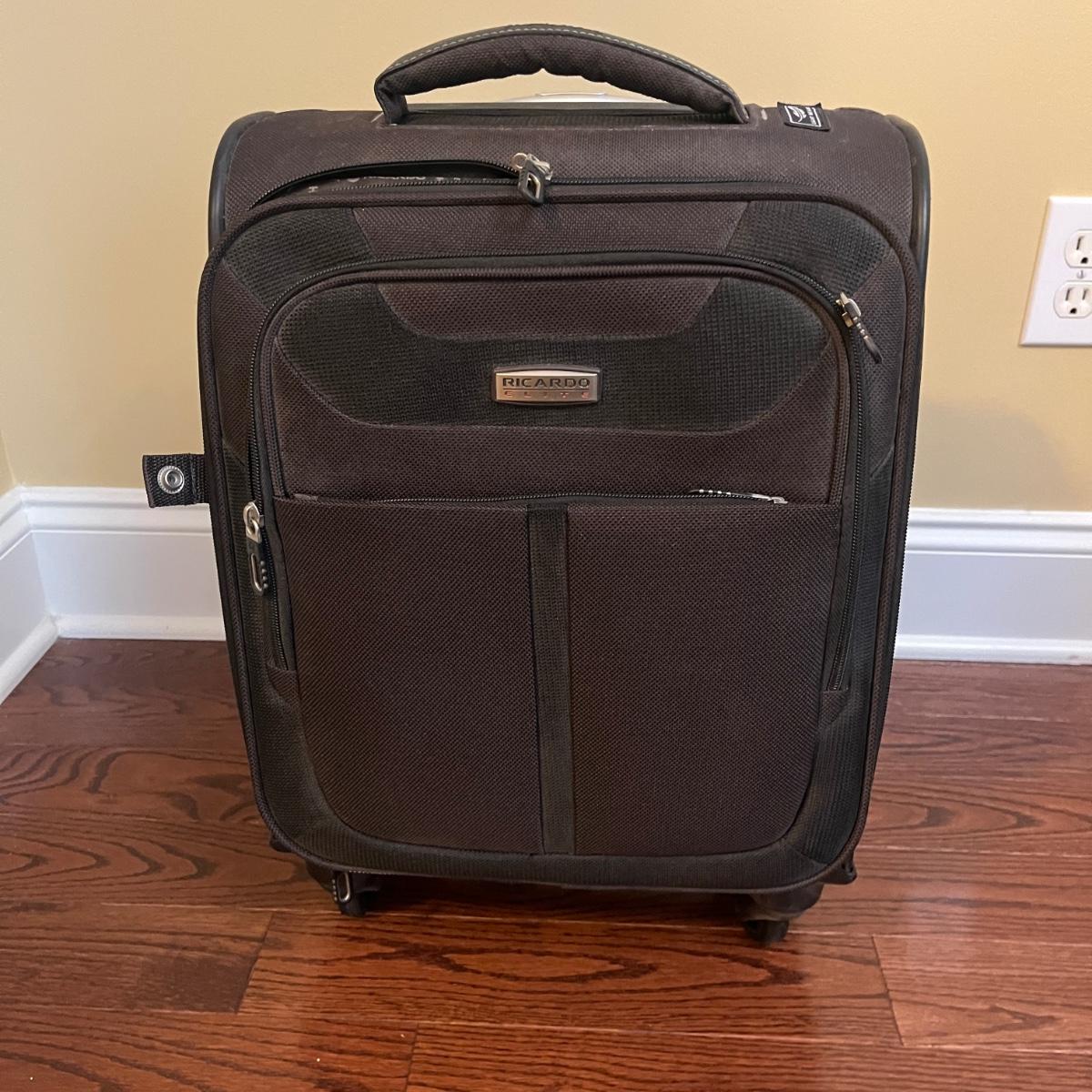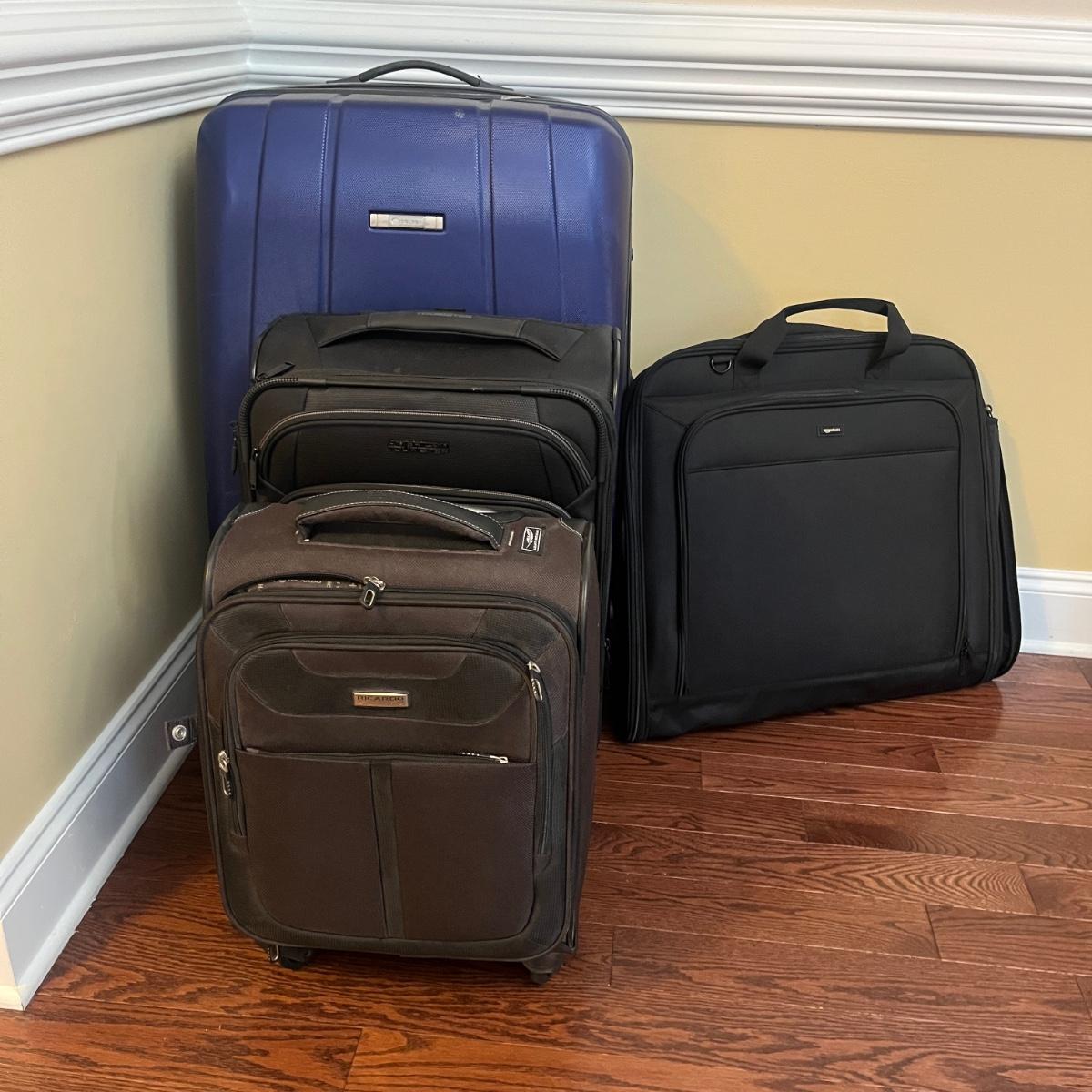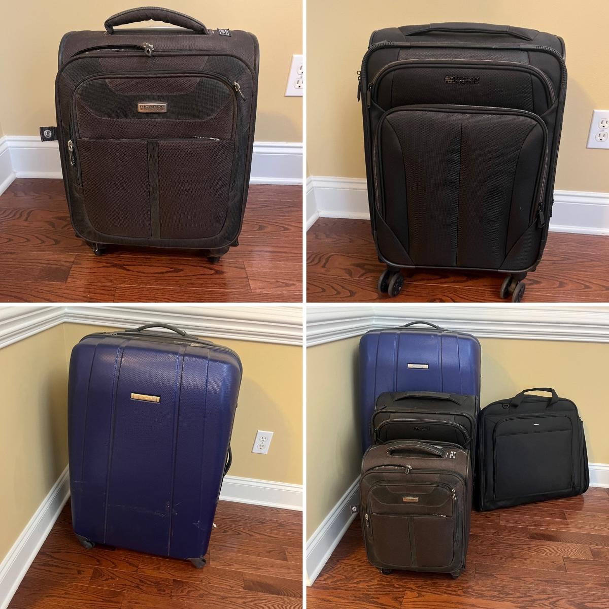 Lot includes a American Tourister soft sided wheeled bag that measures 14” x 9” x 23”H, Delsey hard sided wheeled luggage that measures 20” x 12” x 31”H, Ricardo soft sided wheeled bag that measures 13” x 8” x 20”H and a Amazon Basics garment bag.
