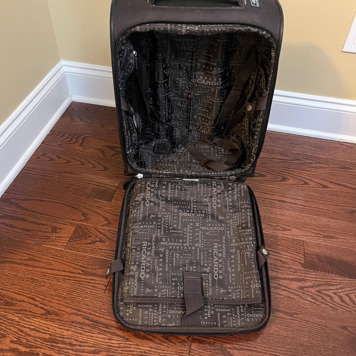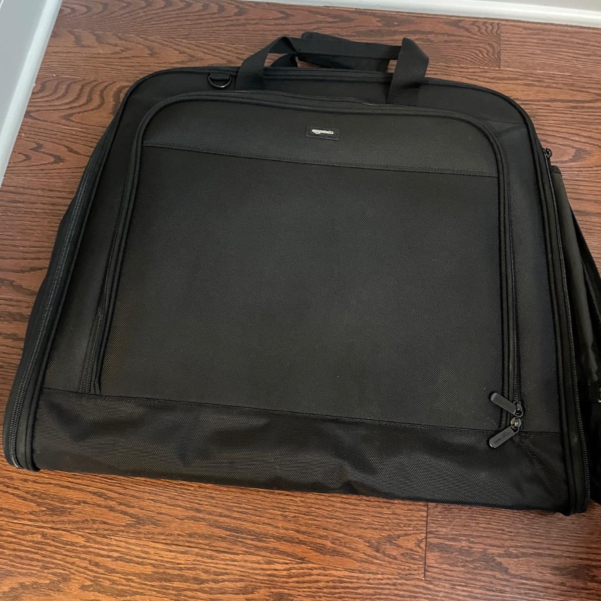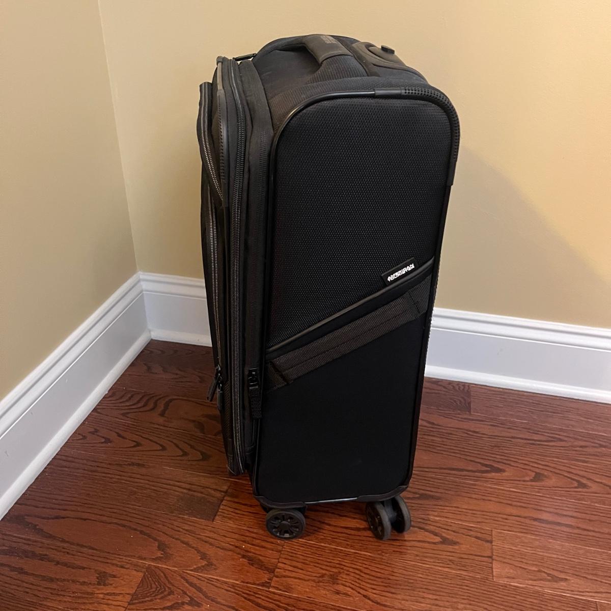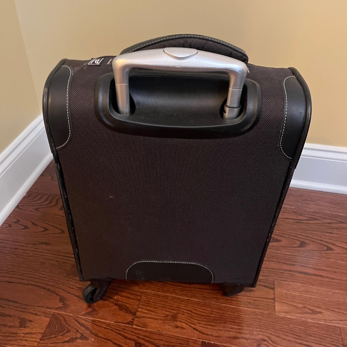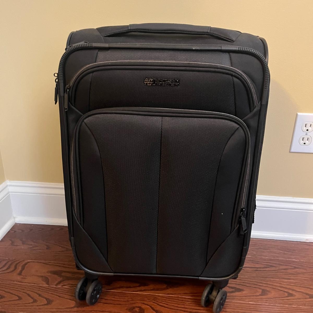 Lot includes a American Tourister soft sided wheeled bag that measures 14” x 9” x 23”H, Delsey hard sided wheeled luggage that measures 20” x 12” x 31”H, Ricardo soft sided wheeled bag that measures 13” x 8” x 20”H and a Amazon Basics garment bag.