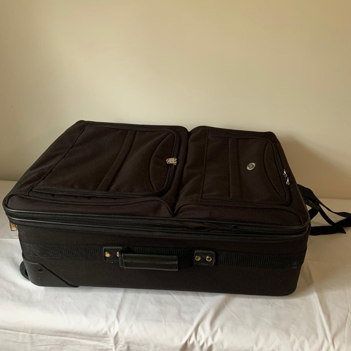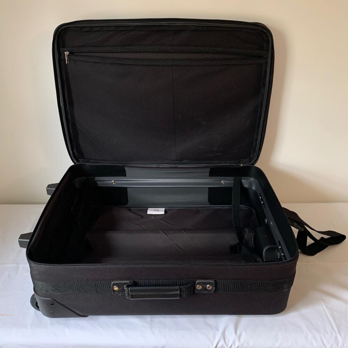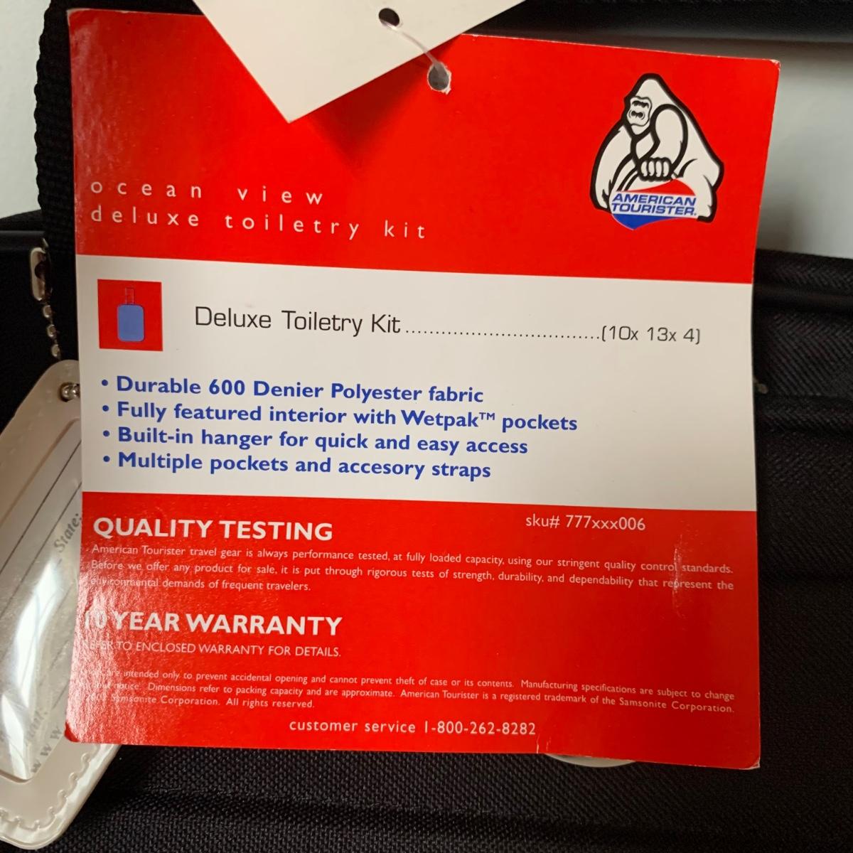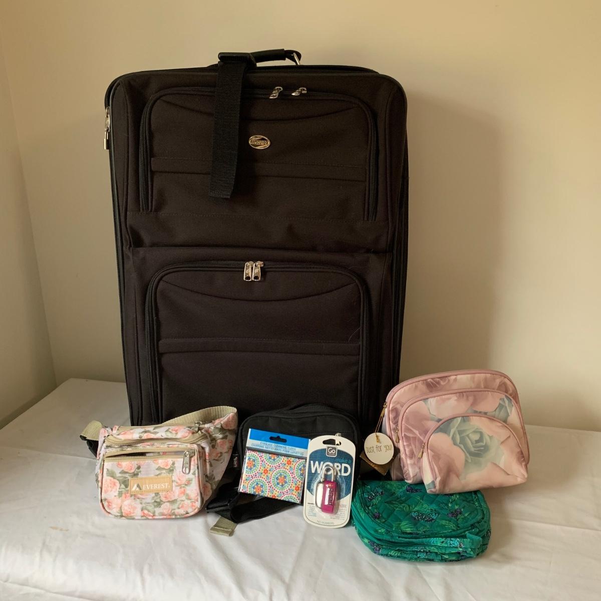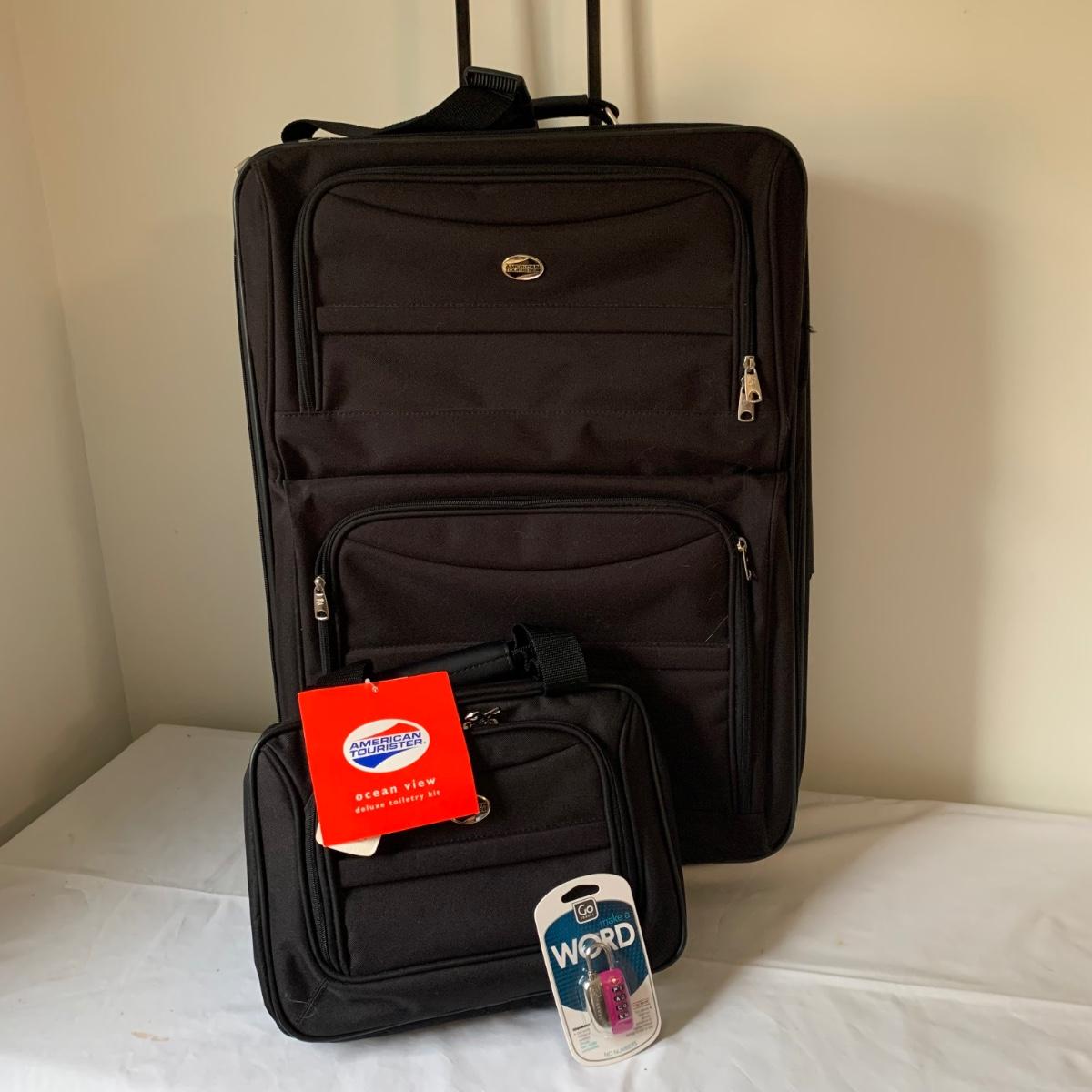 Black expandable American Tourister suitcase on wheels with a retractable handle. In this lot there is also a brand new American Tourister deluxe toiletry kit, a three piece cosmetic bag set, travel lock, and eyeglass cleaning cloth, as well as an Everest and a Totes brand fanny-pack and a small quilted bag. Everything is in very good to like new condition. The suitcase is approximately 19” x 10” x 27”. There is a lock on the suitcase for which we do not have the key.