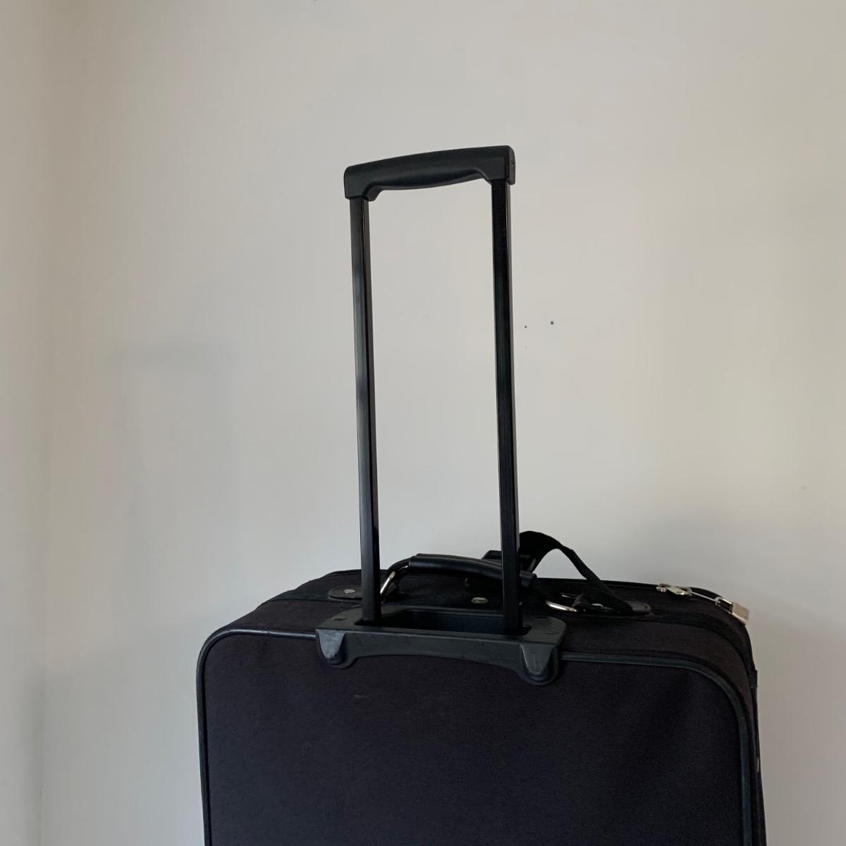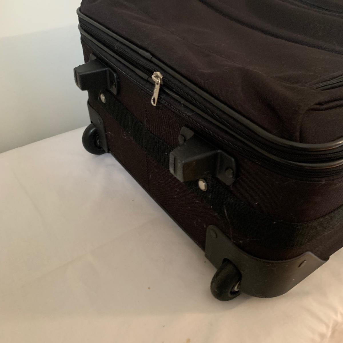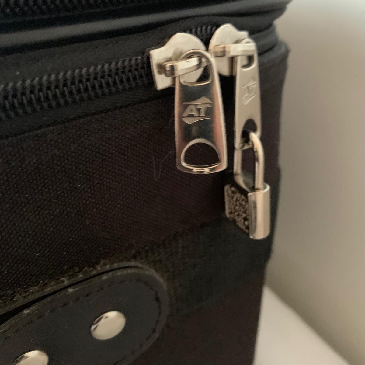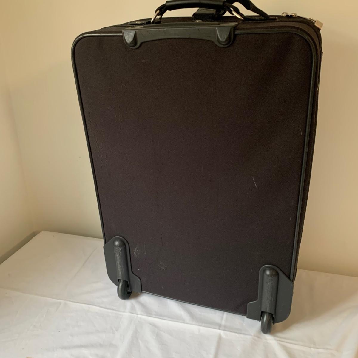 Black expandable American Tourister suitcase on wheels with a retractable handle. In this lot there is also a brand new American Tourister deluxe toiletry kit, a three piece cosmetic bag set, travel lock, and eyeglass cleaning cloth, as well as an Everest and a Totes brand fanny-pack and a small quilted bag. Everything is in very good to like new condition. The suitcase is approximately 19” x 10” x 27”. There is a lock on the suitcase for which we do not have the key.