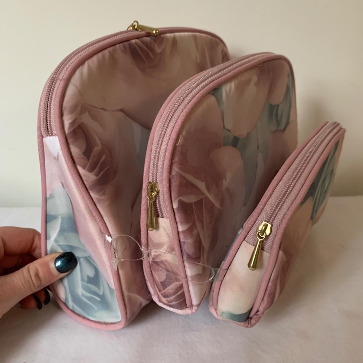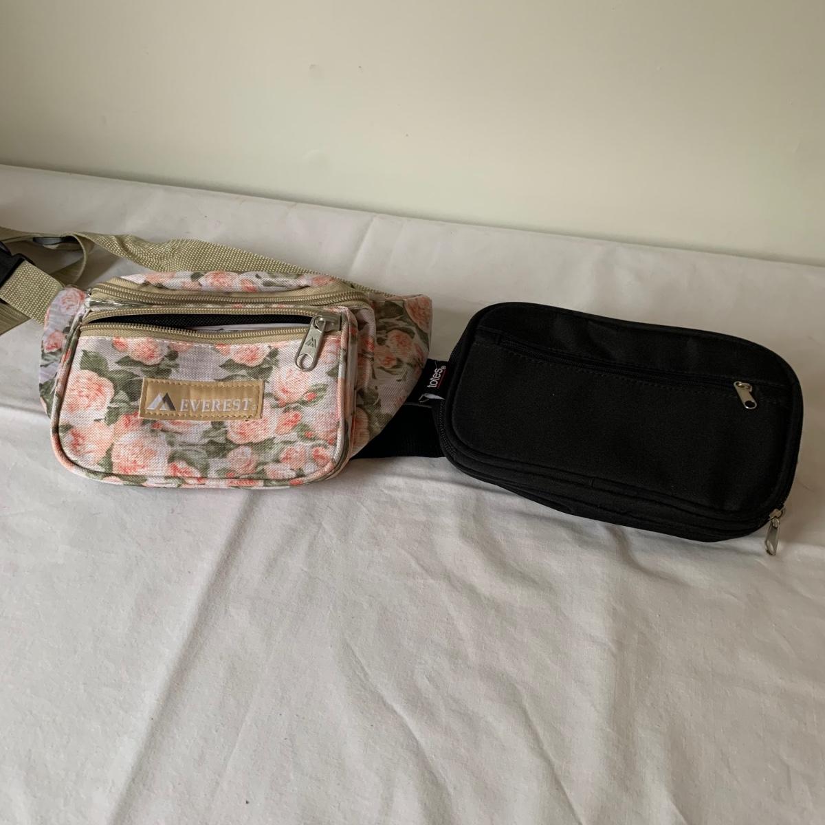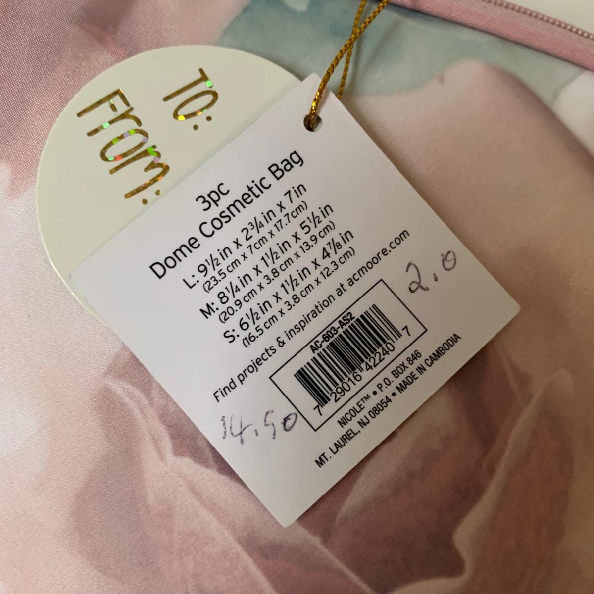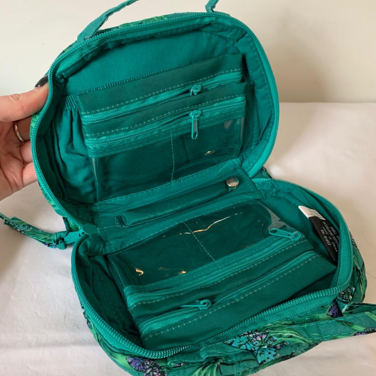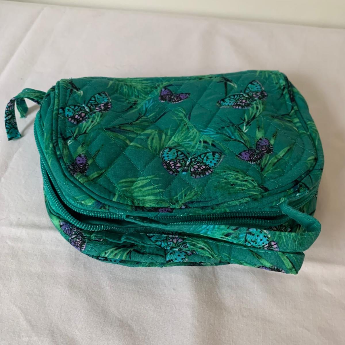 Black expandable American Tourister suitcase on wheels with a retractable handle. In this lot there is also a brand new American Tourister deluxe toiletry kit, a three piece cosmetic bag set, travel lock, and eyeglass cleaning cloth, as well as an Everest and a Totes brand fanny-pack and a small quilted bag. Everything is in very good to like new condition. The suitcase is approximately 19” x 10” x 27”. There is a lock on the suitcase for which we do not have the key.