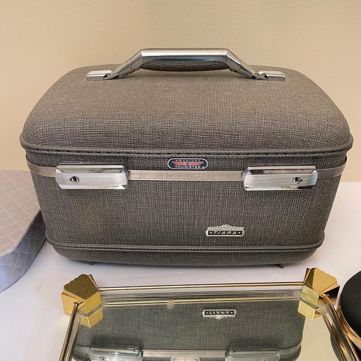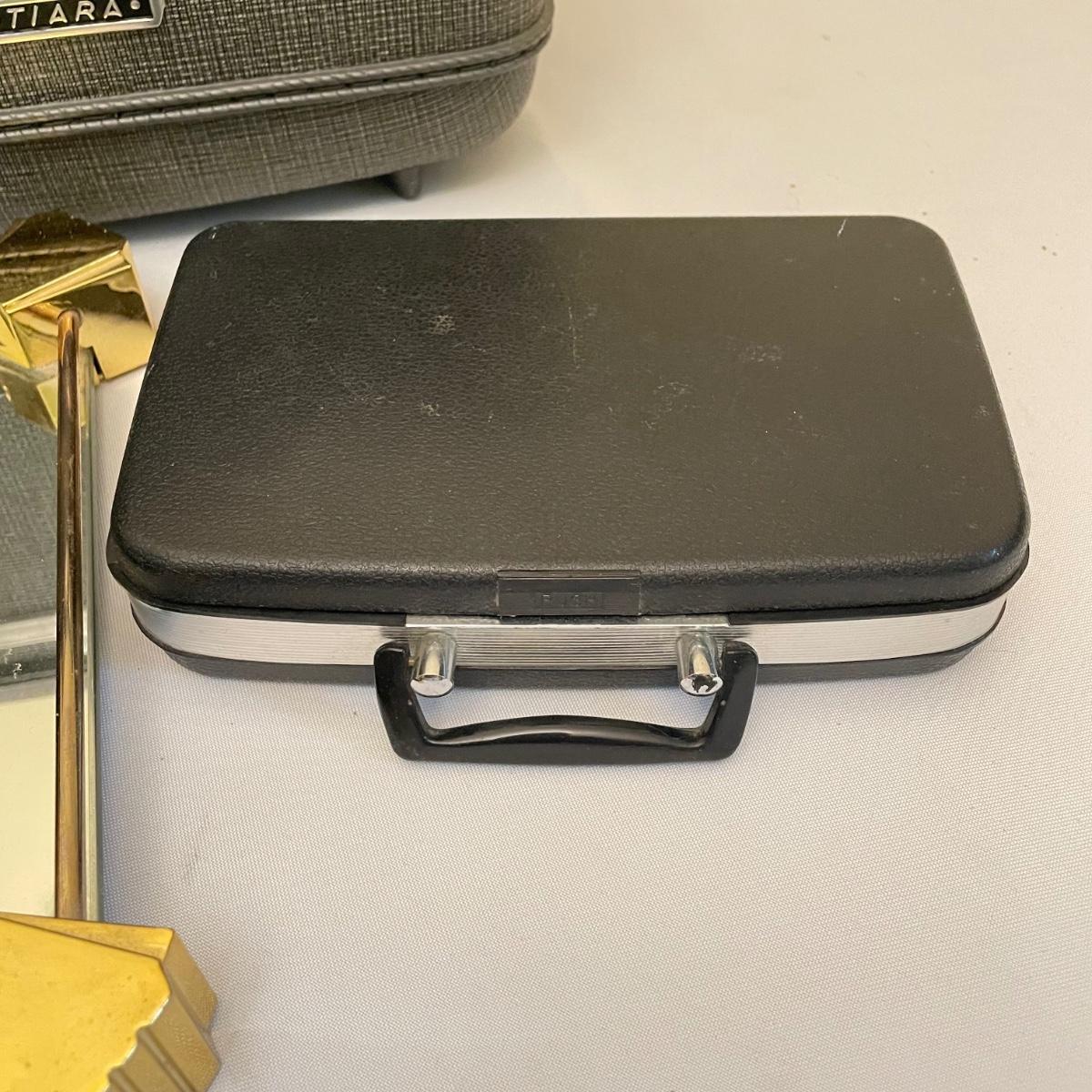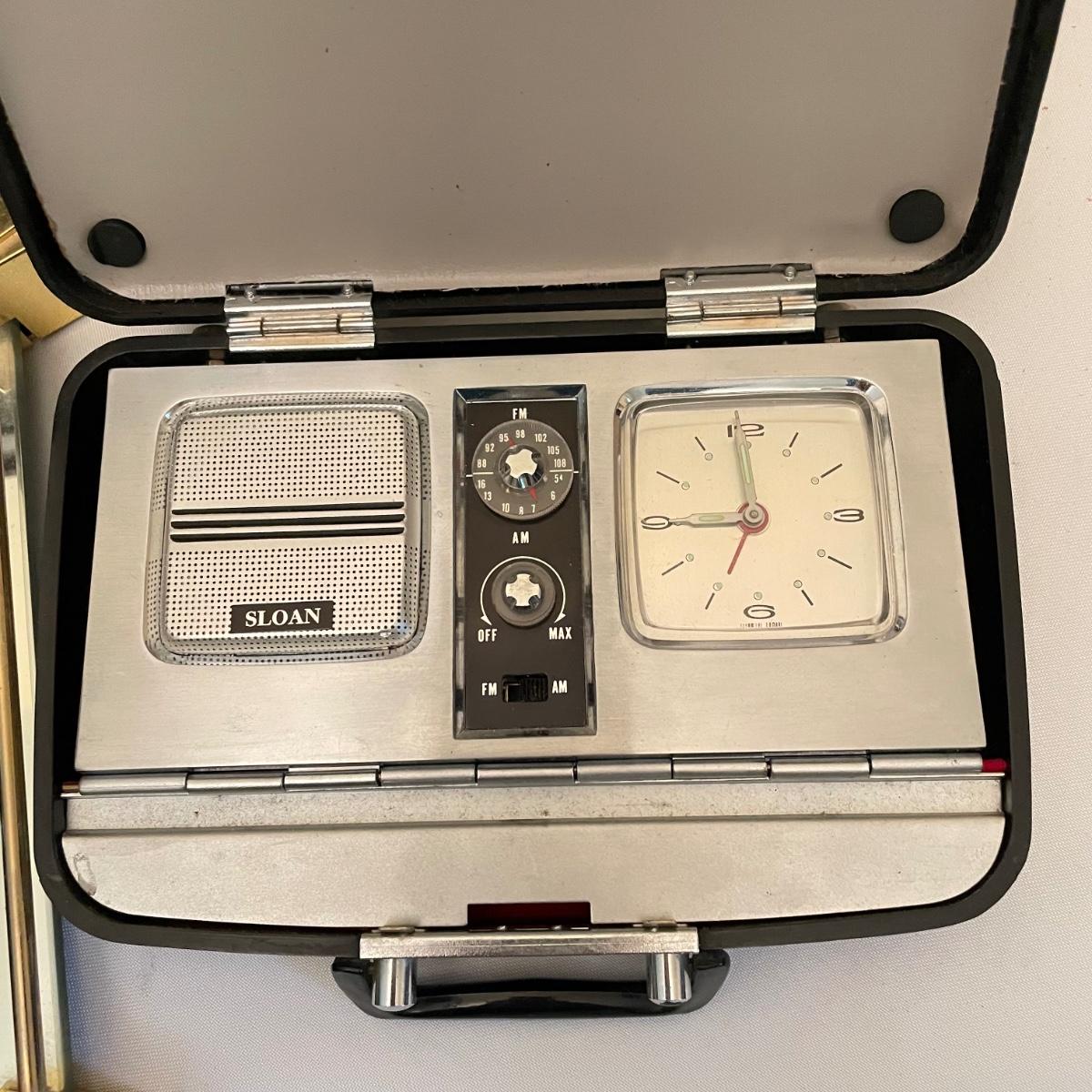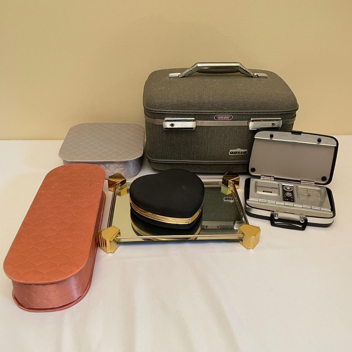 A fun, vintage lot featuring a Sloan travel clock/radio. The radio turned on when prompted, the clock has not been tested. Nice looking American Tourister Tiara hard sided case with two keys, three cloth covered vanity boxes, the heart shape has compartments for jewelry. Lot also features a gold accented vanity mirror/tray. The American Tourister case measures 14.5” x 9.5” x 8”H, it has a product spill on the lid, see photos. Shipping available.