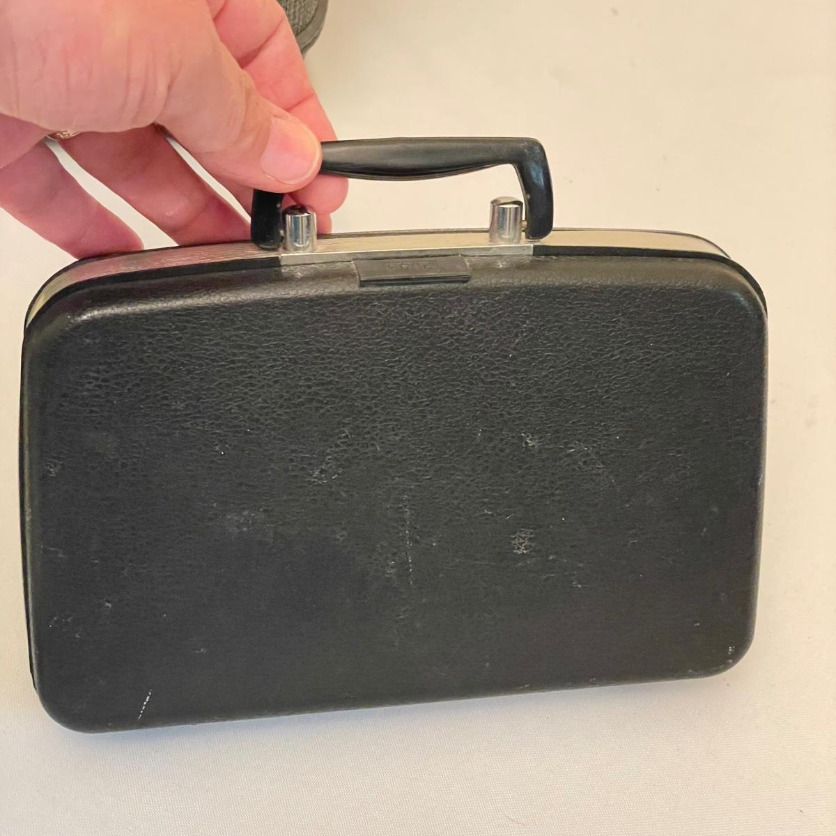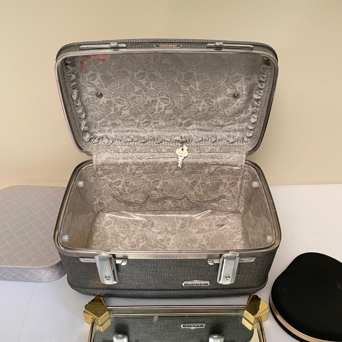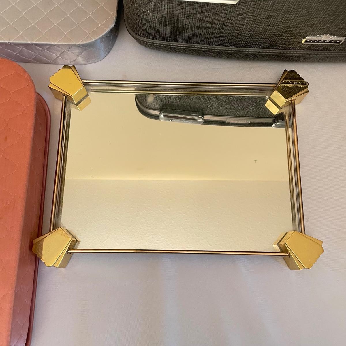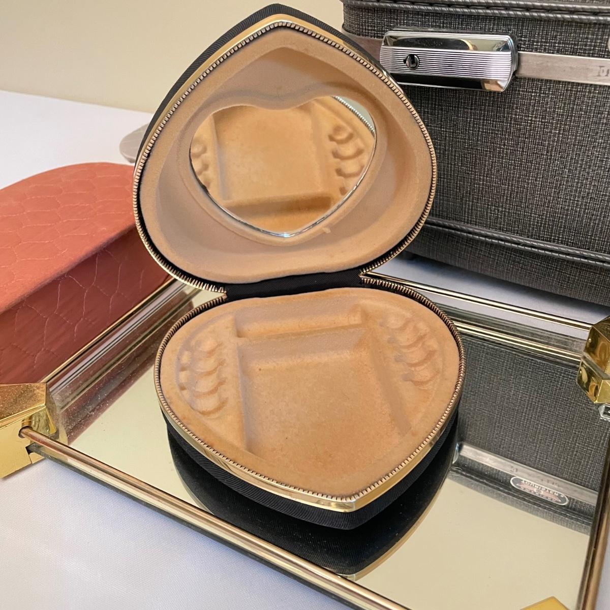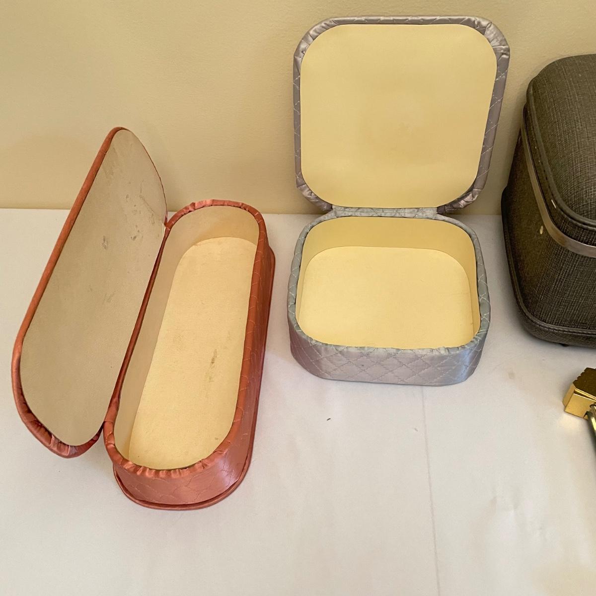 A fun, vintage lot featuring a Sloan travel clock/radio. The radio turned on when prompted, the clock has not been tested. Nice looking American Tourister Tiara hard sided case with two keys, three cloth covered vanity boxes, the heart shape has compartments for jewelry. Lot also features a gold accented vanity mirror/tray. The American Tourister case measures 14.5” x 9.5” x 8”H, it has a product spill on the lid, see photos. Shipping available.