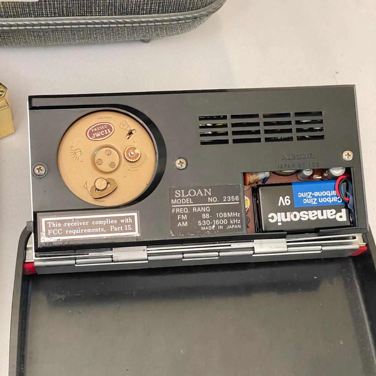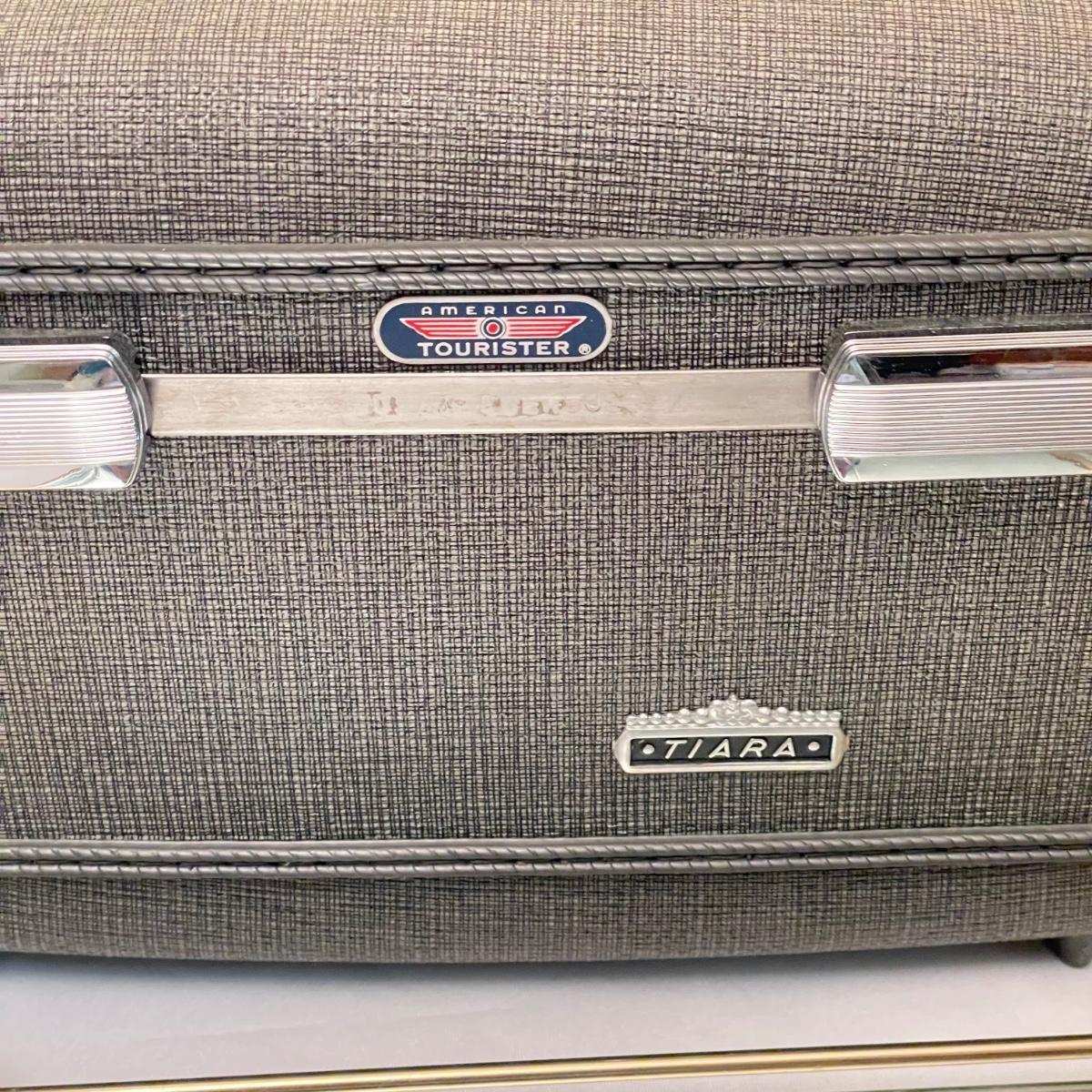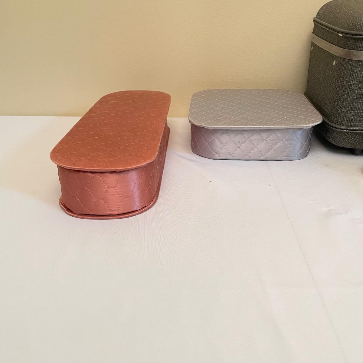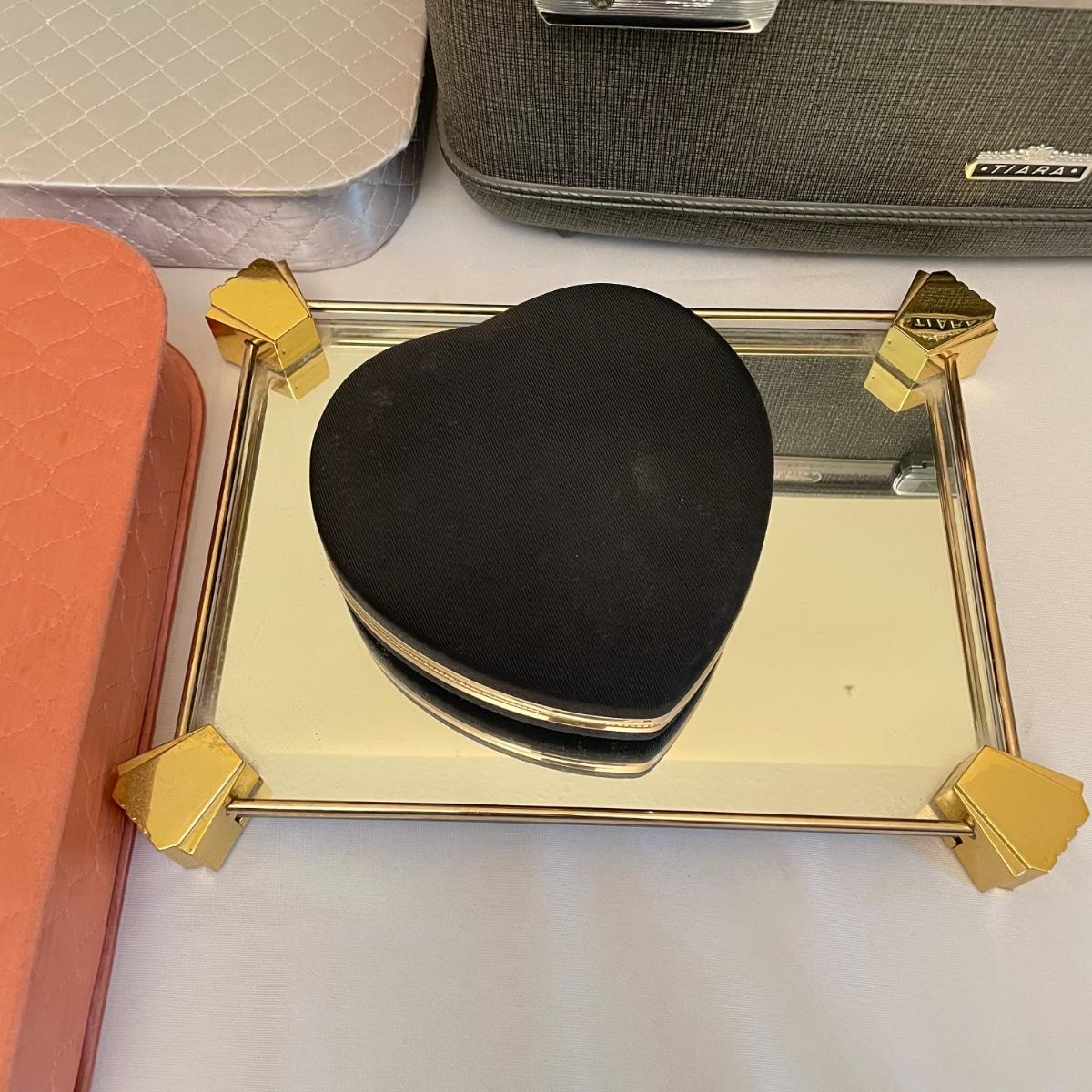 A fun, vintage lot featuring a Sloan travel clock/radio. The radio turned on when prompted, the clock has not been tested. Nice looking American Tourister Tiara hard sided case with two keys, three cloth covered vanity boxes, the heart shape has compartments for jewelry. Lot also features a gold accented vanity mirror/tray. The American Tourister case measures 14.5” x 9.5” x 8”H, it has a product spill on the lid, see photos. Shipping available.