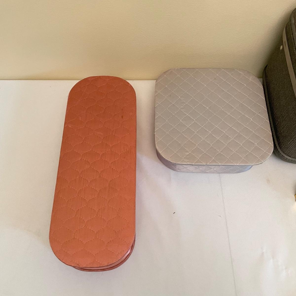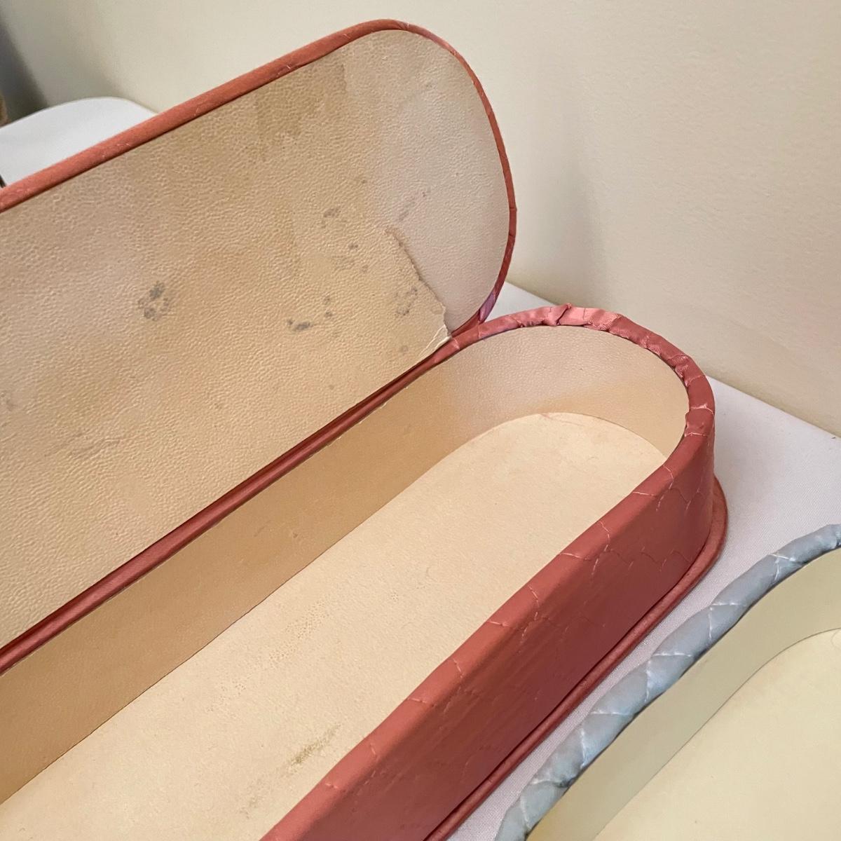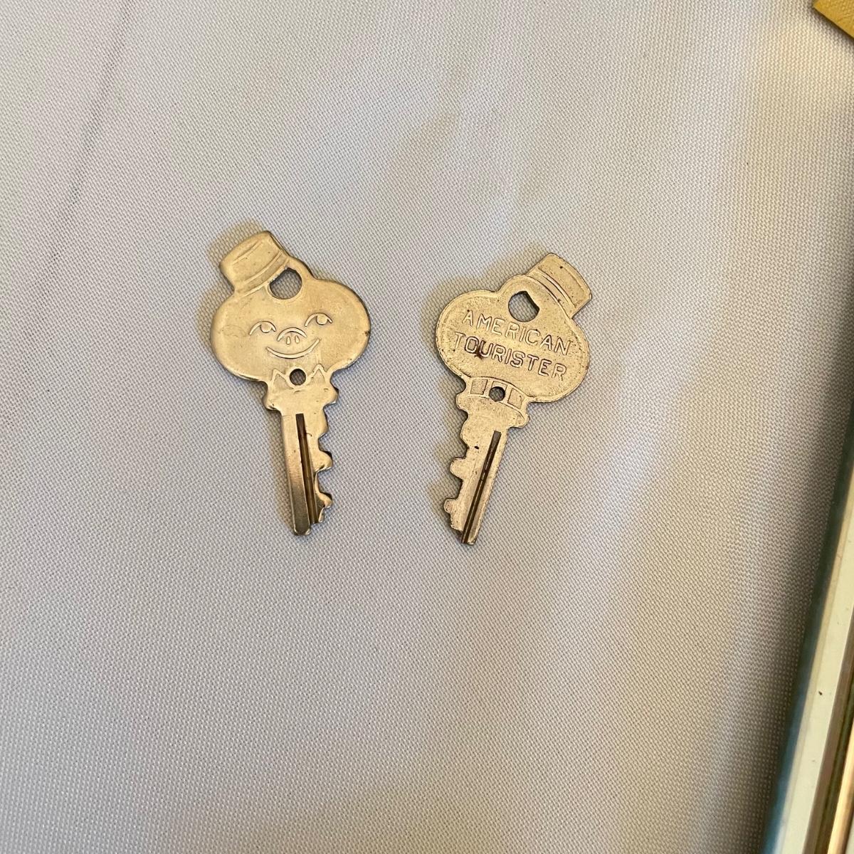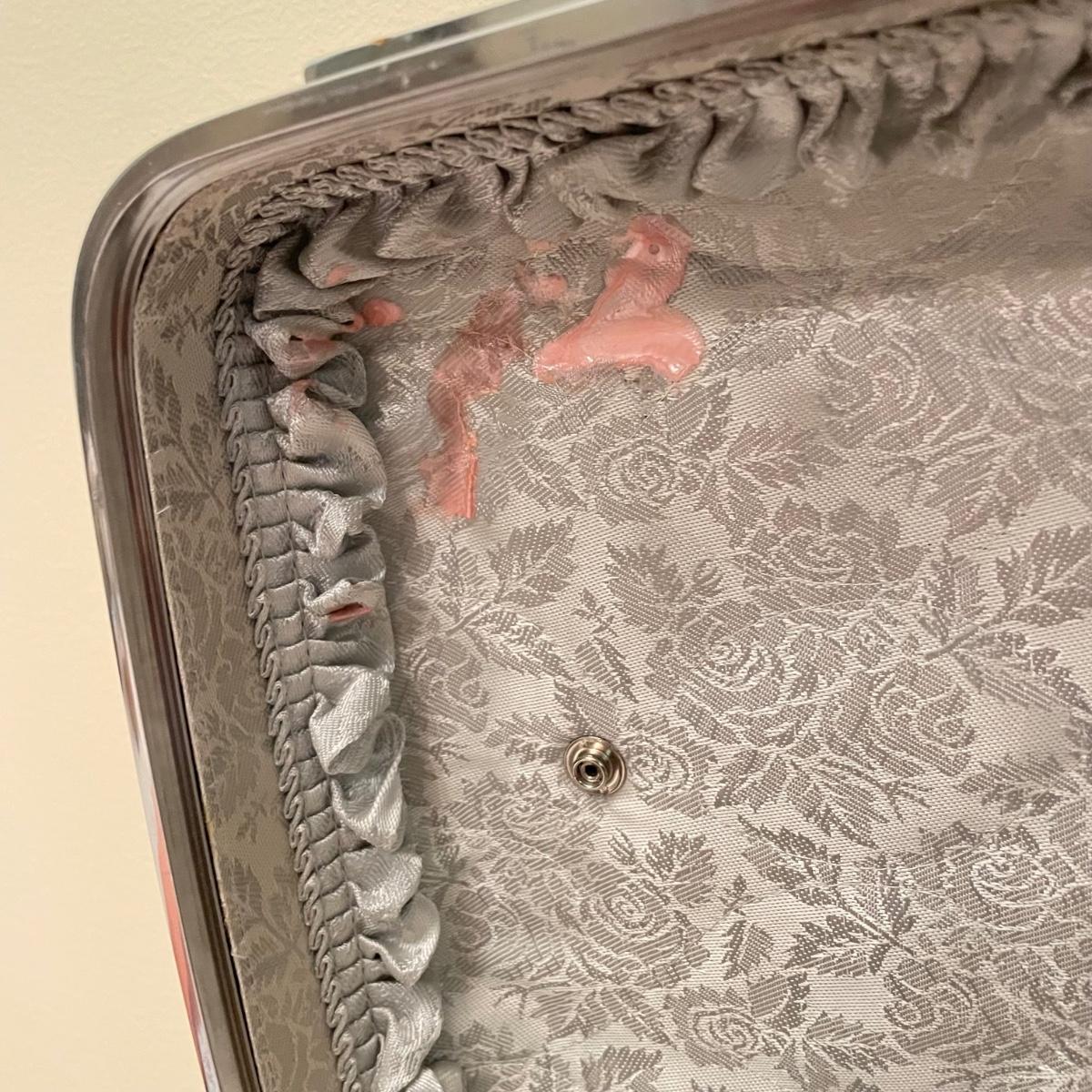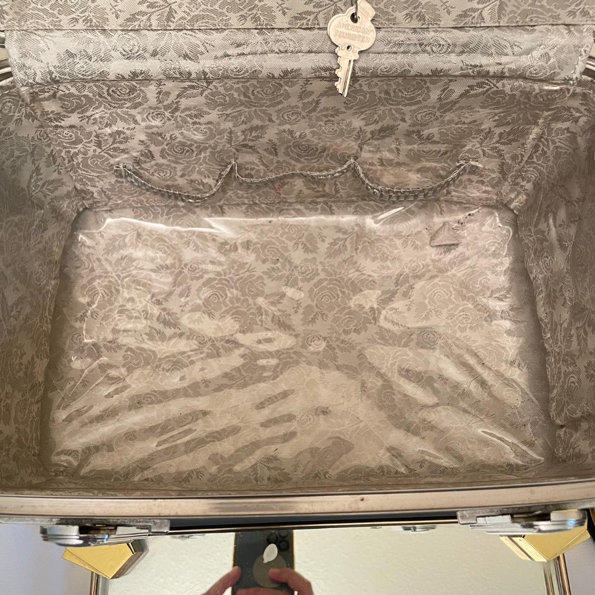 A fun, vintage lot featuring a Sloan travel clock/radio. The radio turned on when prompted, the clock has not been tested. Nice looking American Tourister Tiara hard sided case with two keys, three cloth covered vanity boxes, the heart shape has compartments for jewelry. Lot also features a gold accented vanity mirror/tray. The American Tourister case measures 14.5” x 9.5” x 8”H, it has a product spill on the lid, see photos. Shipping available.