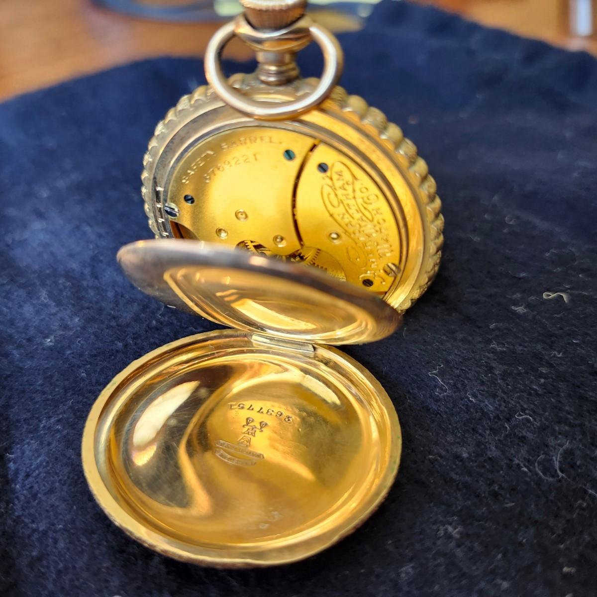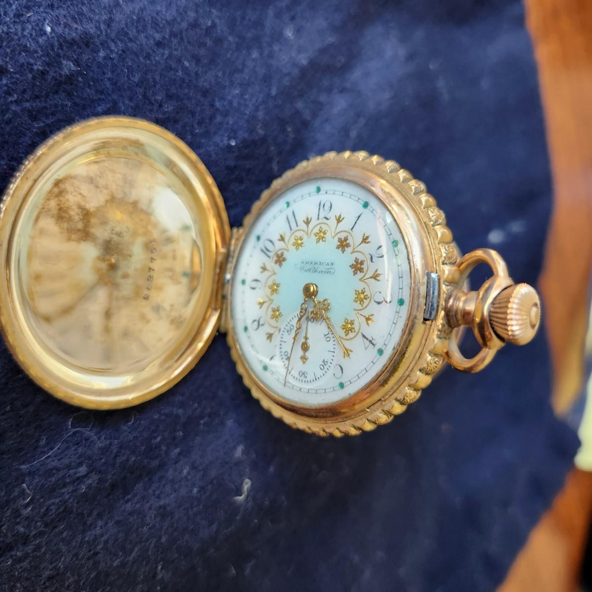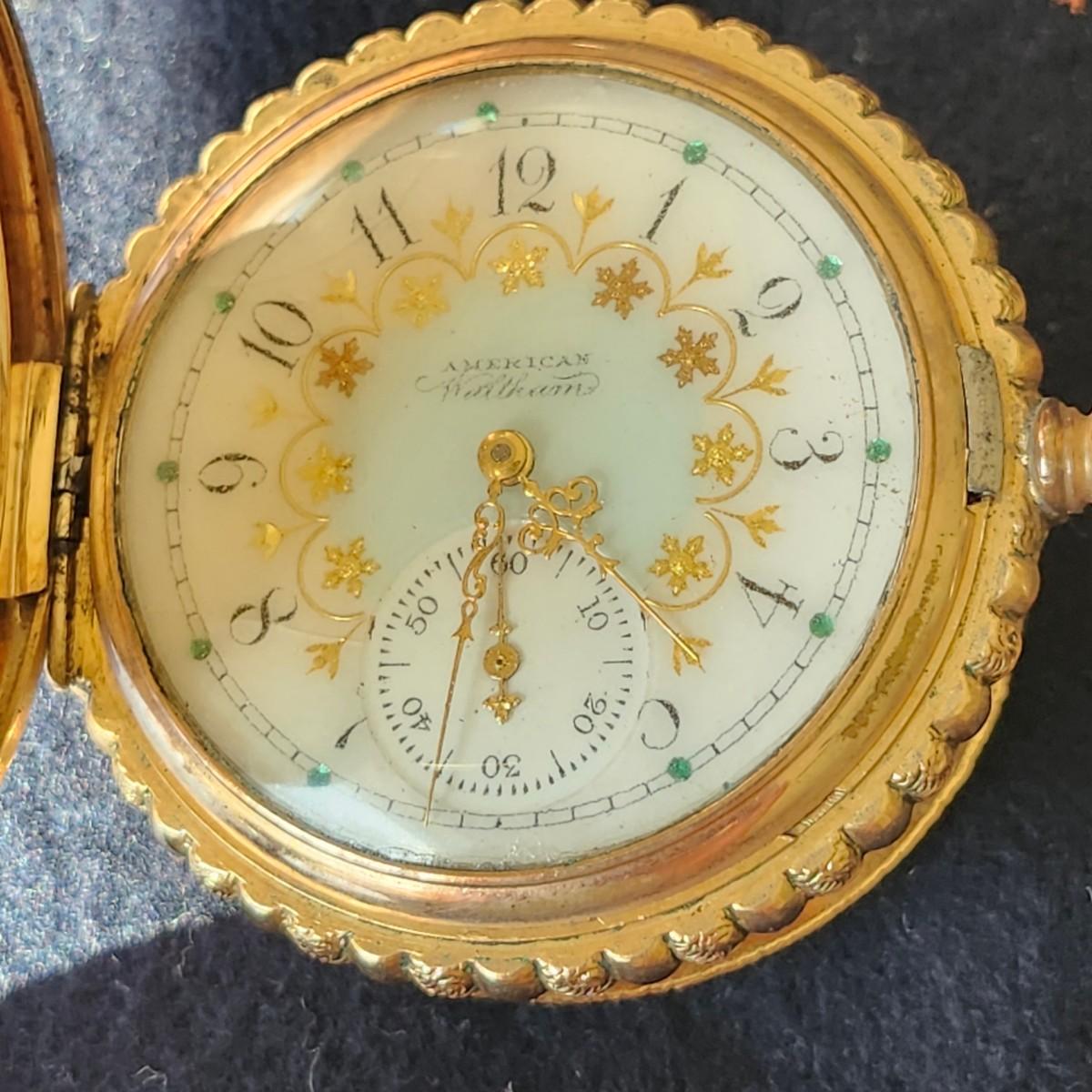 This is a non-working watch, it probably just needs to be cleaned. Size 6S, 7 jewels, porcelain face. Gilded. Ser # 6769221, probably made 1895-1897. Green stones or crystal on the hours. J Boss 14K case.
