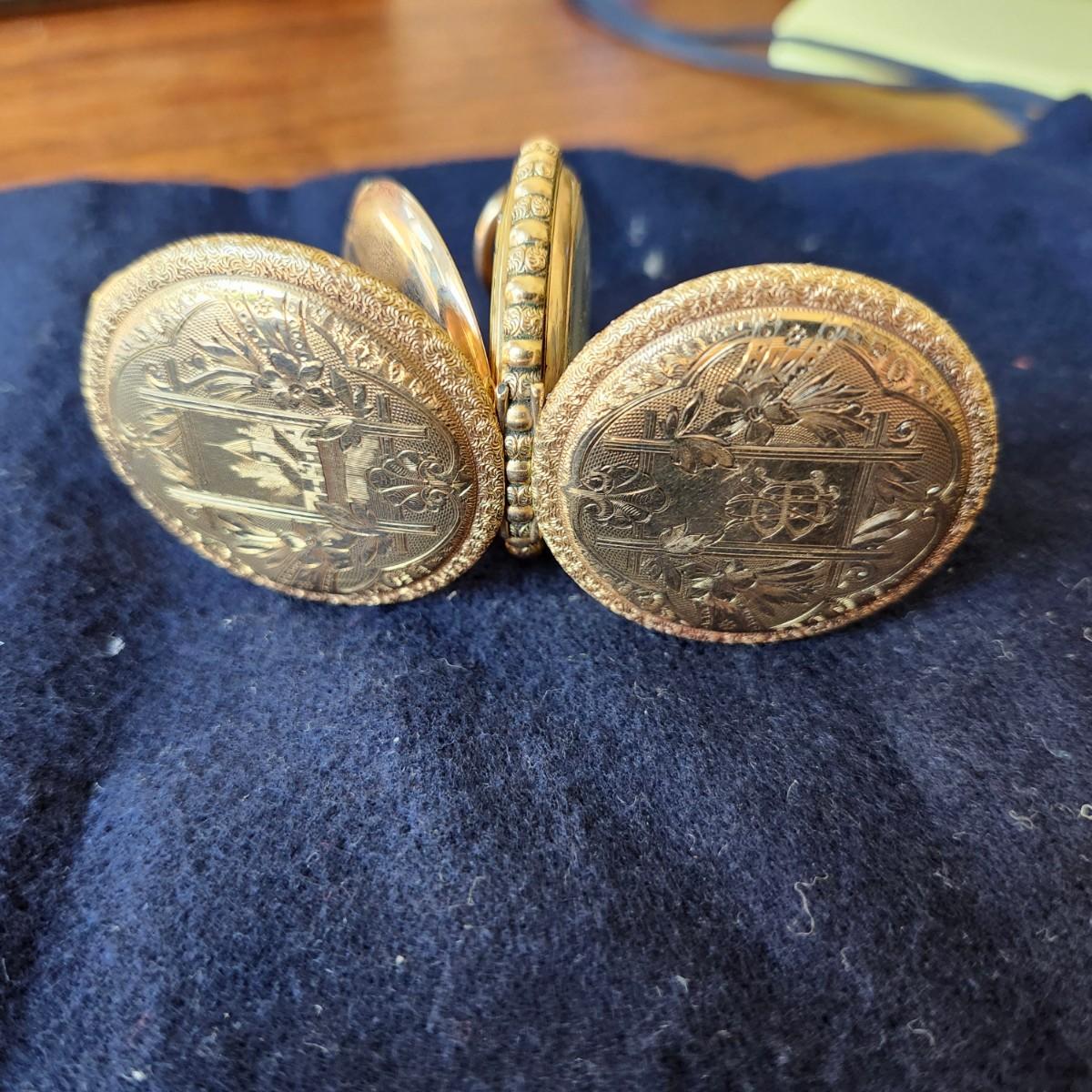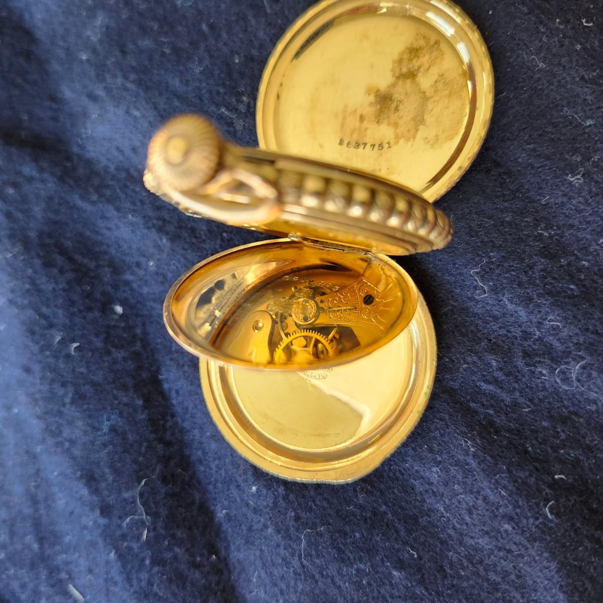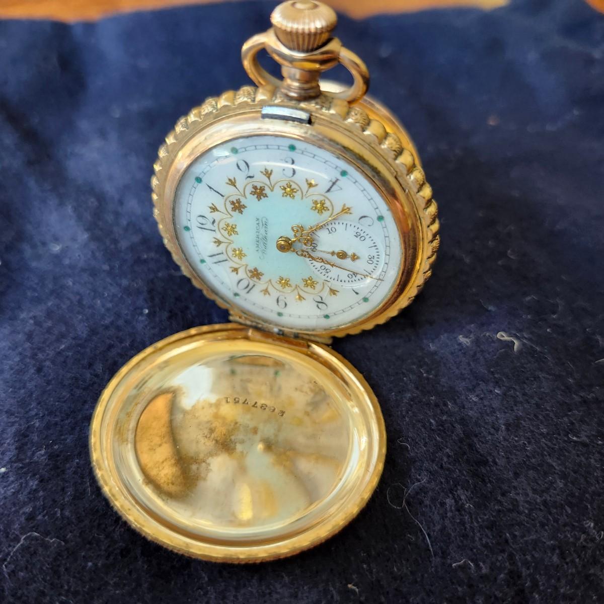 This is a non-working watch, it probably just needs to be cleaned. Size 6S, 7 jewels, porcelain face. Gilded. Ser # 6769221, probably made 1895-1897. Green stones or crystal on the hours. J Boss 14K case.