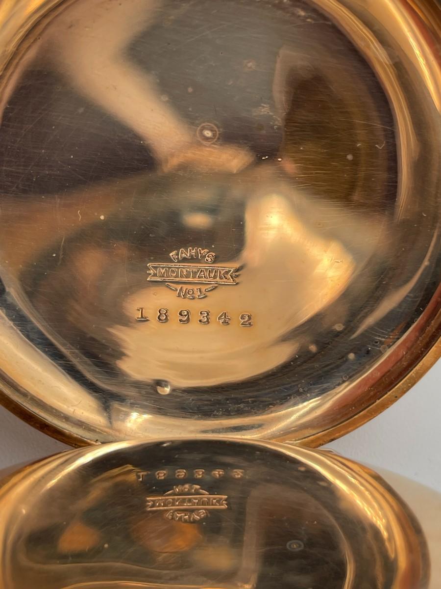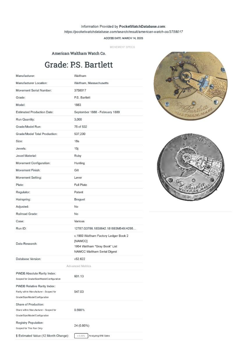 American Watch Co. " P.S. Bartlett" Pocket Watch, No. (3758017), Size 18s, Prod Yr. 1883. Case: Fahys No.1 Montauk, No. 189342, GF. Condition - Winder & watch are in working order. This is not a guarantee that all parts are original nor is the watch autheniticated.