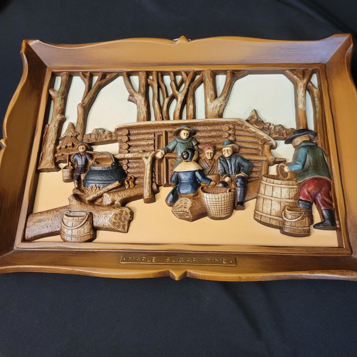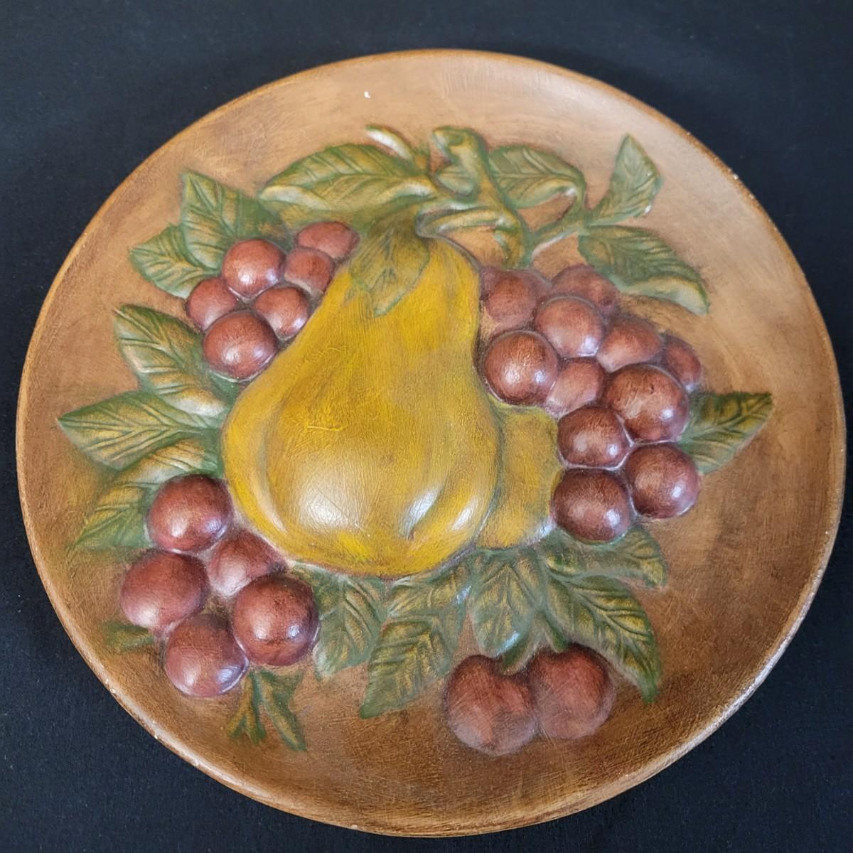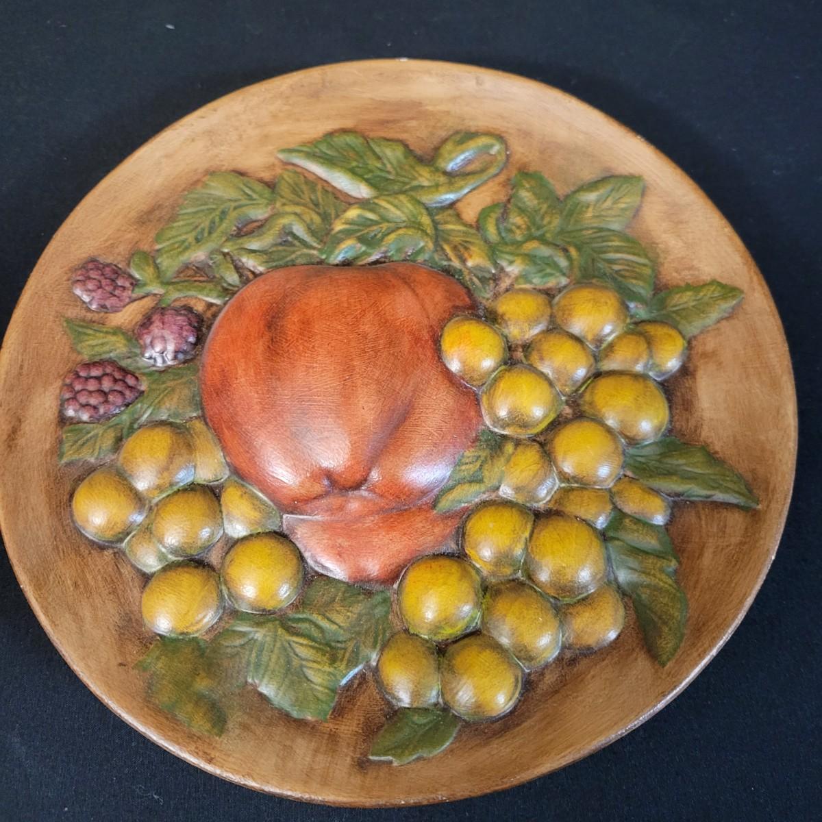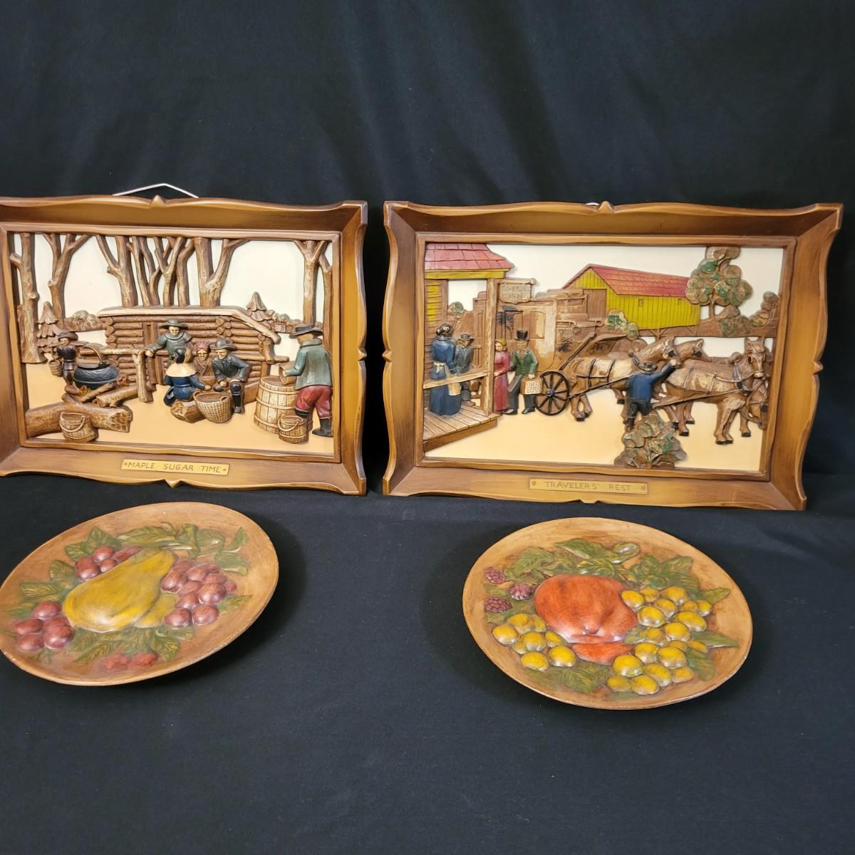 Two pieces of Amercana art and two plaster cast fruit plates in good condition. The fruit plates do have some minor blemishes on their edges. The Americana pieces appear to be made of plastic molds and depict 19th century American scenes, were manufactured by Syroco Inc. and have a 3D fresco style to them. The fruit plates appear to be plaster molds and also have a similar 3D style. Americana pieces measure approximately 14" x 10" x 1.5" Shipping available