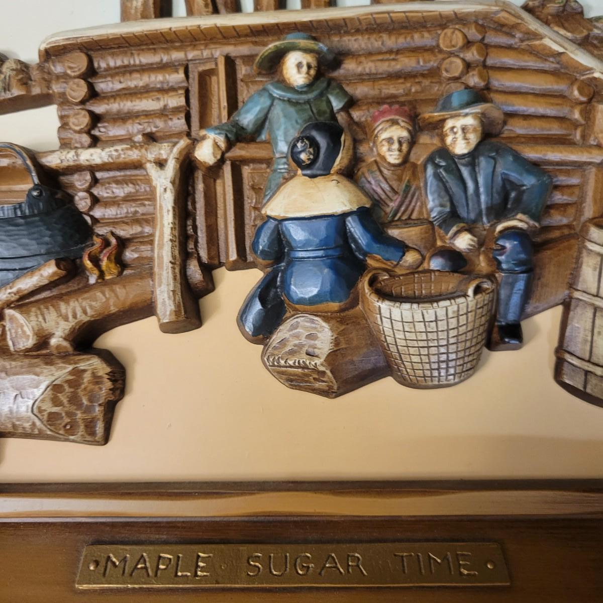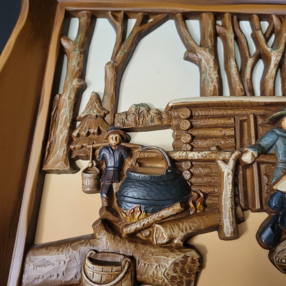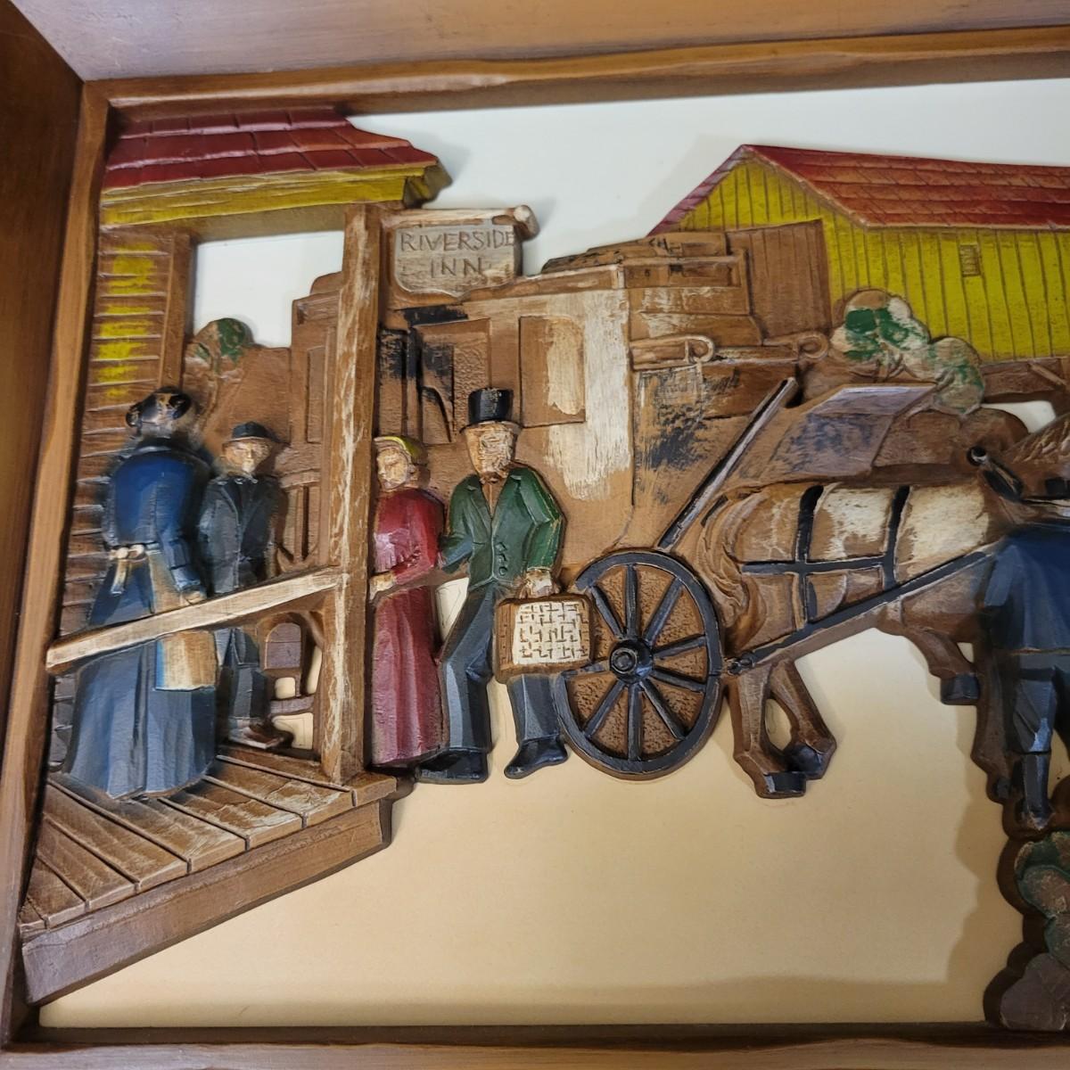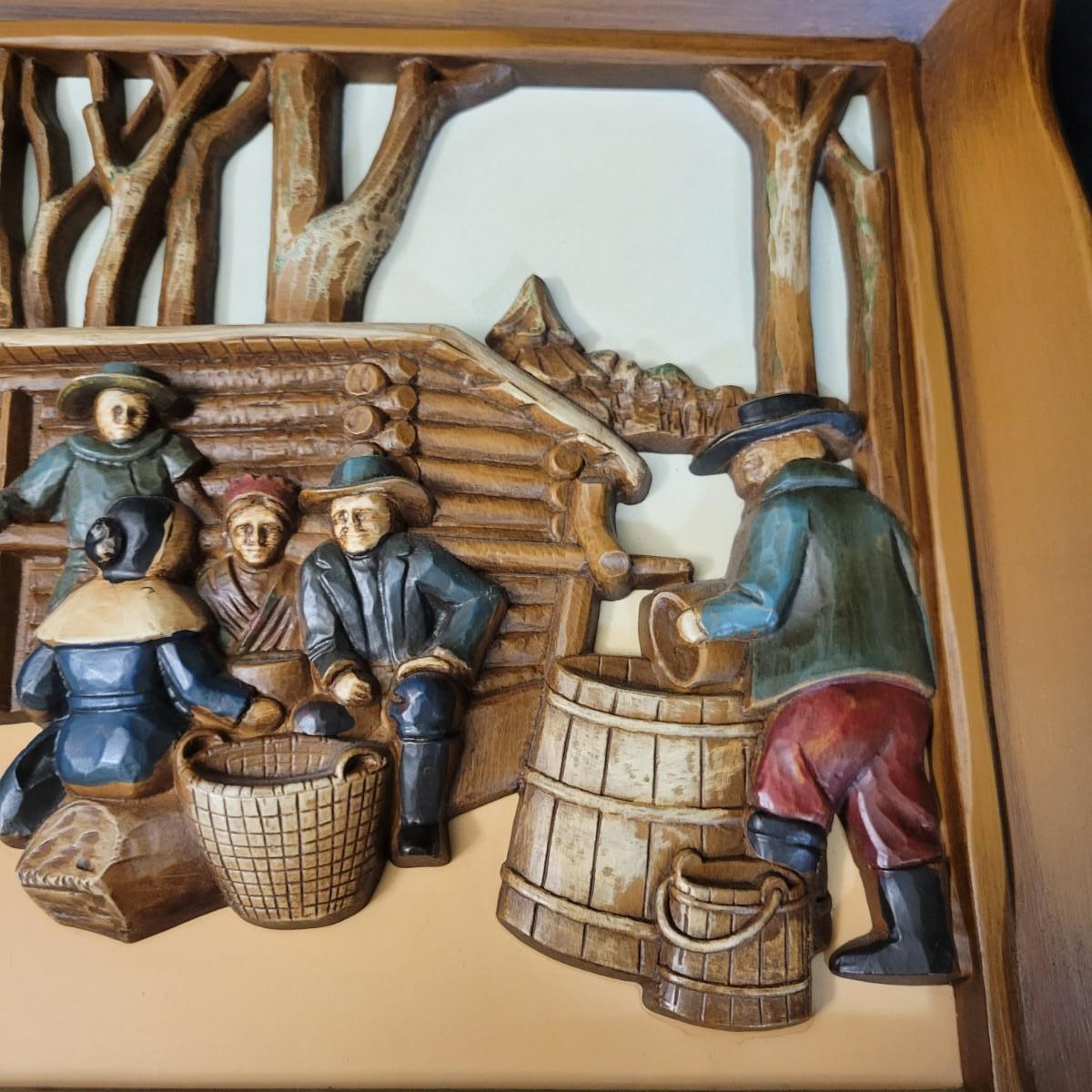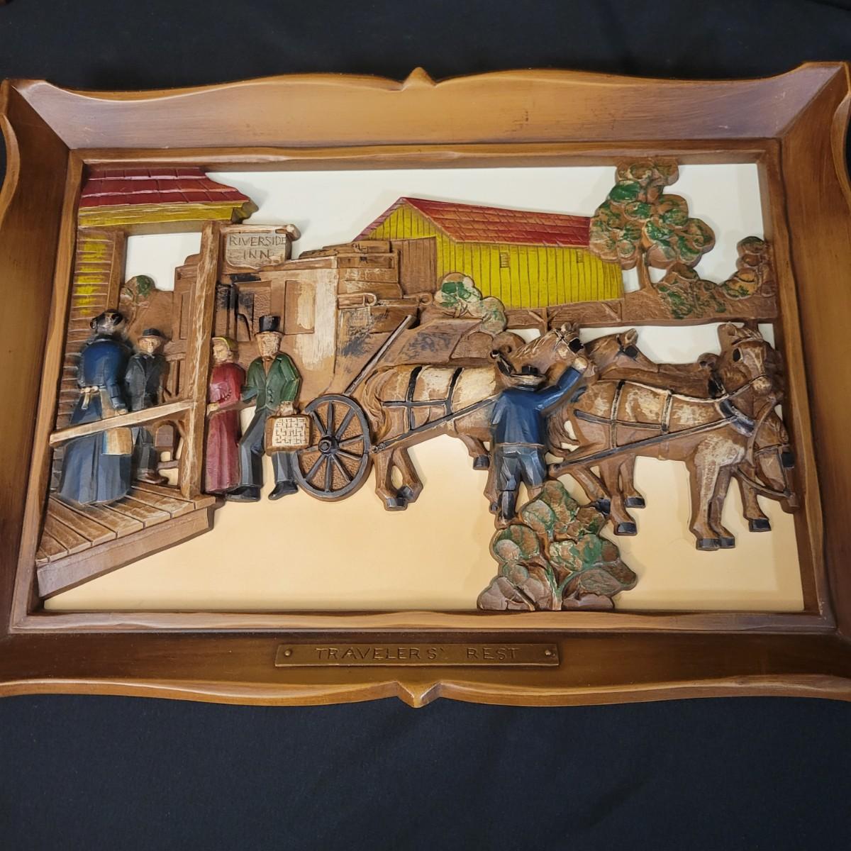 Two pieces of Amercana art and two plaster cast fruit plates in good condition. The fruit plates do have some minor blemishes on their edges. The Americana pieces appear to be made of plastic molds and depict 19th century American scenes, were manufactured by Syroco Inc. and have a 3D fresco style to them. The fruit plates appear to be plaster molds and also have a similar 3D style. Americana pieces measure approximately 14" x 10" x 1.5" Shipping available