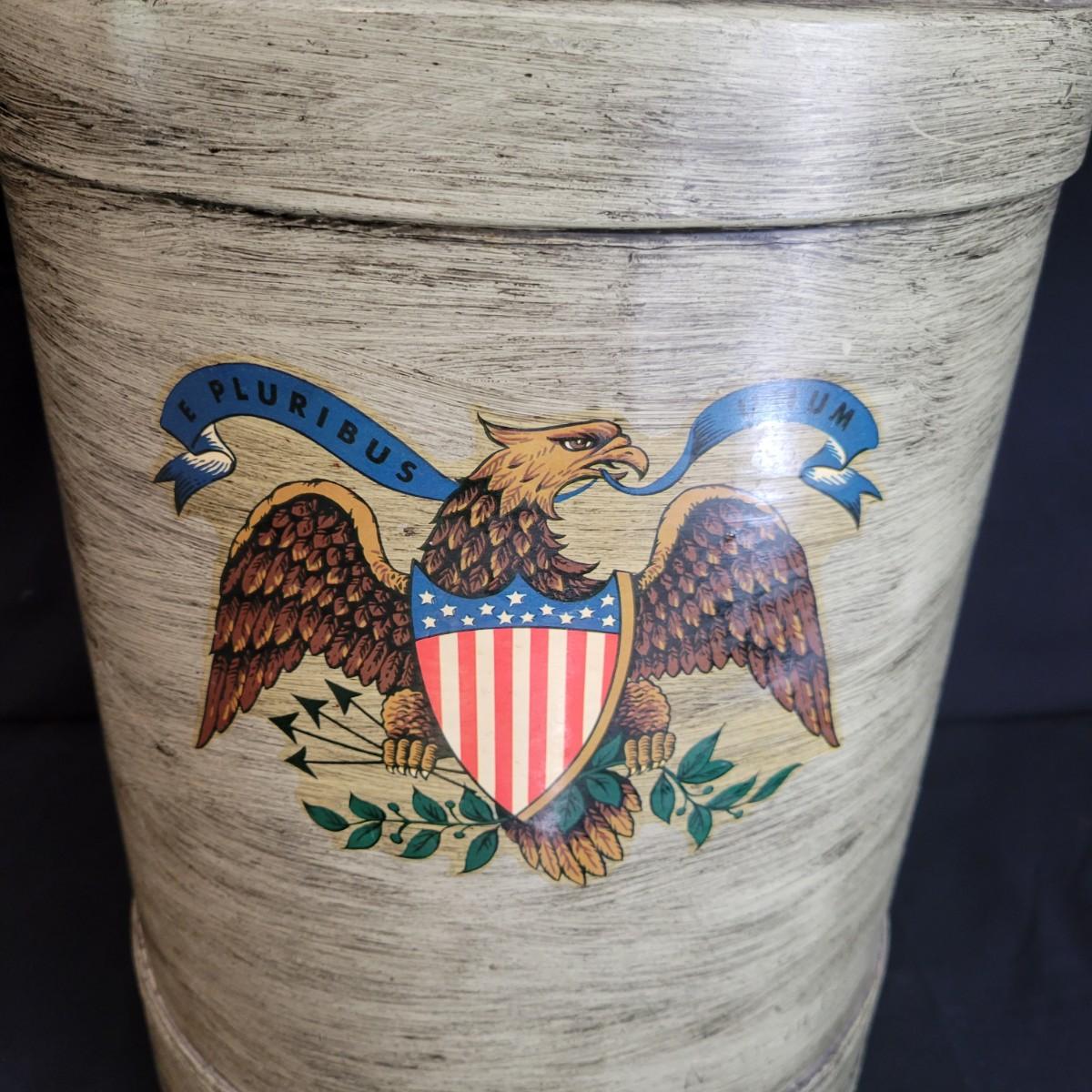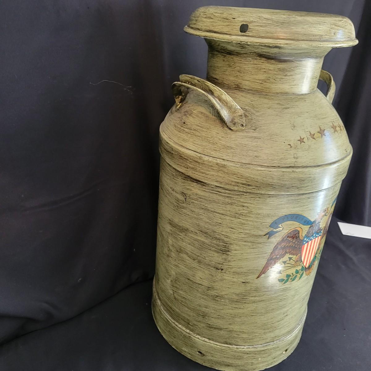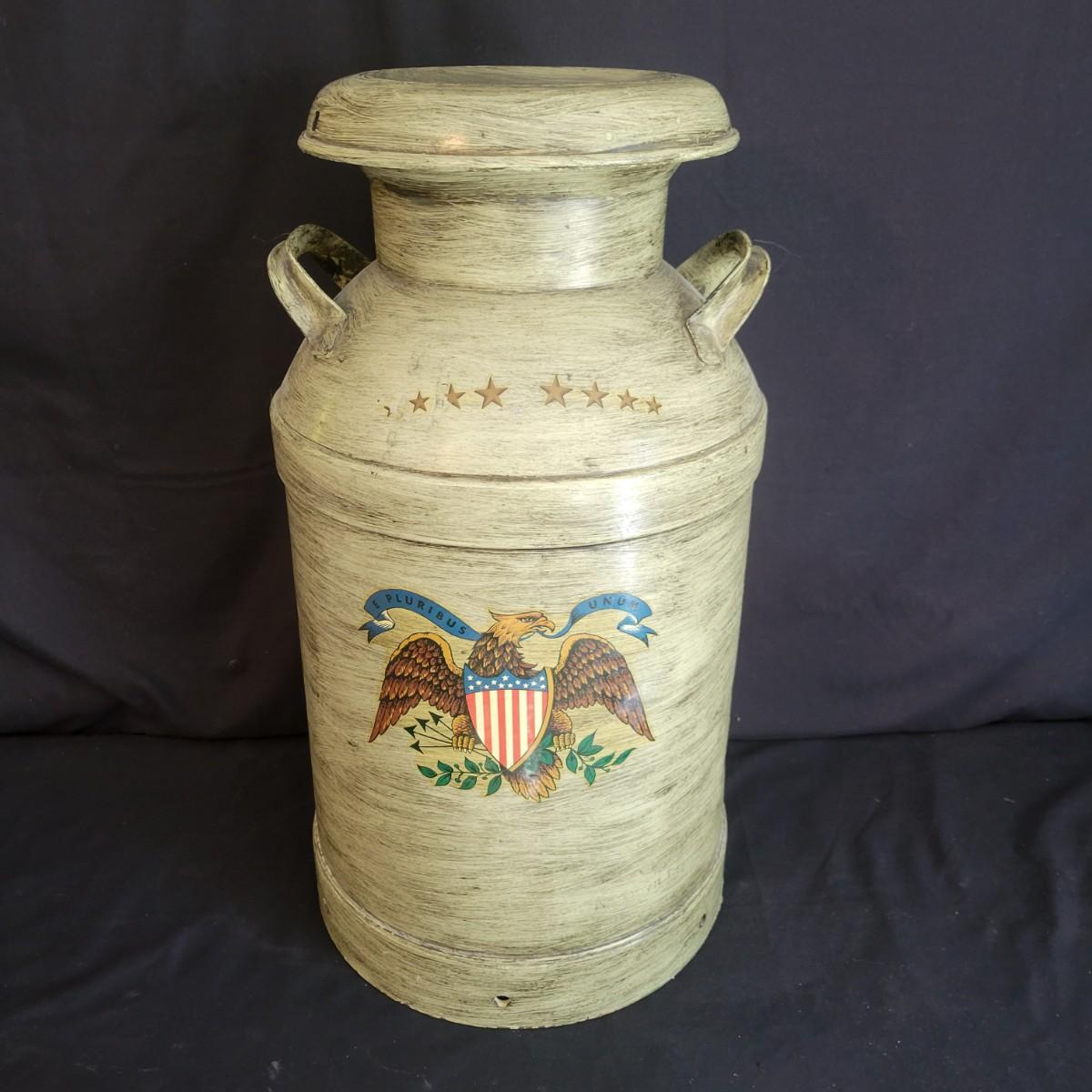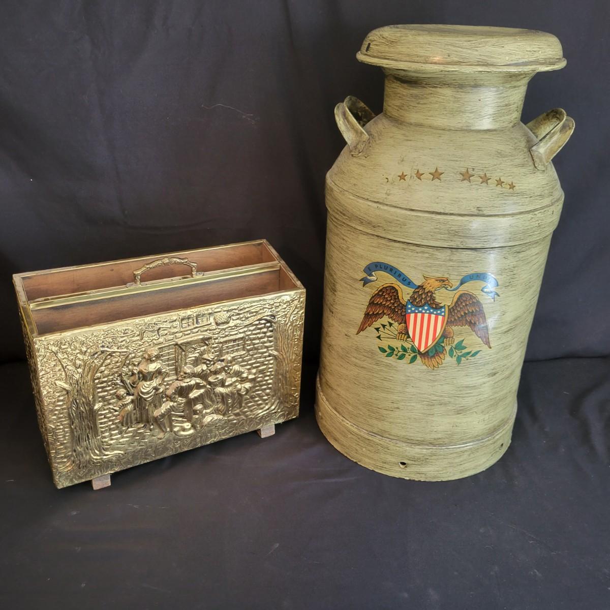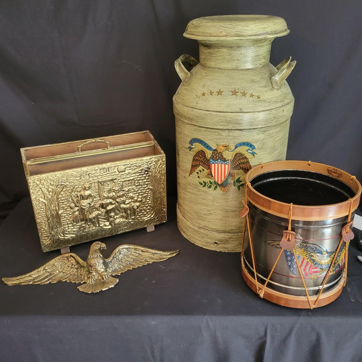An assortment of four Americana decor items. Included is a brass eagle, a magazine rack with an embossed metal exterior, a waste bin modeled after a drum and a large metal milk jug. The milk jug measures approximately 12"D x 25"H and the lid did not come off. Local pickup only