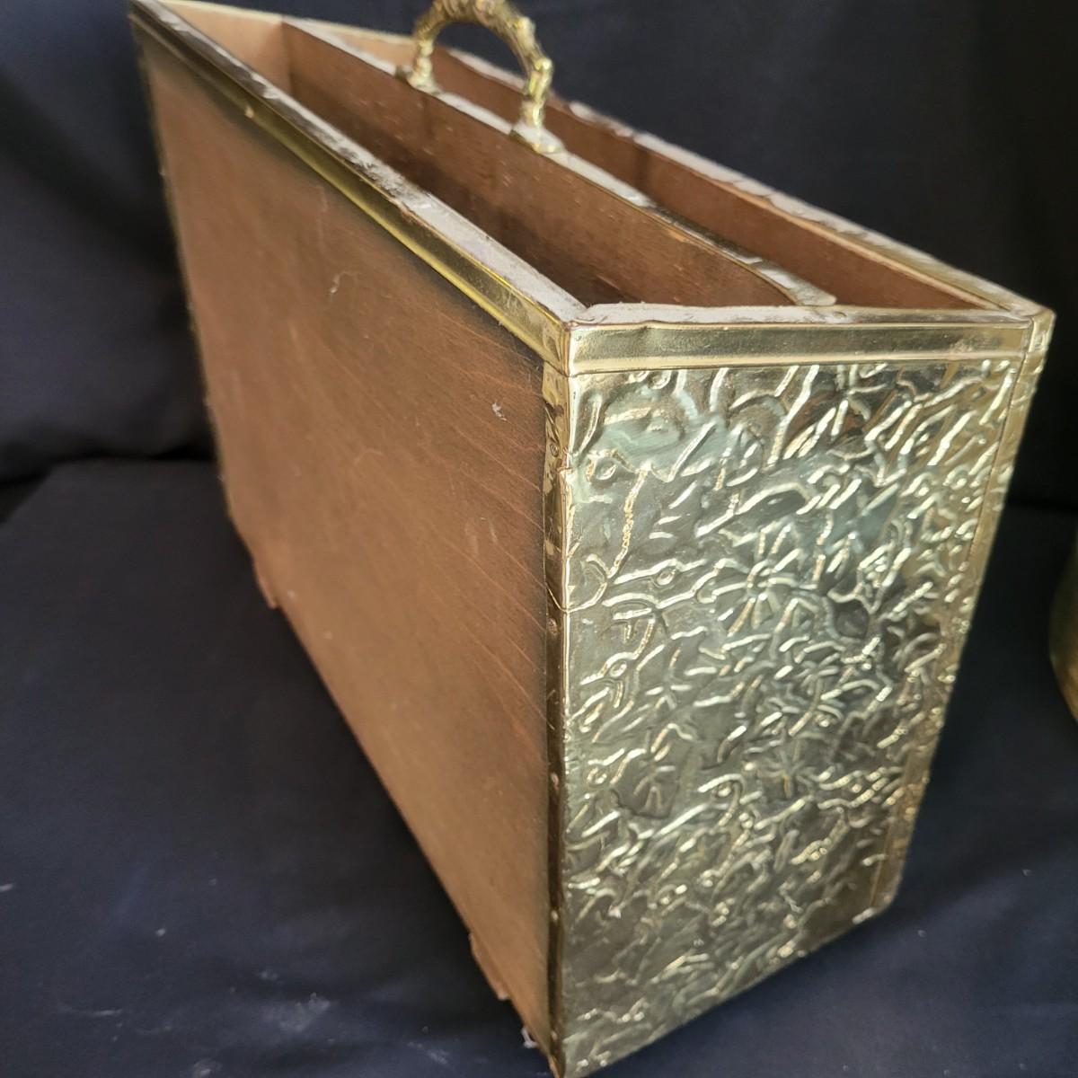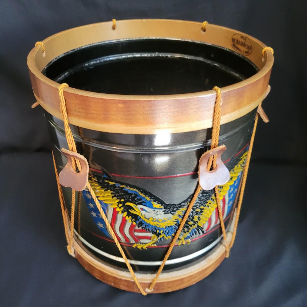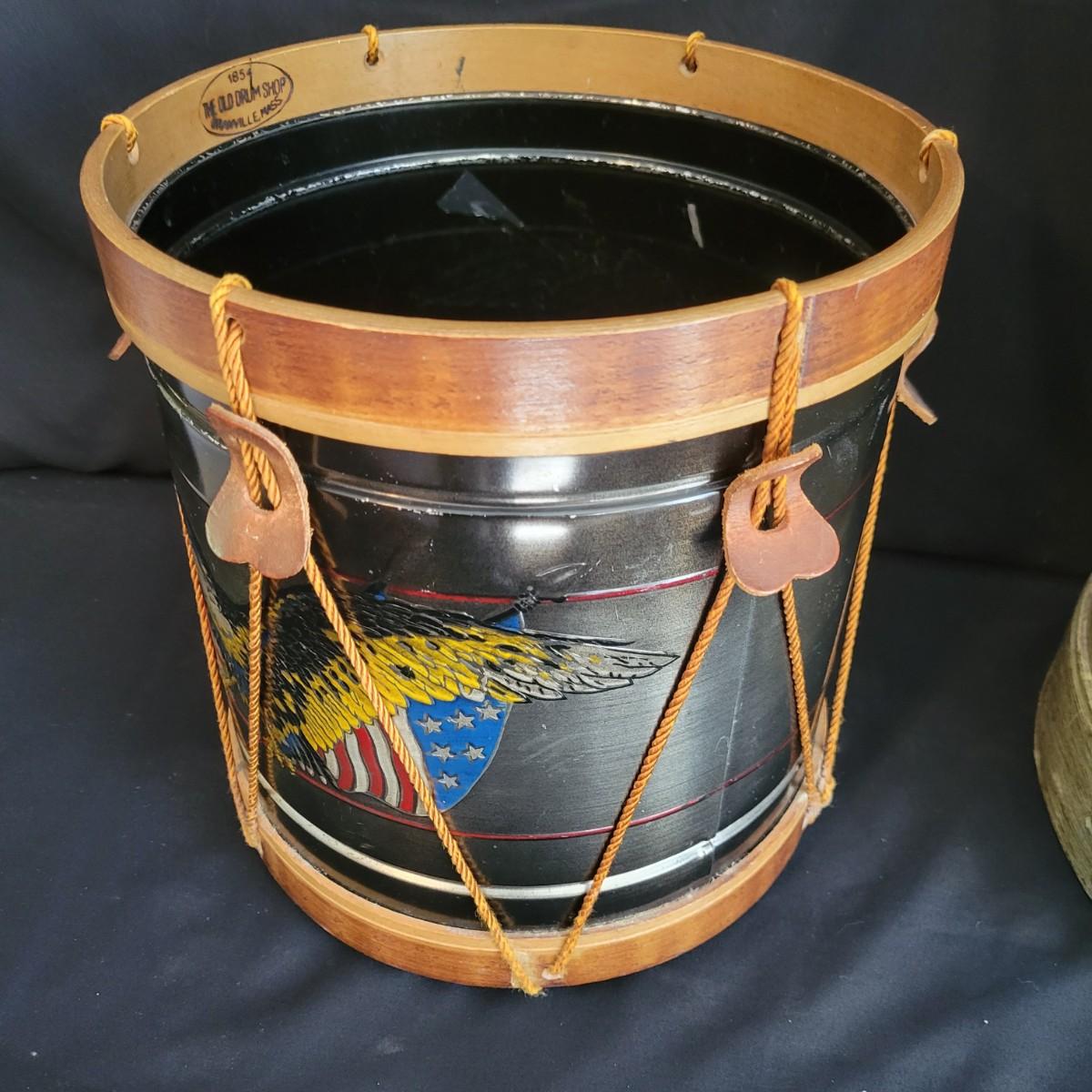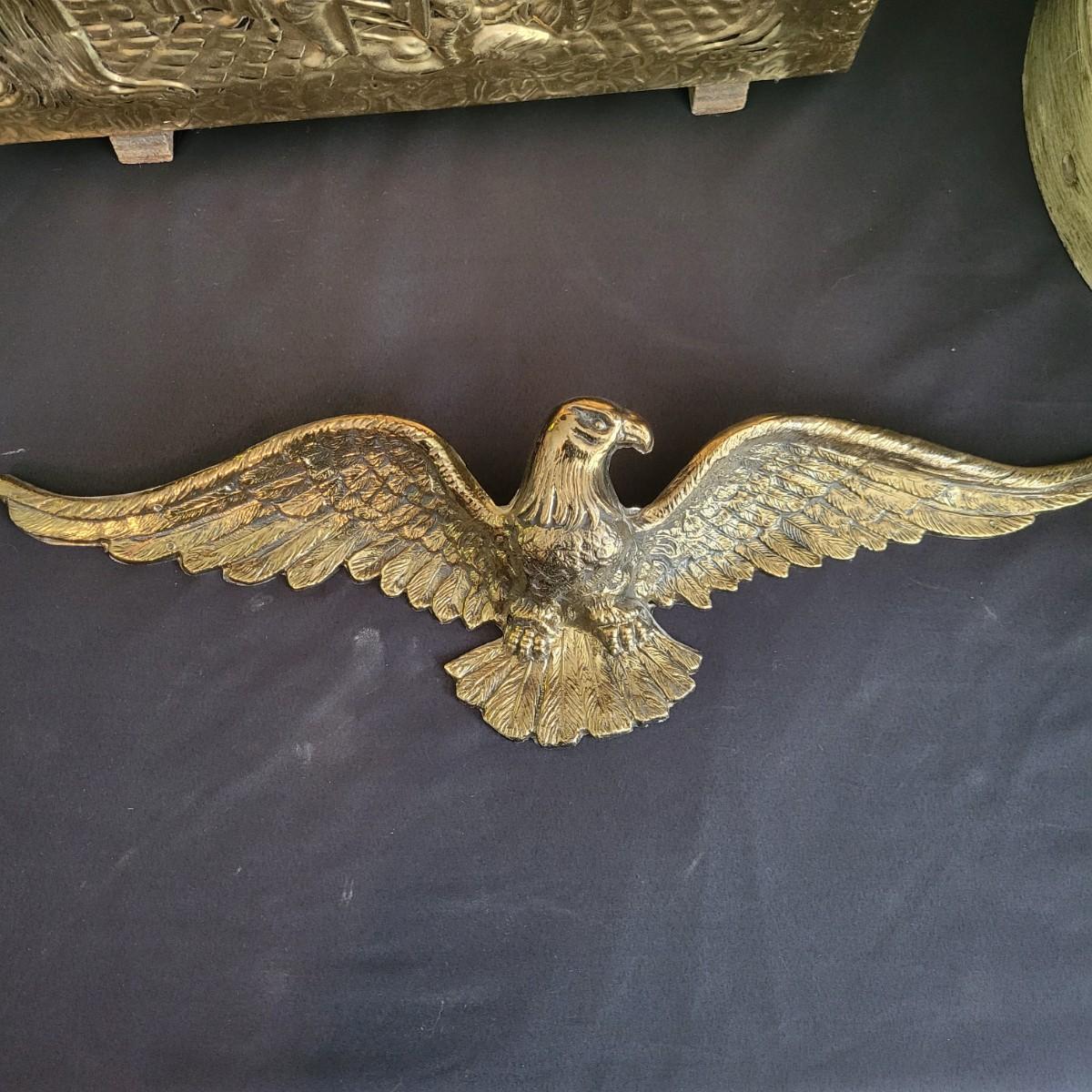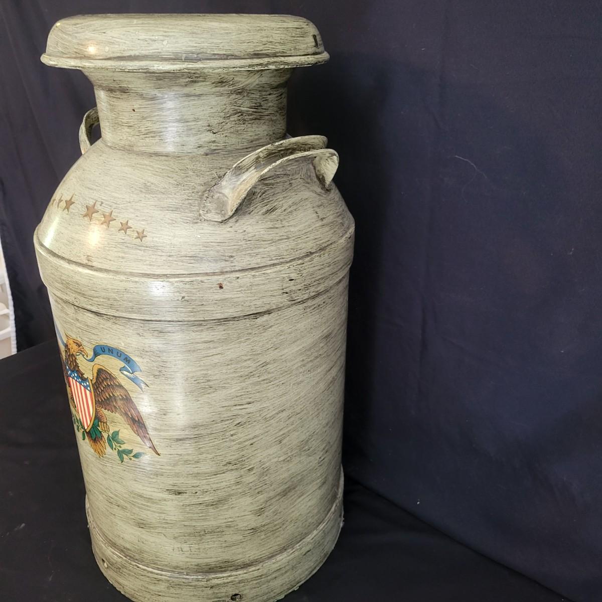 An assortment of four Americana decor items. Included is a brass eagle, a magazine rack with an embossed metal exterior, a waste bin modeled after a drum and a large metal milk jug. The milk jug measures approximately 12"D x 25"H and the lid did not come off. Local pickup only
