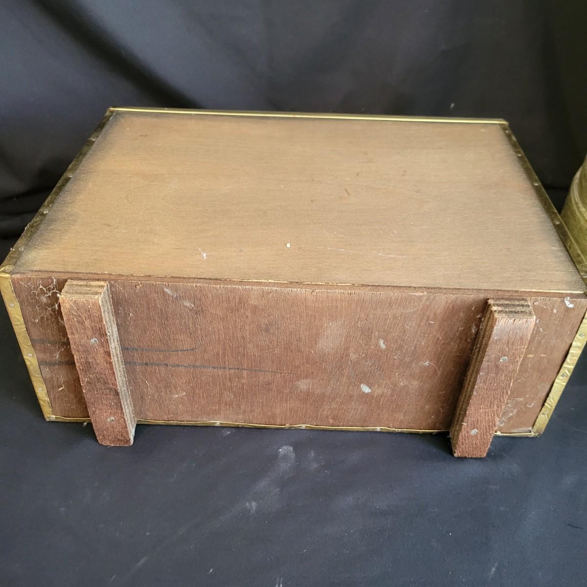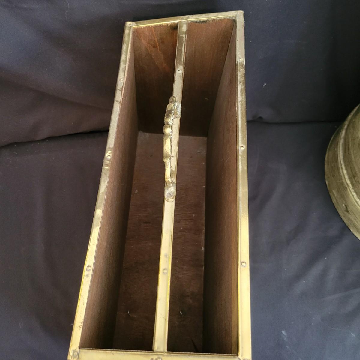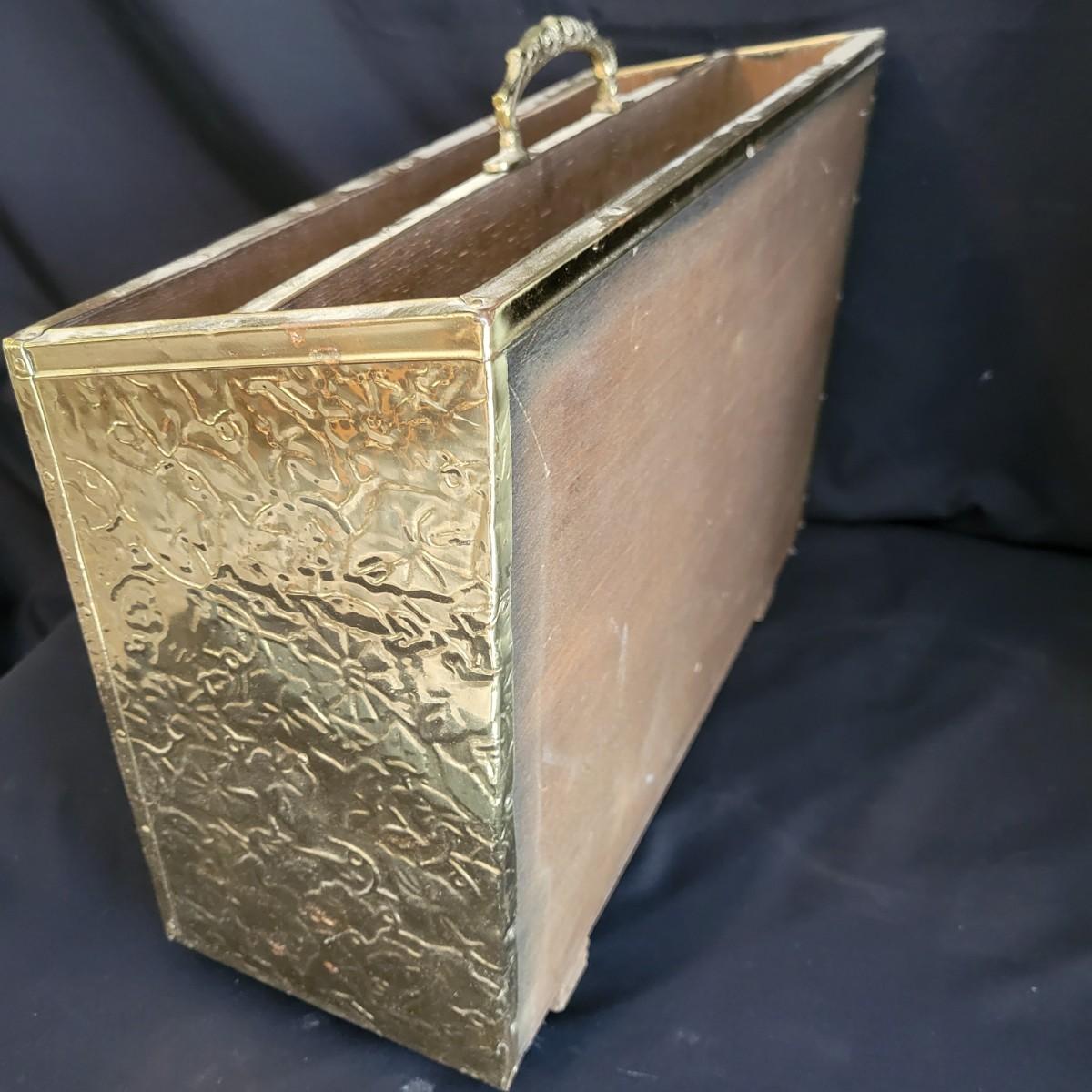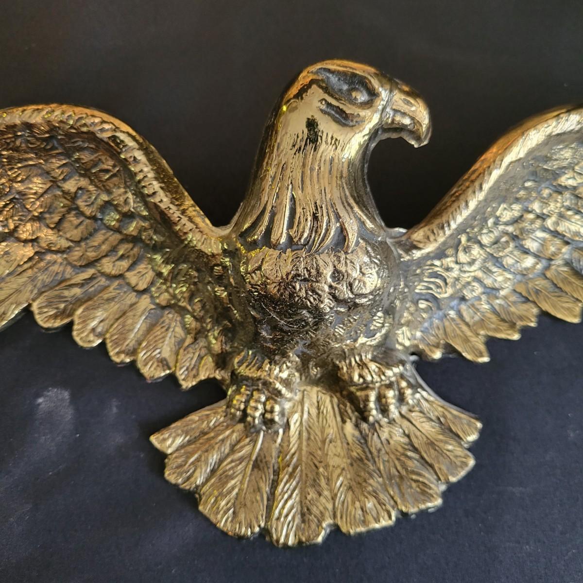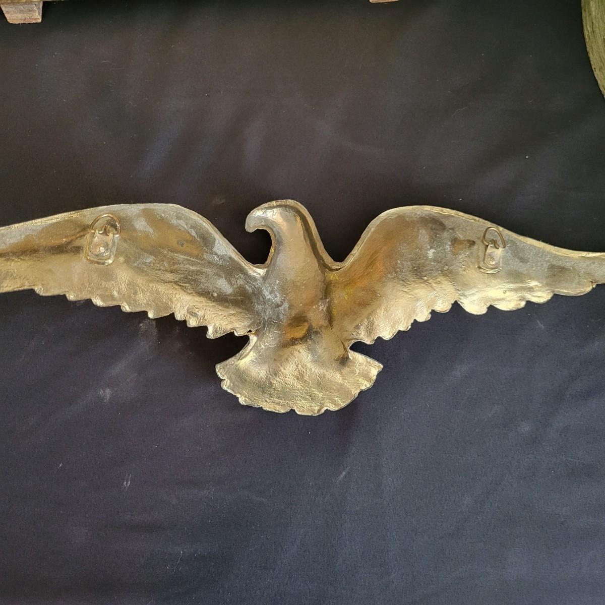 An assortment of four Americana decor items. Included is a brass eagle, a magazine rack with an embossed metal exterior, a waste bin modeled after a drum and a large metal milk jug. The milk jug measures approximately 12"D x 25"H and the lid did not come off. Local pickup only