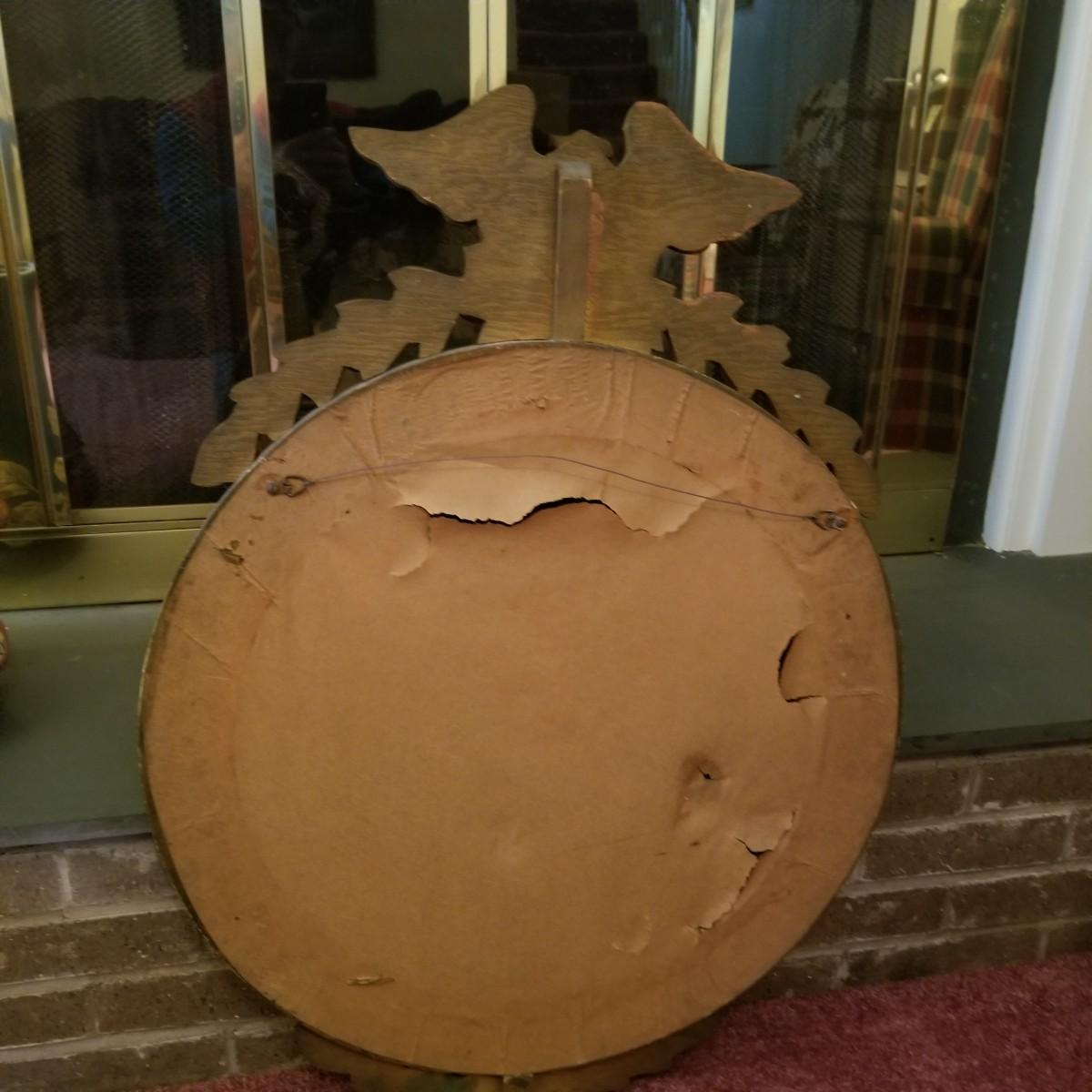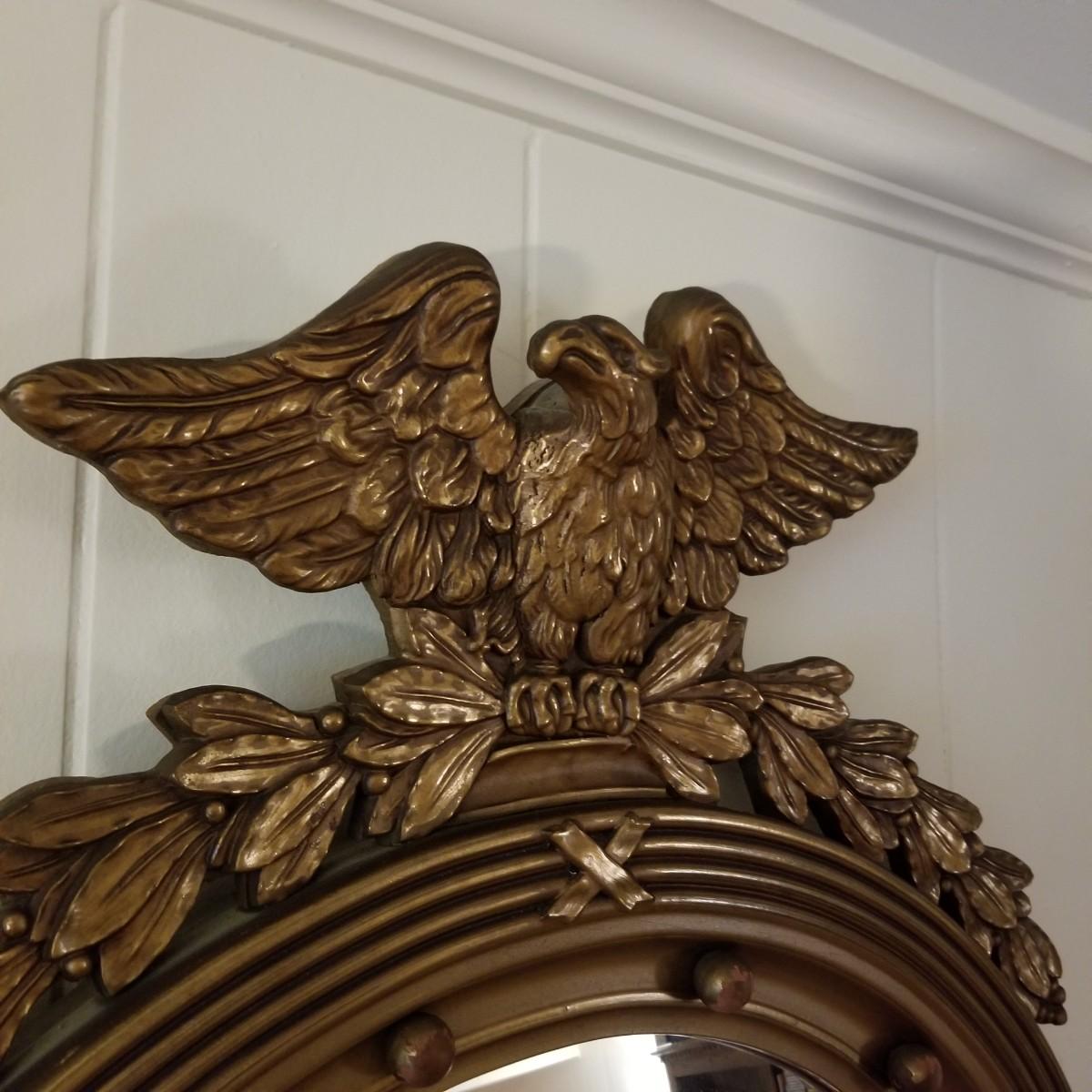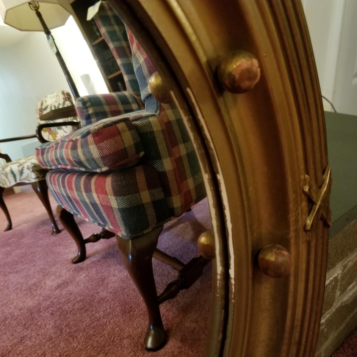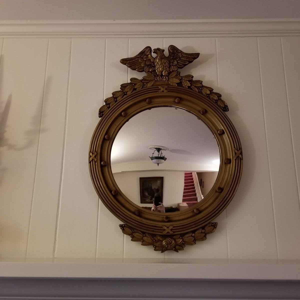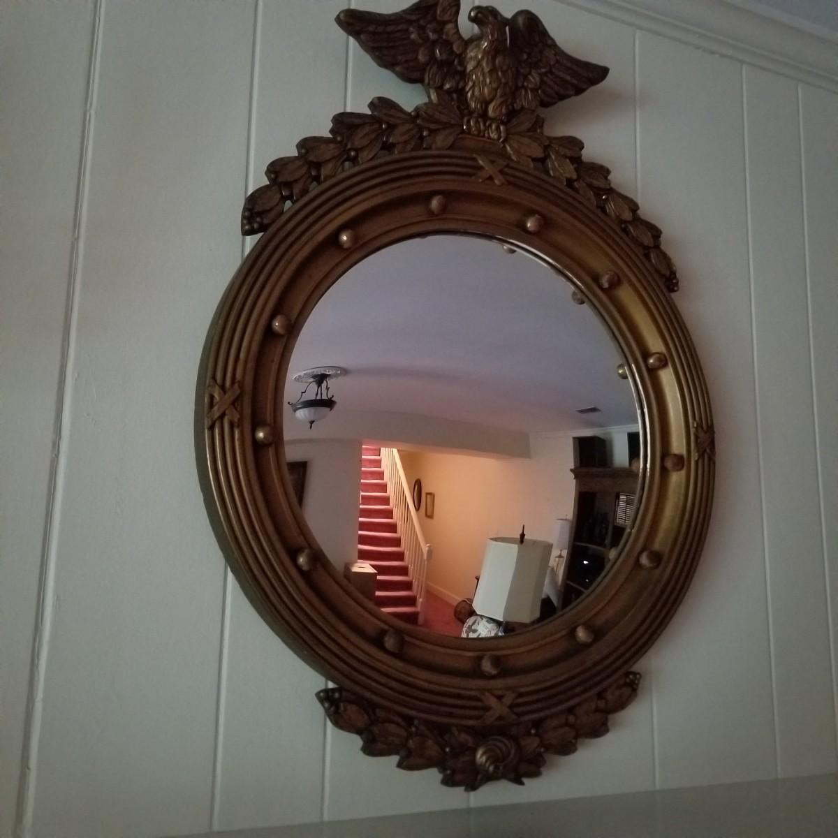 Wood framed round mirror with American eagle top piece. Gold painted accent on frame, mirror measures 17"d and full frame is approximately 23"x32". Some wear of gold color on inside of frame, see photos for details. Local pickup only.