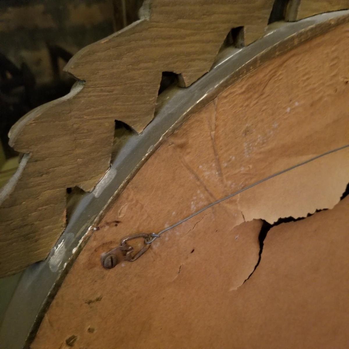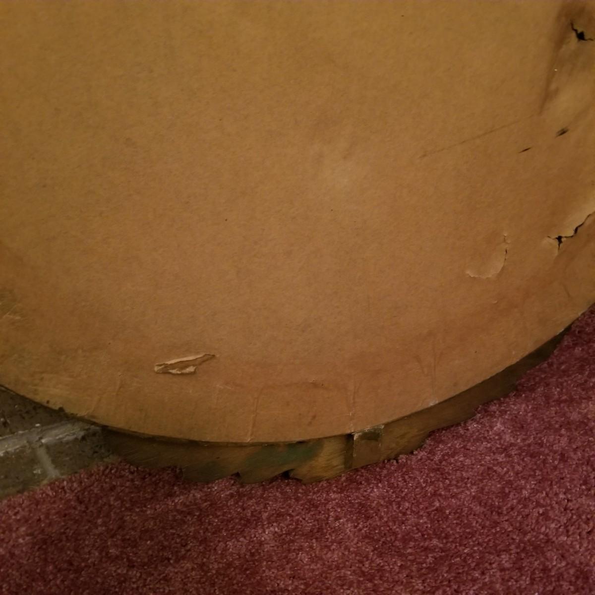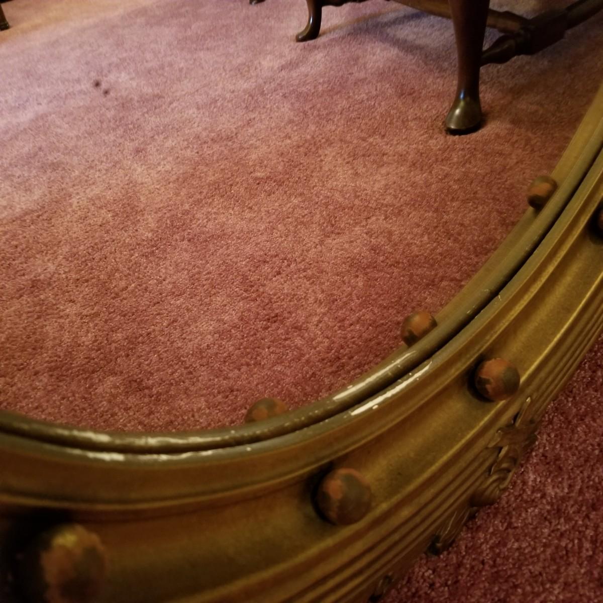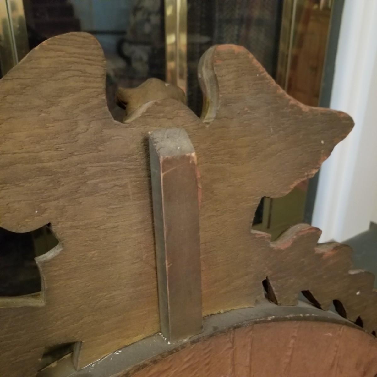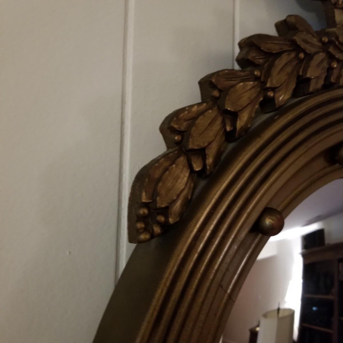 Wood framed round mirror with American eagle top piece. Gold painted accent on frame, mirror measures 17"d and full frame is approximately 23"x32". Some wear of gold color on inside of frame, see photos for details. Local pickup only.