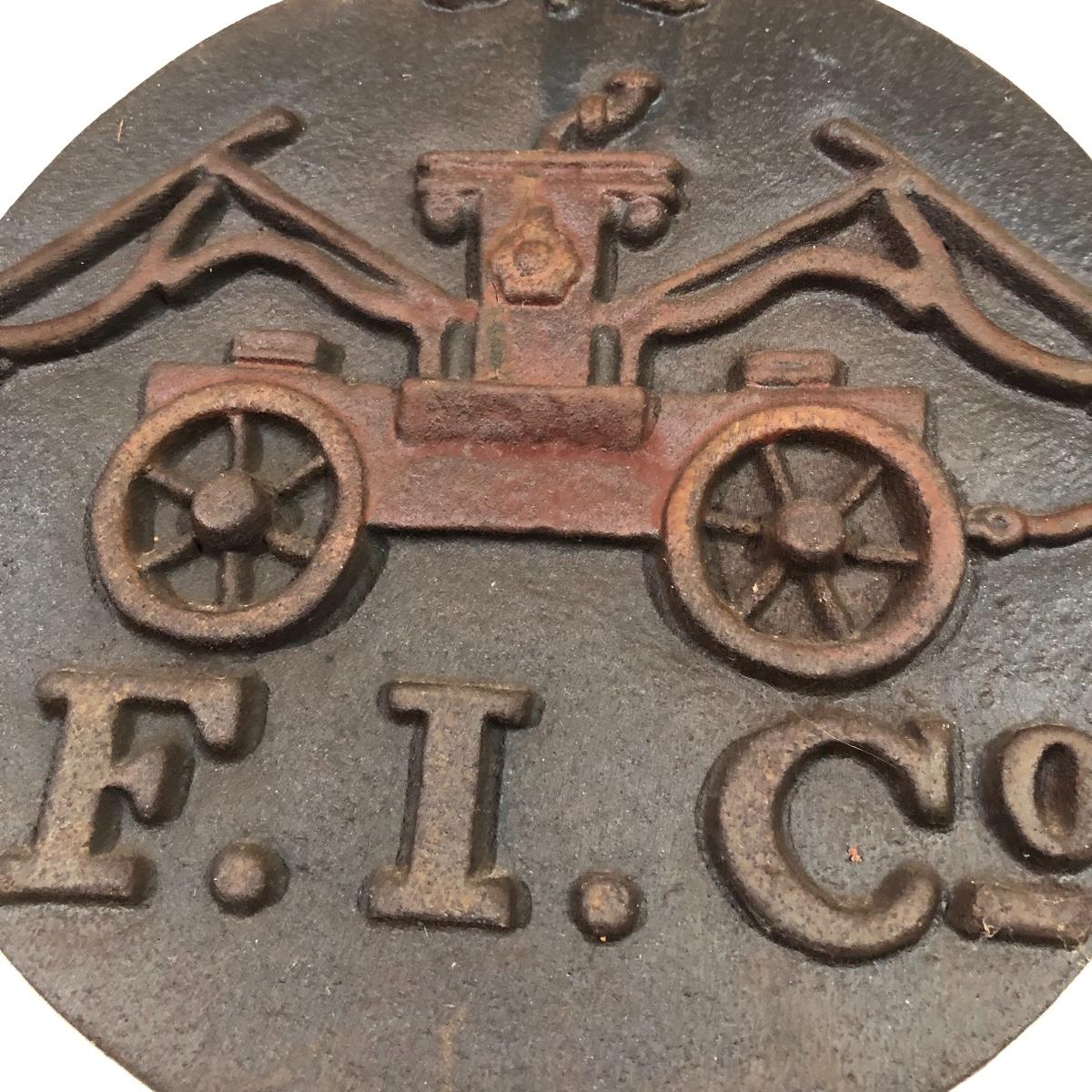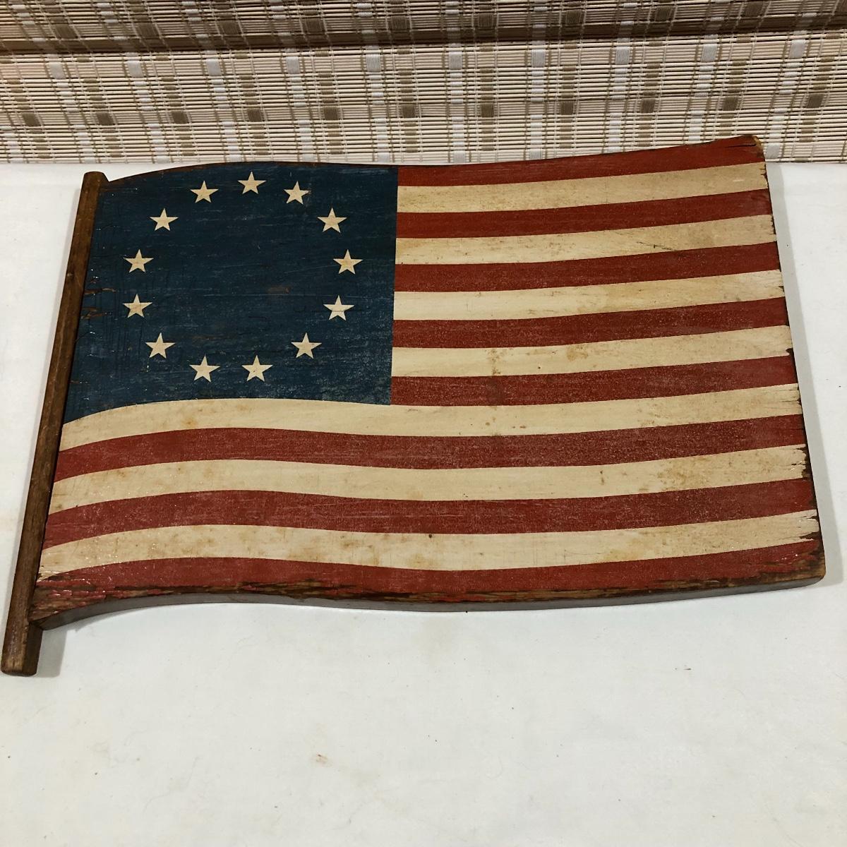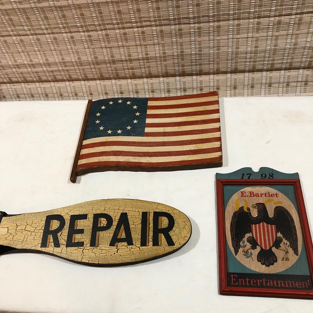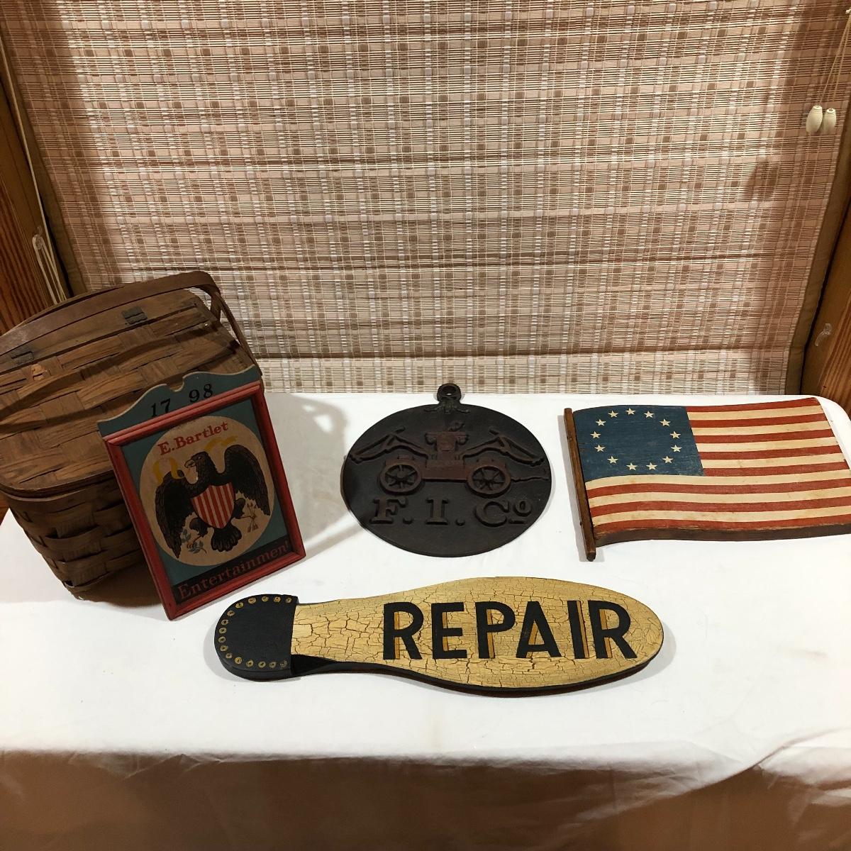There are five items in this lot. The Fireman’s Insurance wall plaque is cast iron and measures almost 12” in diameter. The early American wooden flag has a stamp on the back that reads, “Cornwall Wood Products So. Paris, Maine.” It measures 15” x 10”. The hand painted shoe measures 21” x 6”. The 1798 wall plaque measures 7.5” x 12”. The pie basket comes with an insert and measures 13.5” x 13” x 8”. Please note the two places where the weaving is broke. Local pick up only.