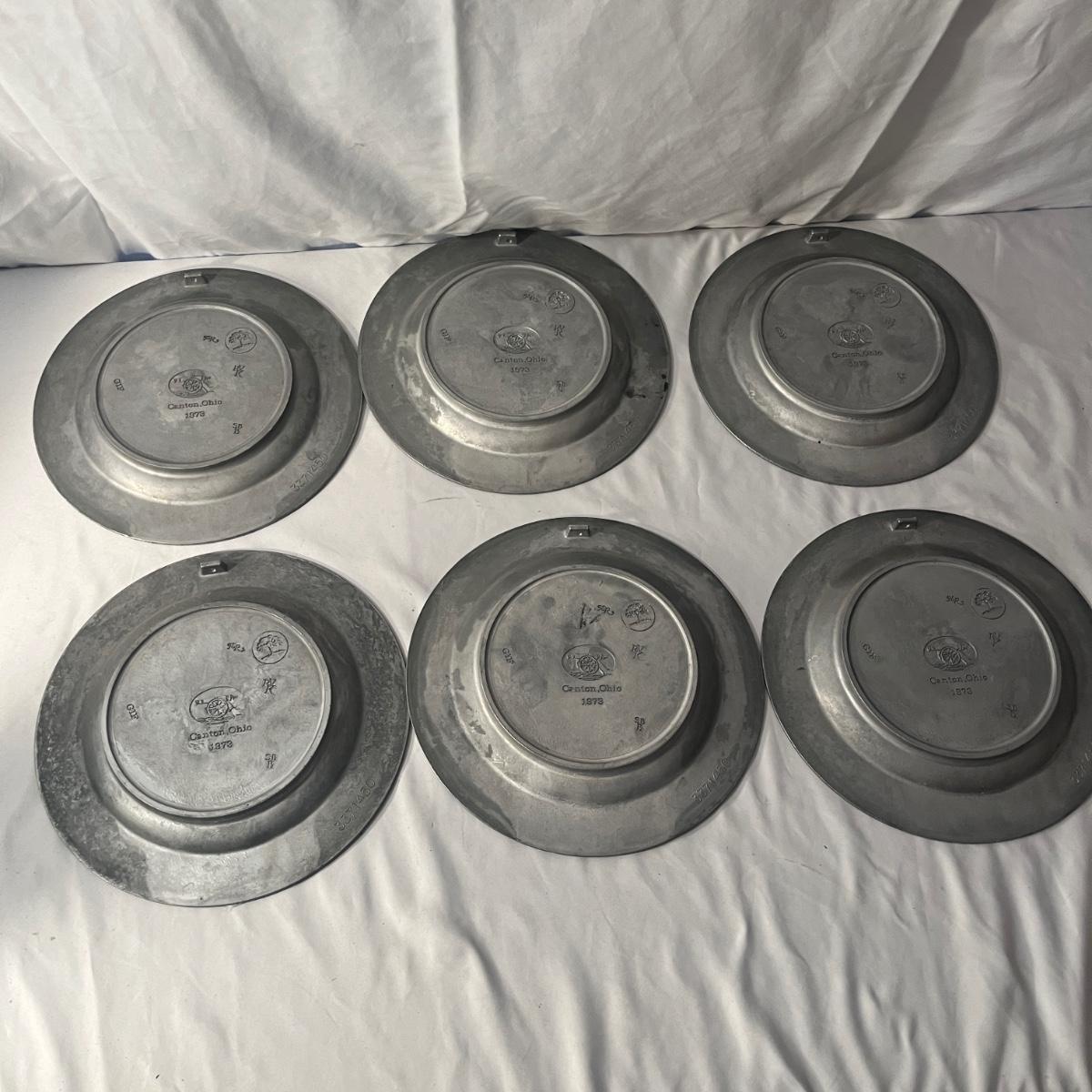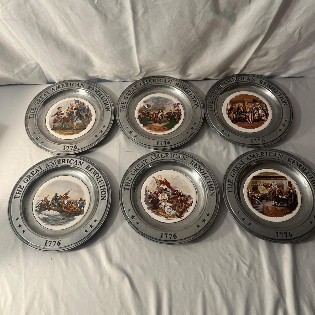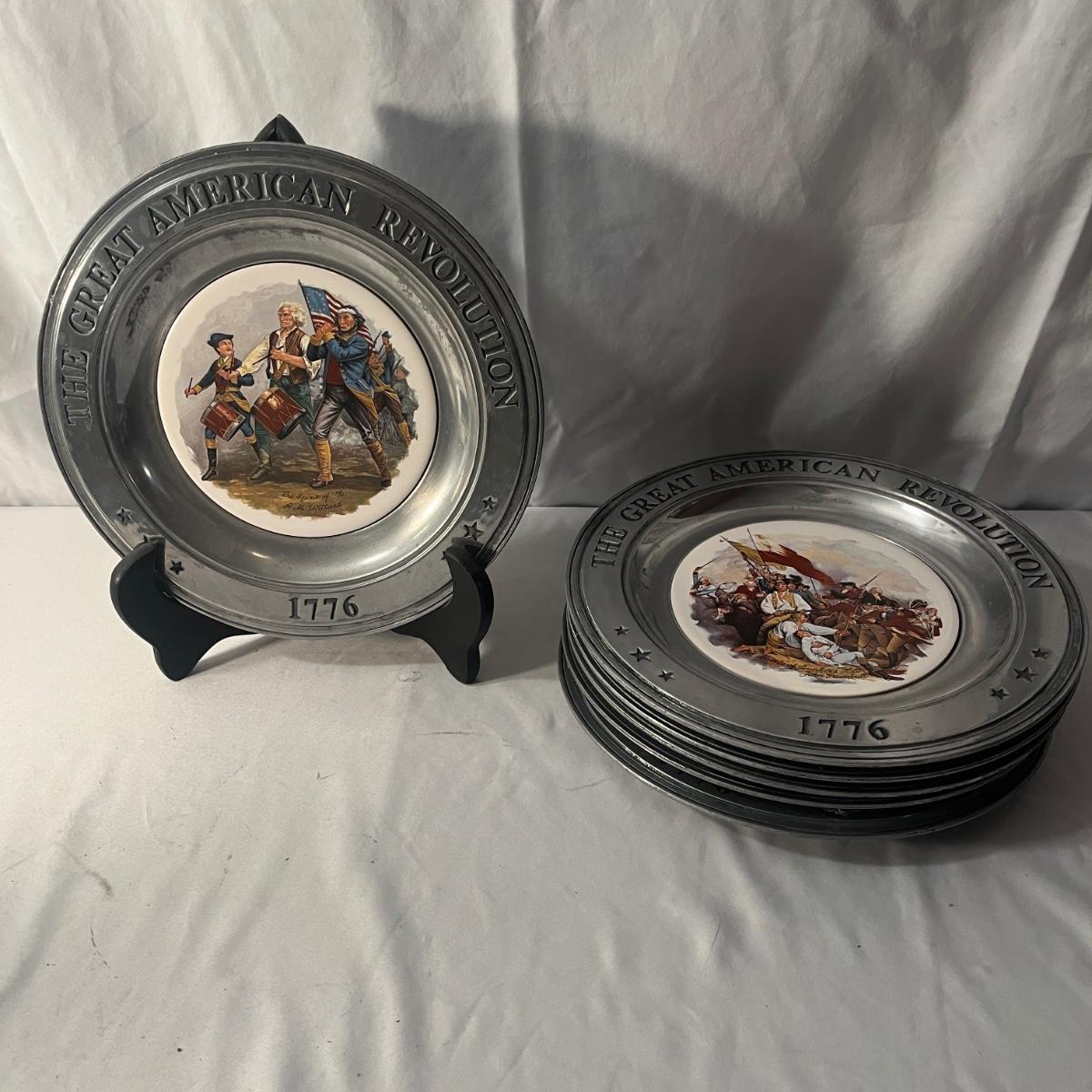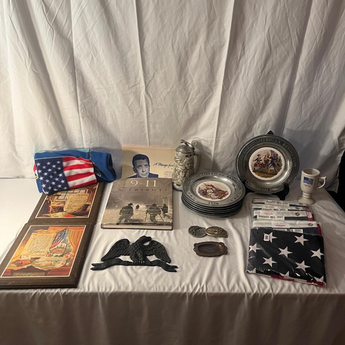 Lot includes six The Great American Revolution pewter plates with tile centers, stein, cup, 9/11 book, two wooden plaques, five US flags and more. Plates measure 10.5”D.