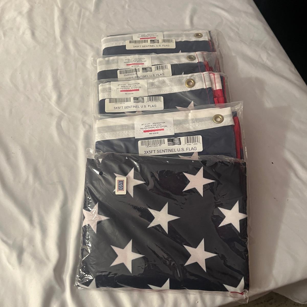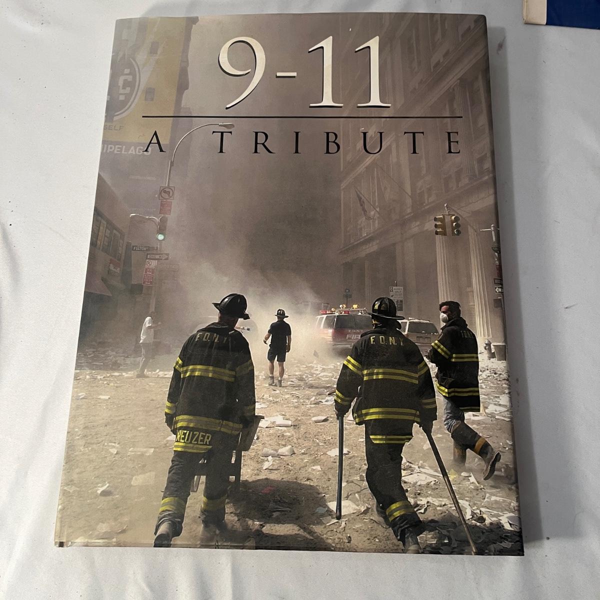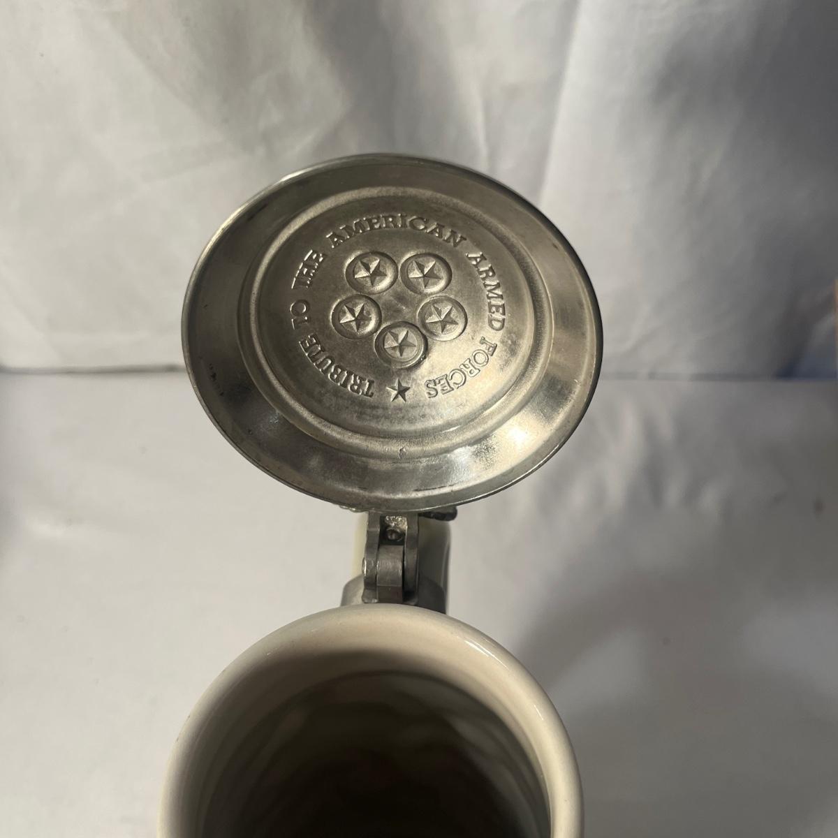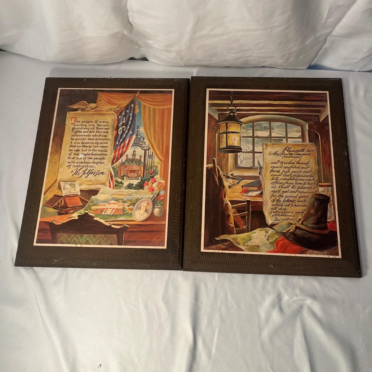 Lot includes six The Great American Revolution pewter plates with tile centers, stein, cup, 9/11 book, two wooden plaques, five US flags and more. Plates measure 10.5”D.