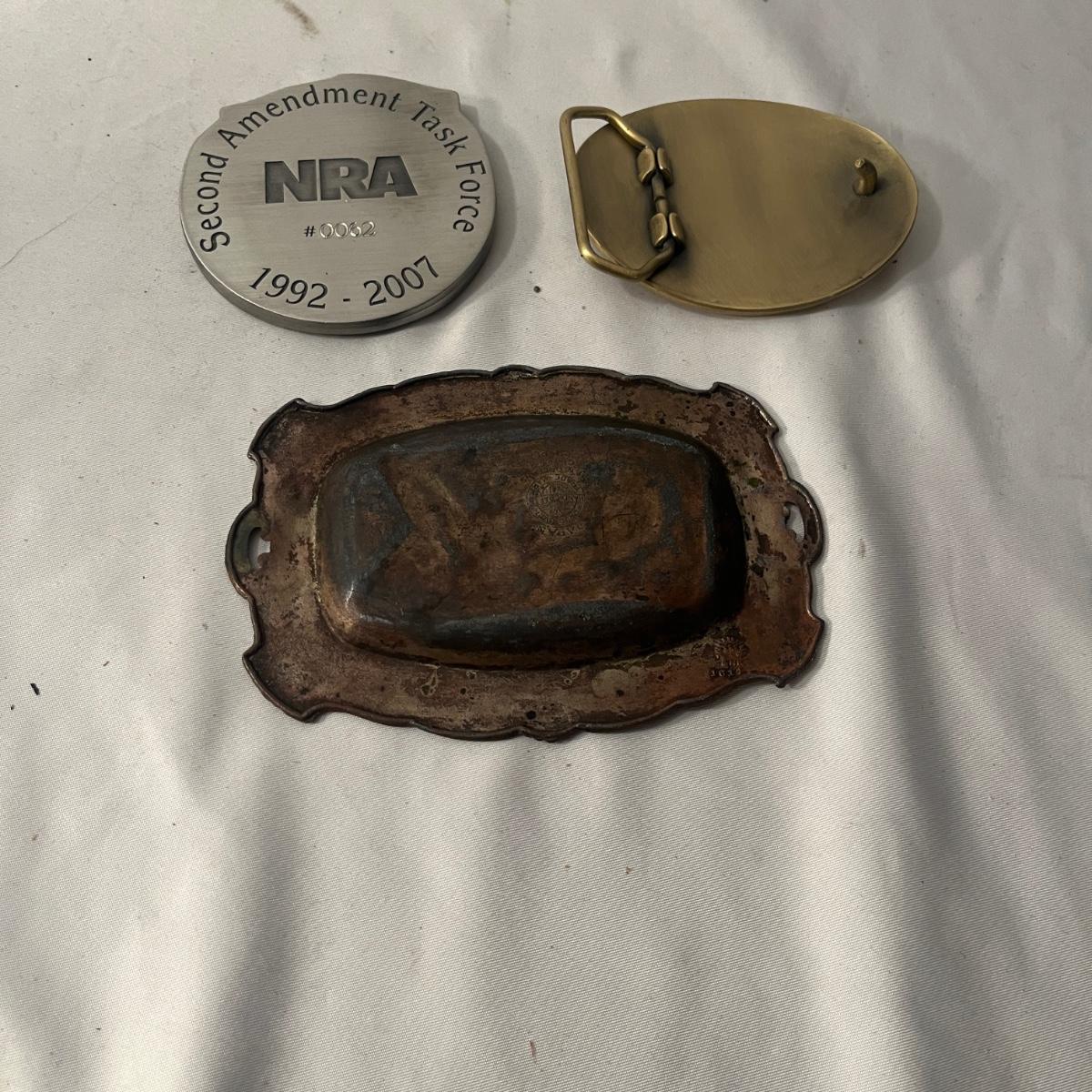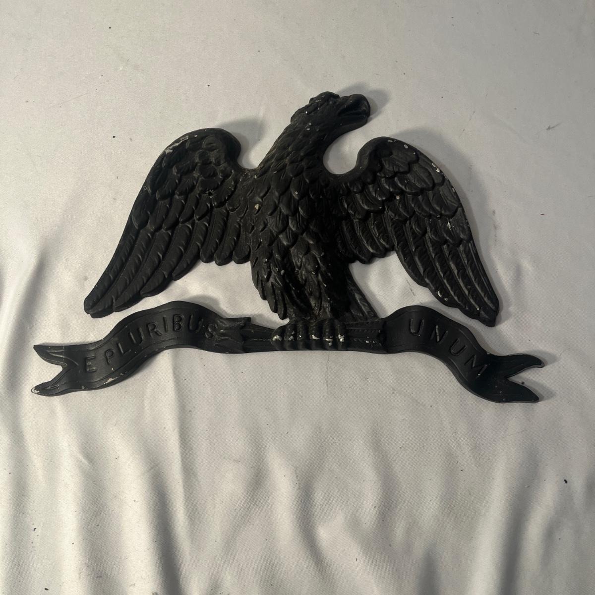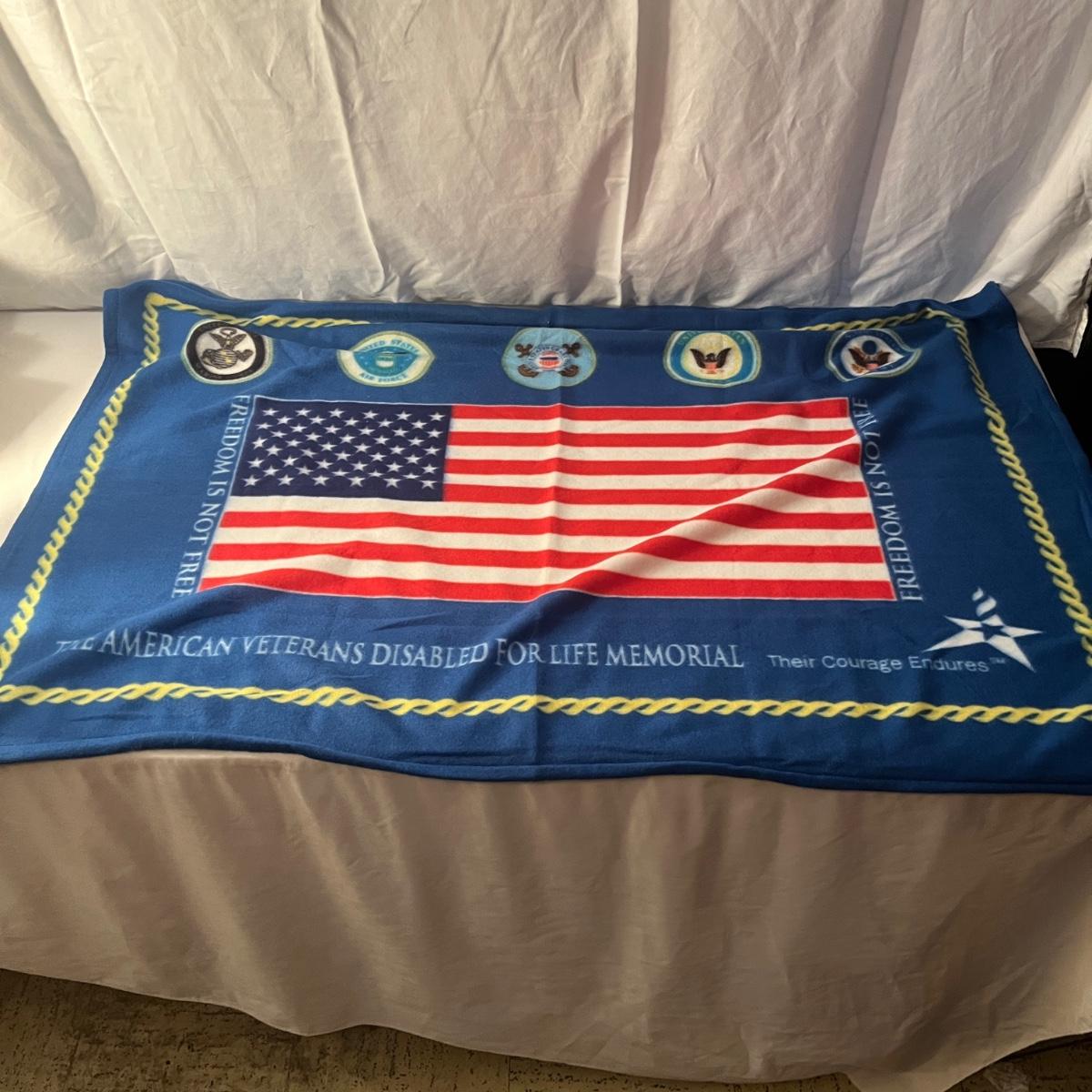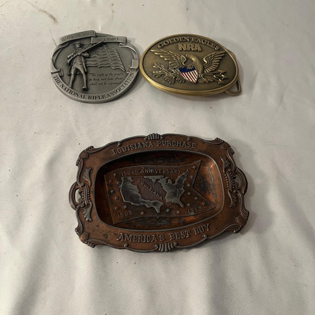 Lot includes six The Great American Revolution pewter plates with tile centers, stein, cup, 9/11 book, two wooden plaques, five US flags and more. Plates measure 10.5”D.