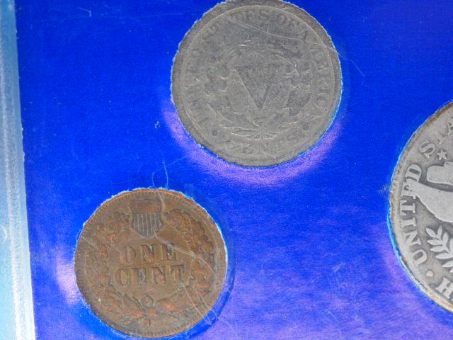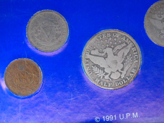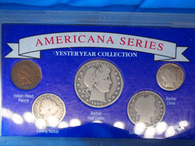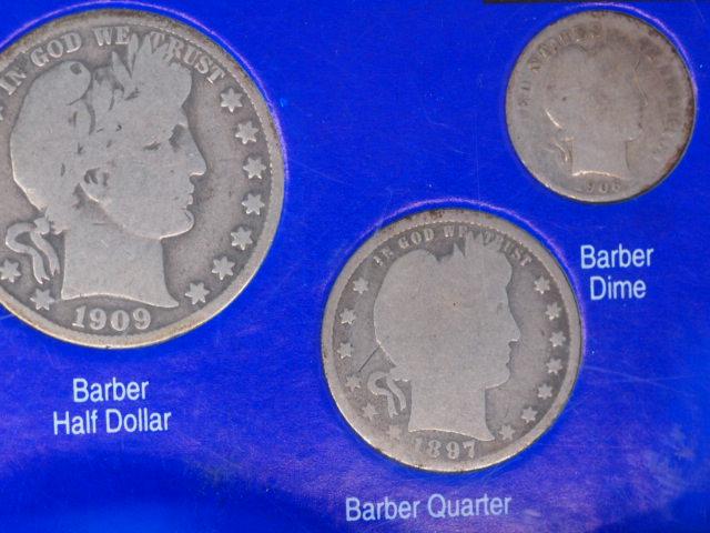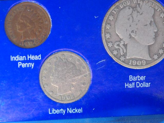 This set includes an Indian Head Penny, Liberty Nickel, Barber Half, Quarter, and Dime. All sealed in a plastic display