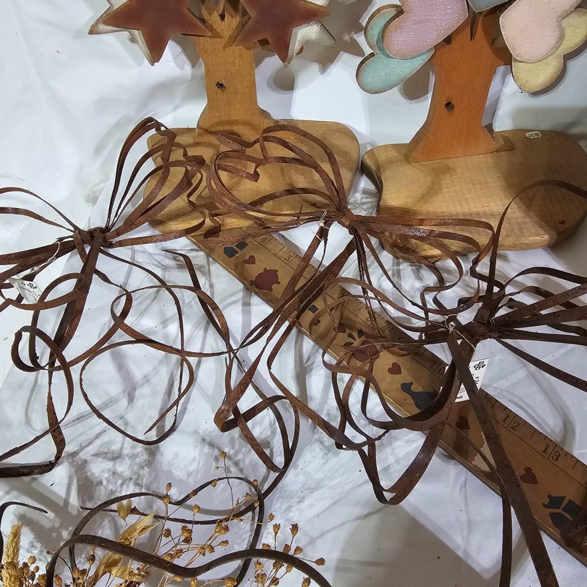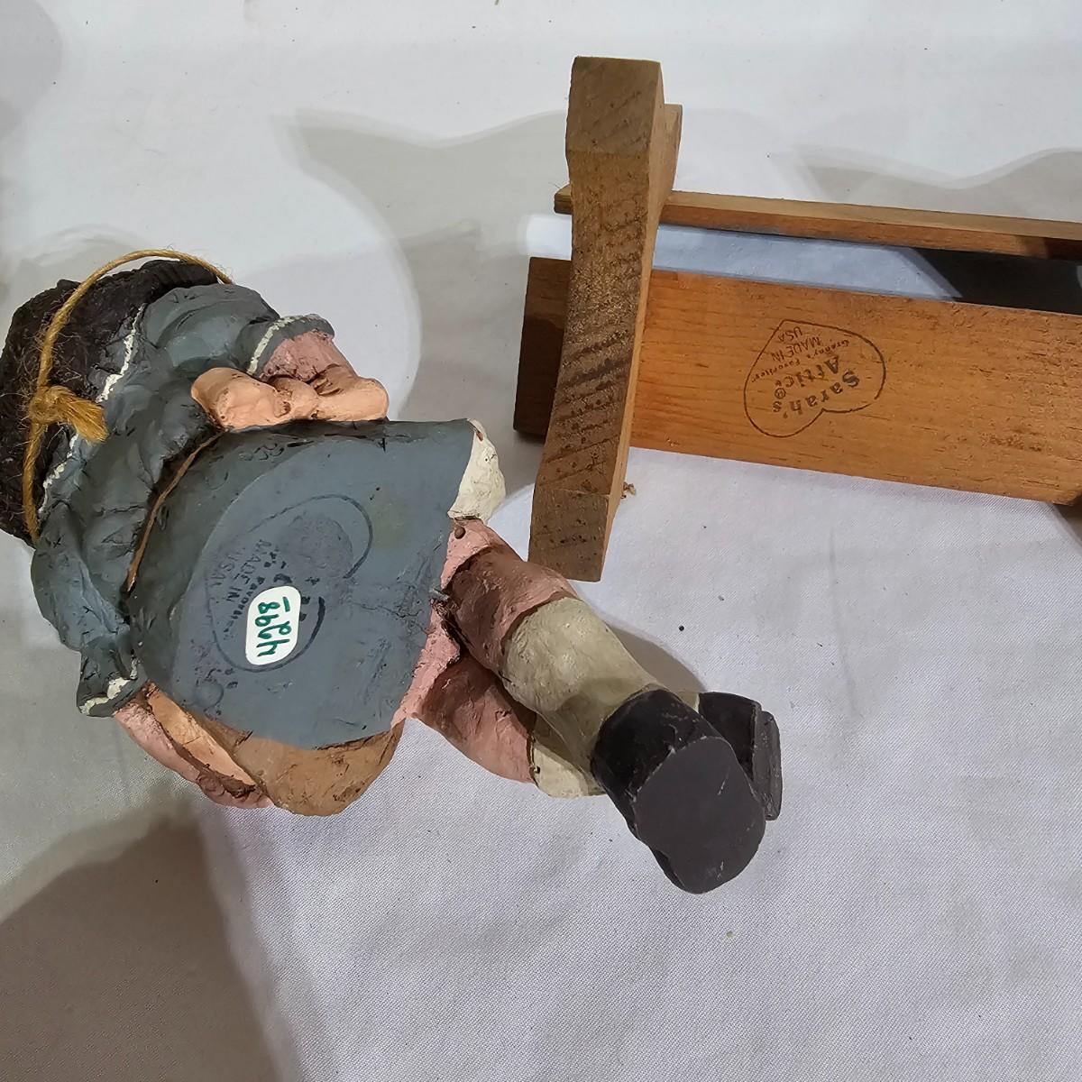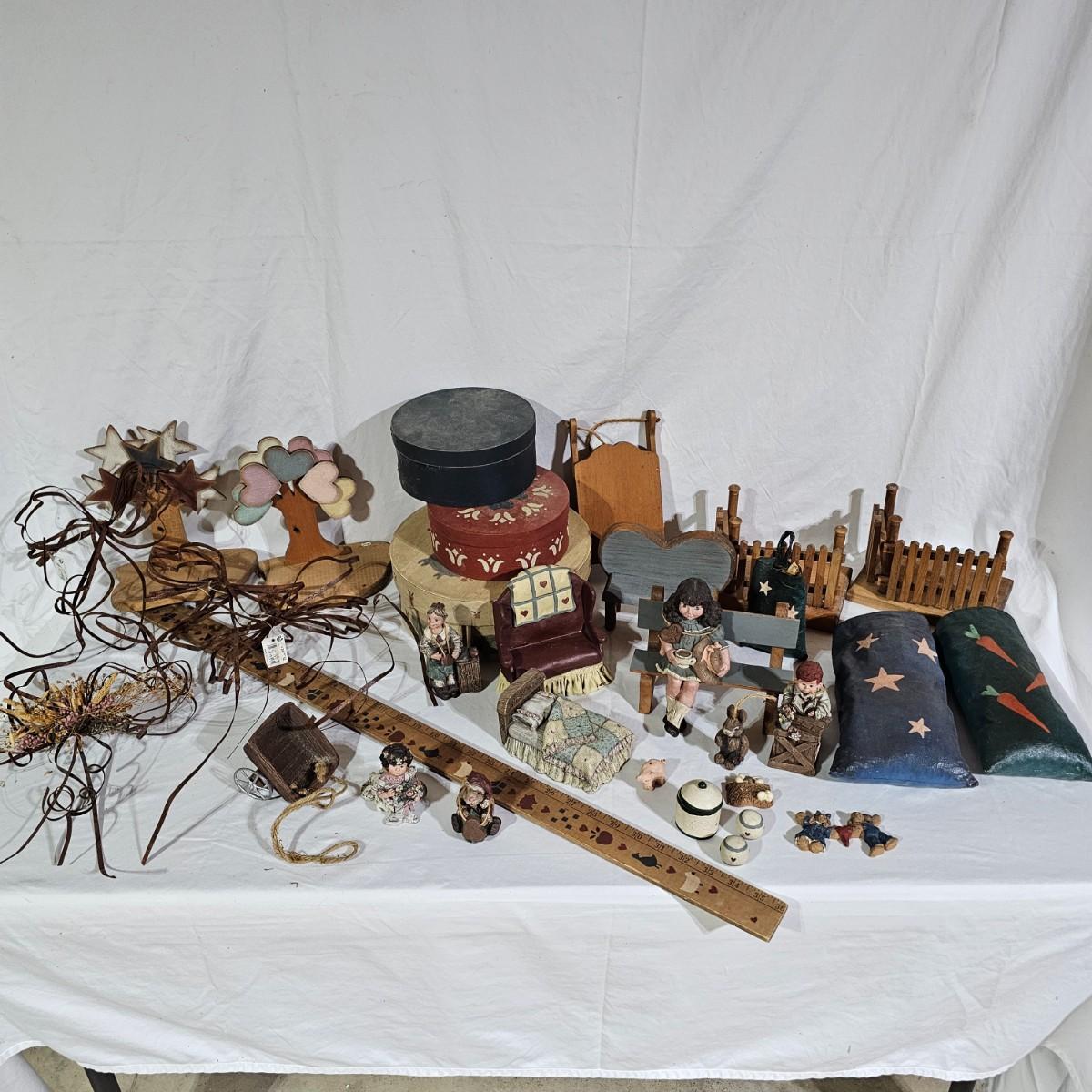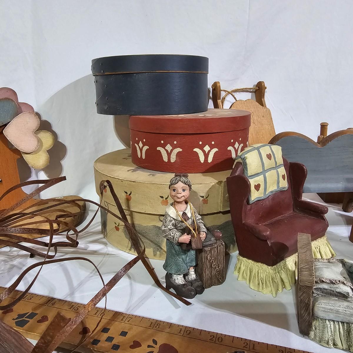 Whimsy figures, benches, wire bows, more. Four rusty metal bows with decoration, small benches with sitting figures, three wood painted cheese boxes. Many items are from Sarah's Attic, are cast resin and wood. See photos for details. Shipping available.