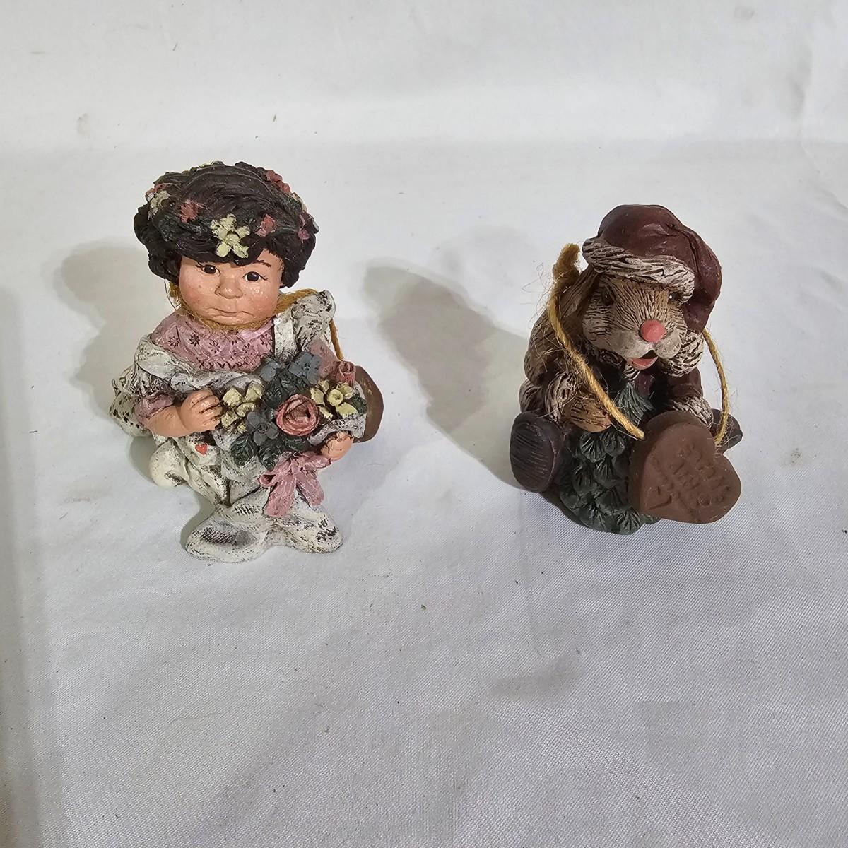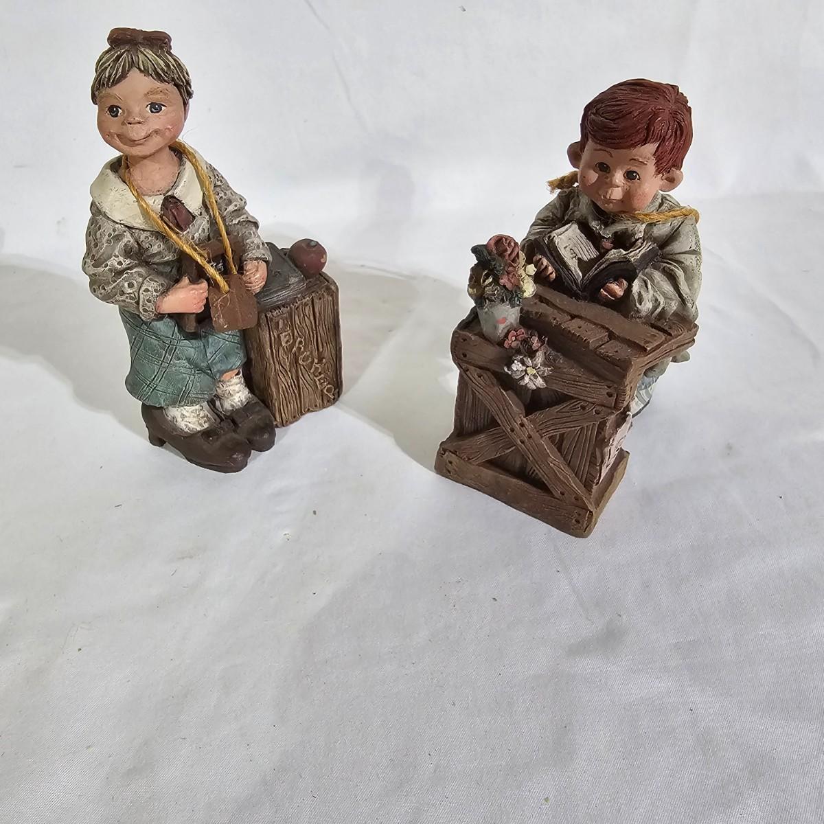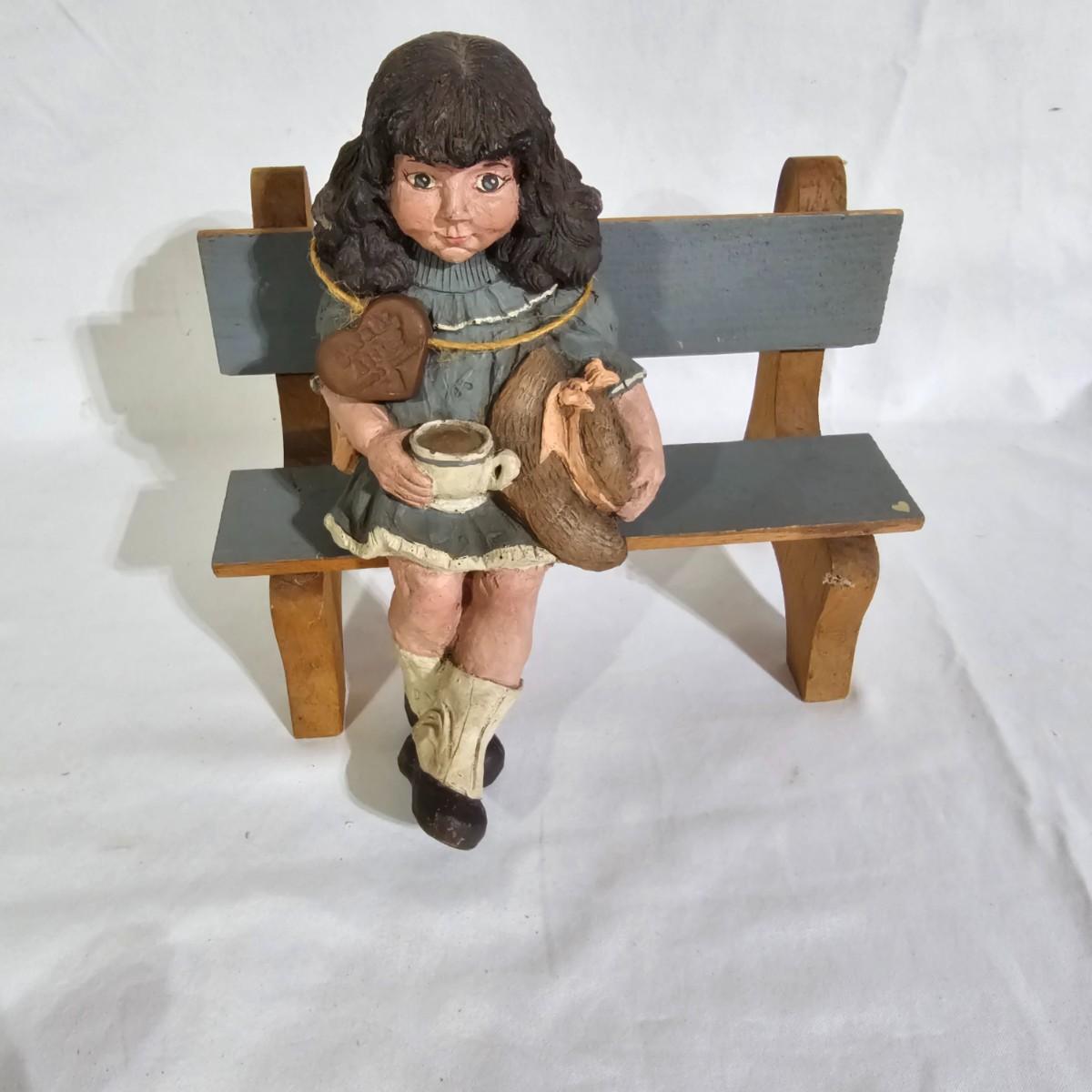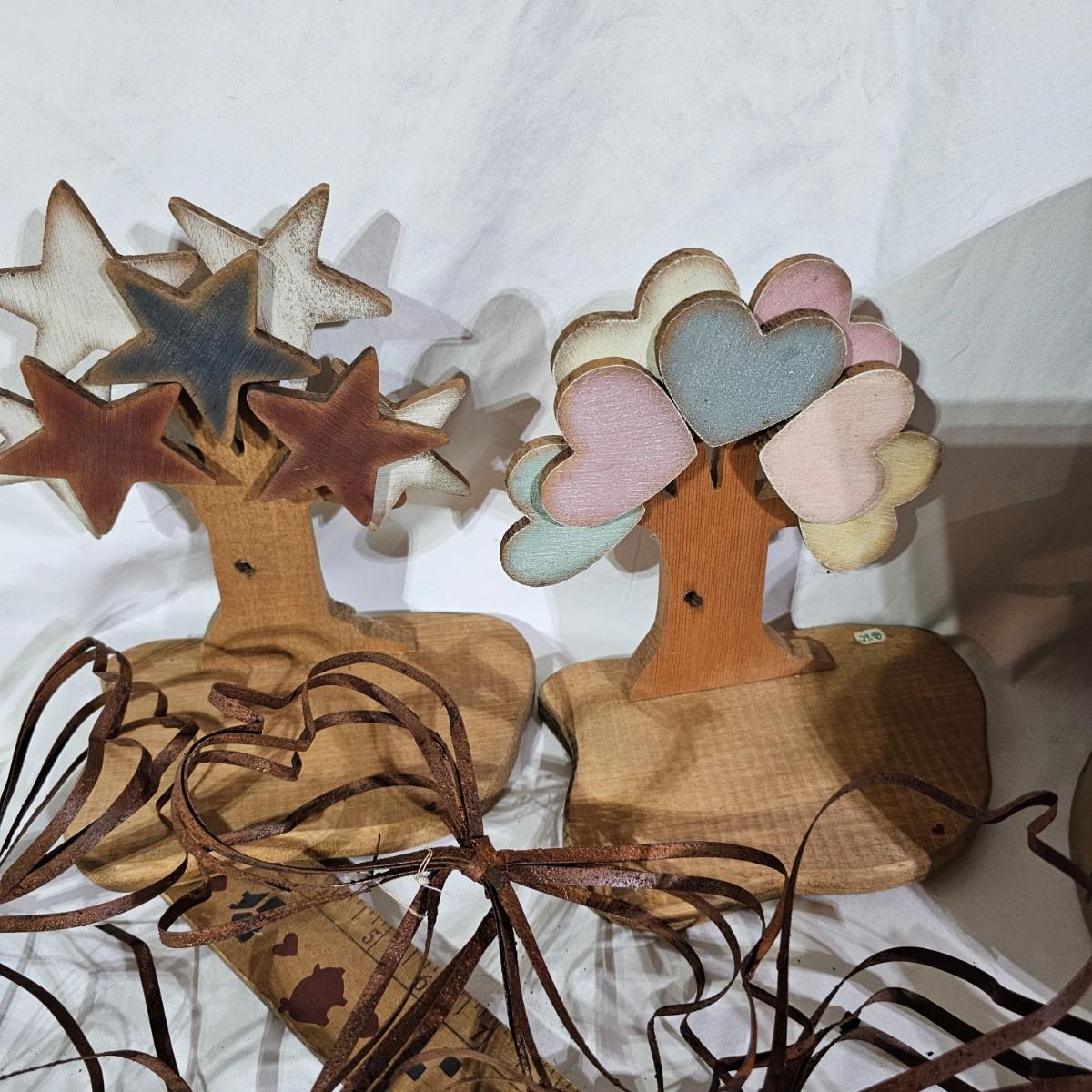 Whimsy figures, benches, wire bows, more. Four rusty metal bows with decoration, small benches with sitting figures, three wood painted cheese boxes. Many items are from Sarah's Attic, are cast resin and wood. See photos for details. Shipping available.