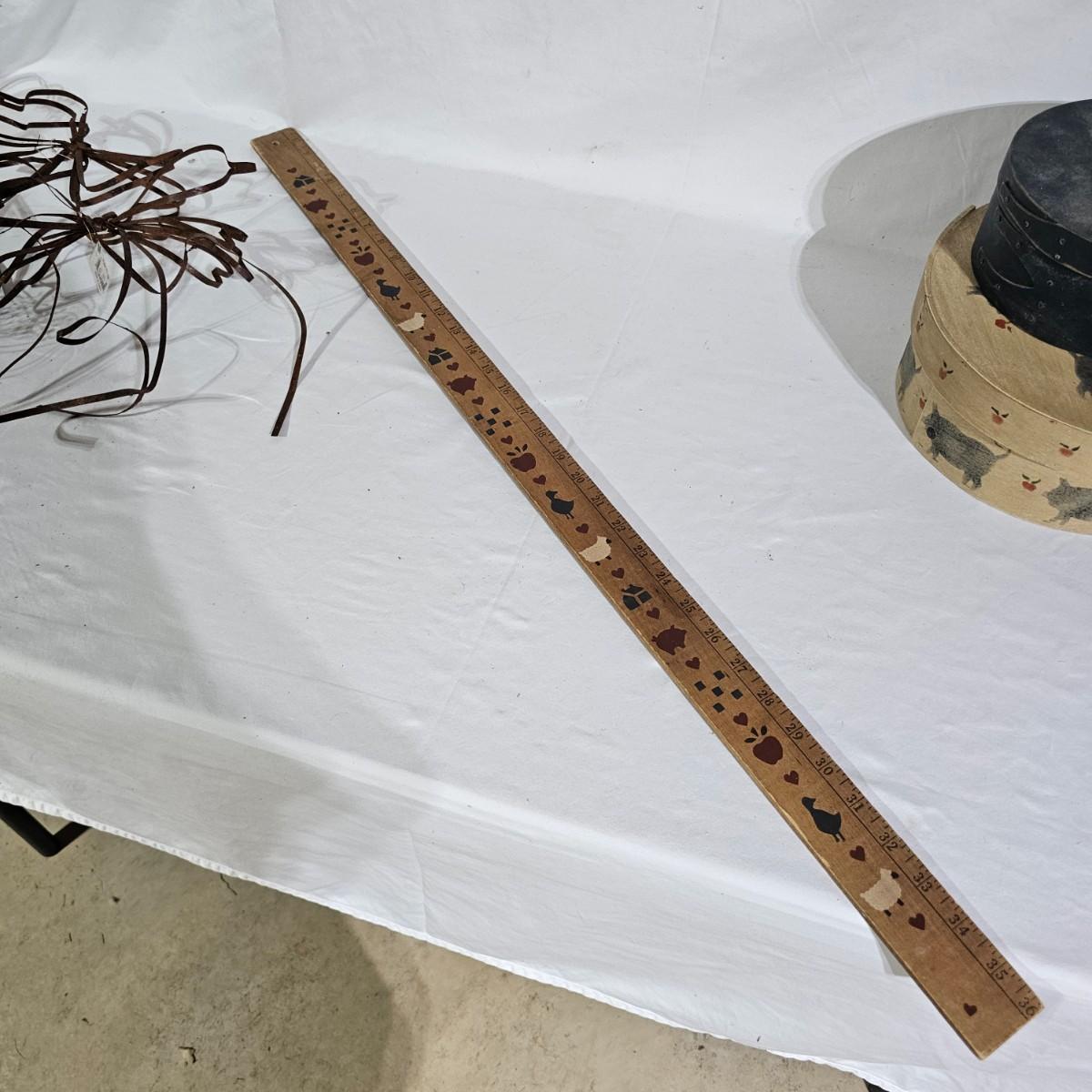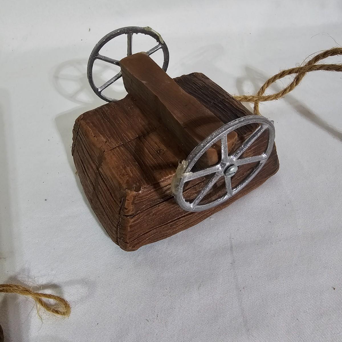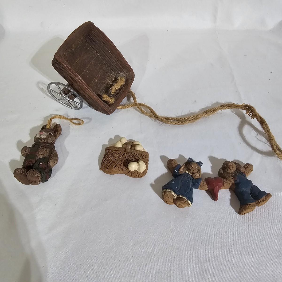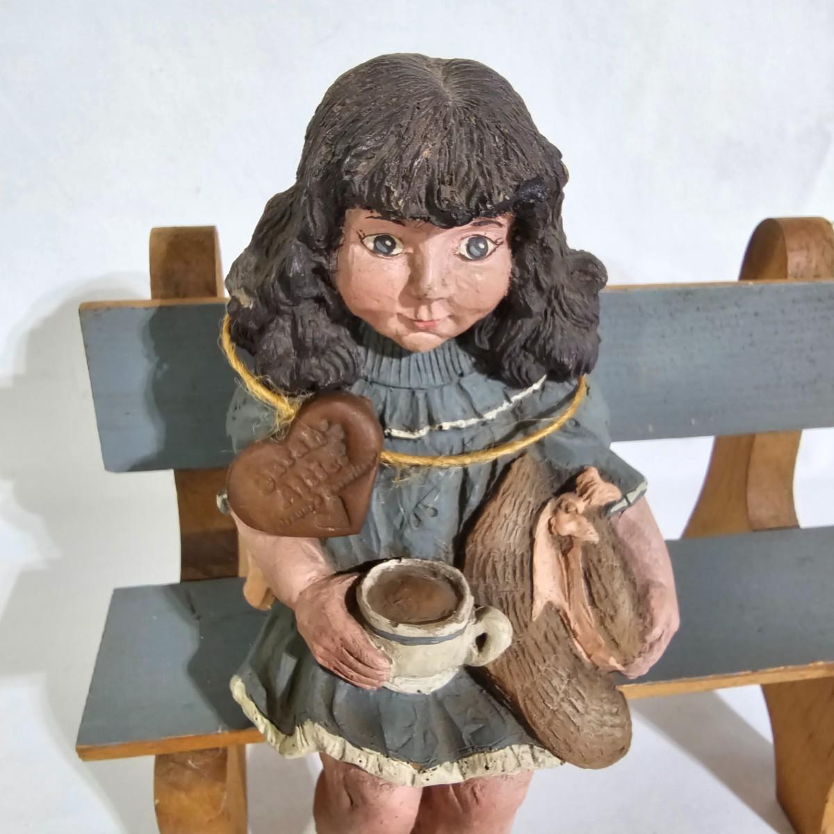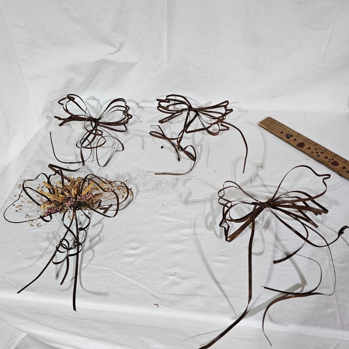Whimsy figures, benches, wire bows, more. Four rusty metal bows with decoration, small benches with sitting figures, three wood painted cheese boxes. Many items are from Sarah's Attic, are cast resin and wood. See photos for details. Shipping available.