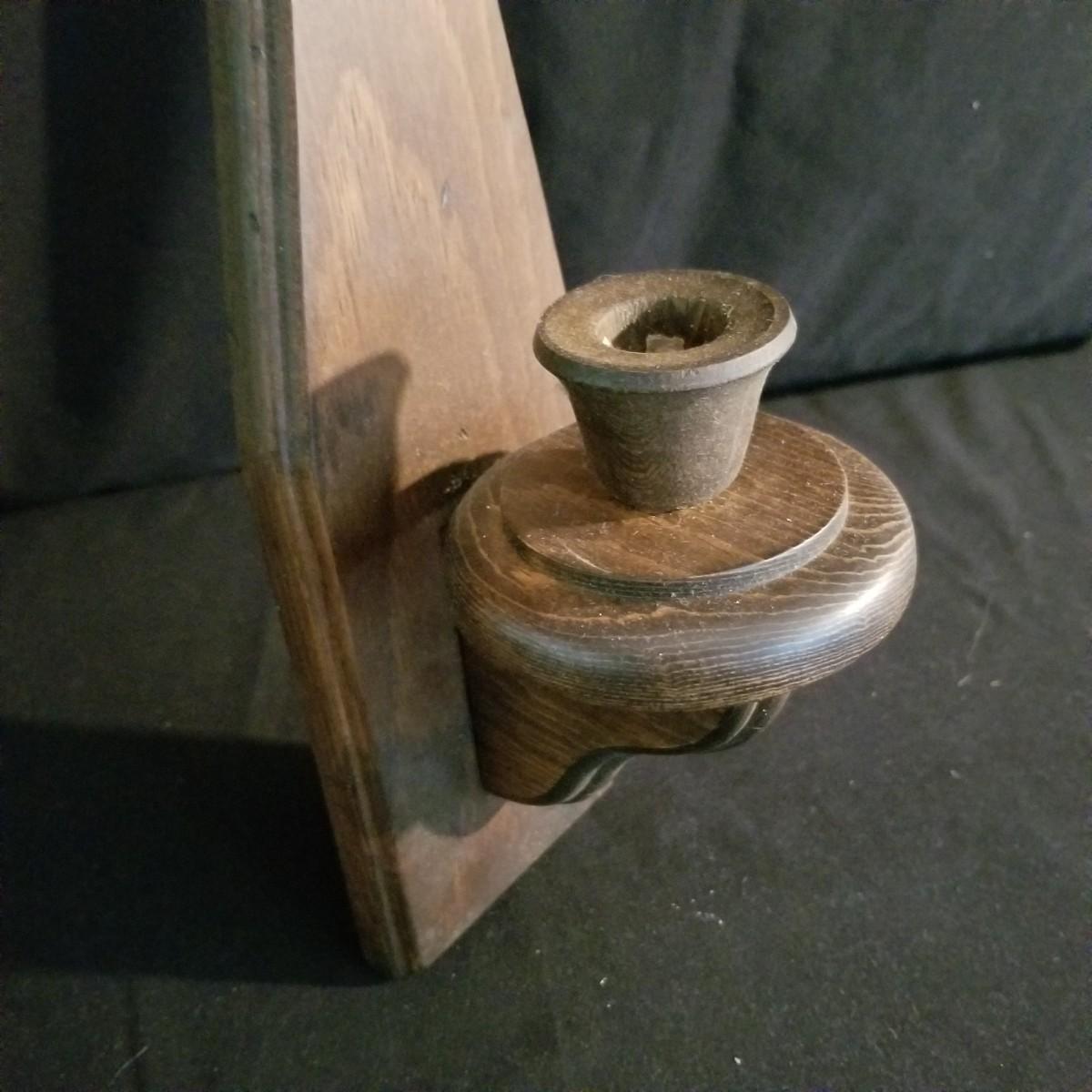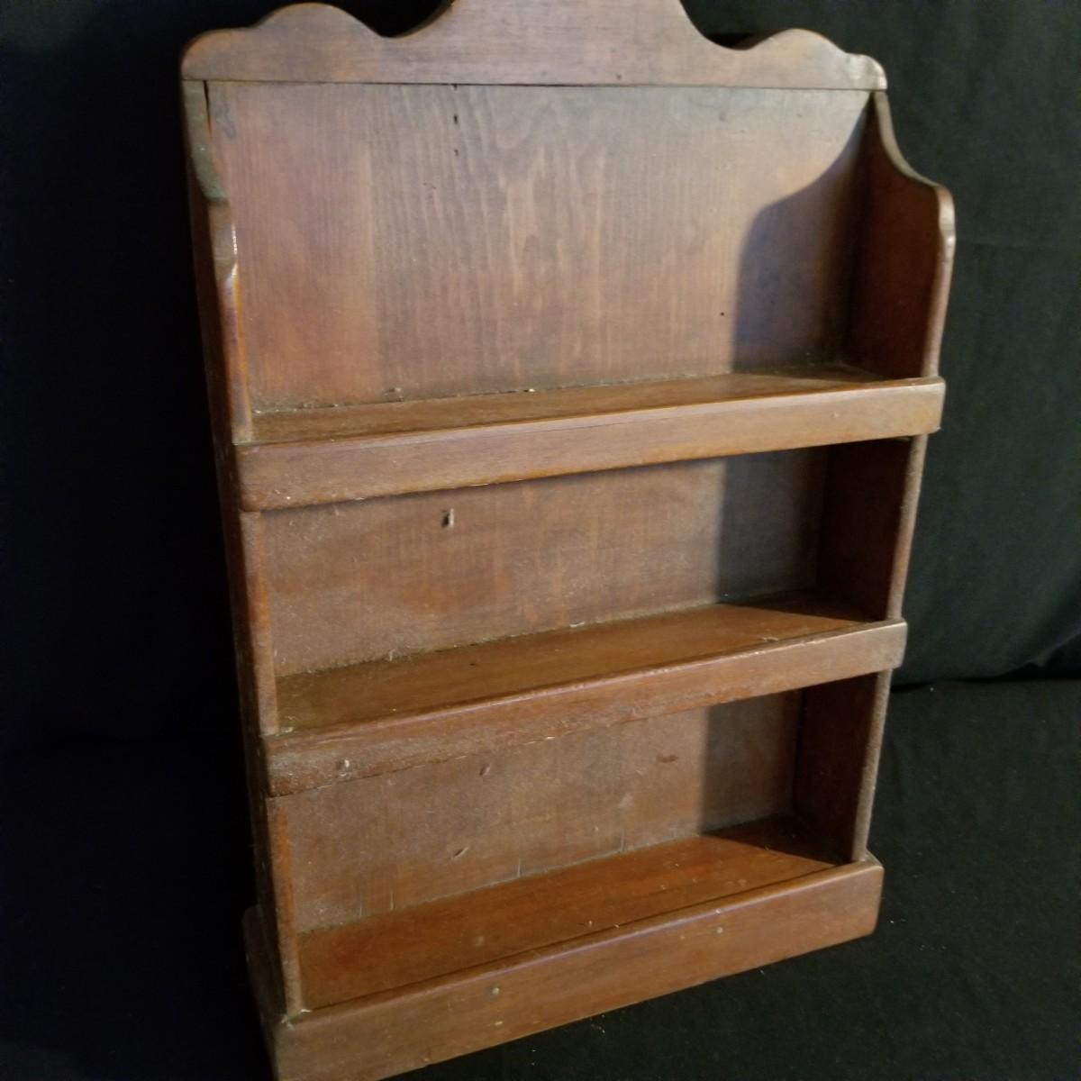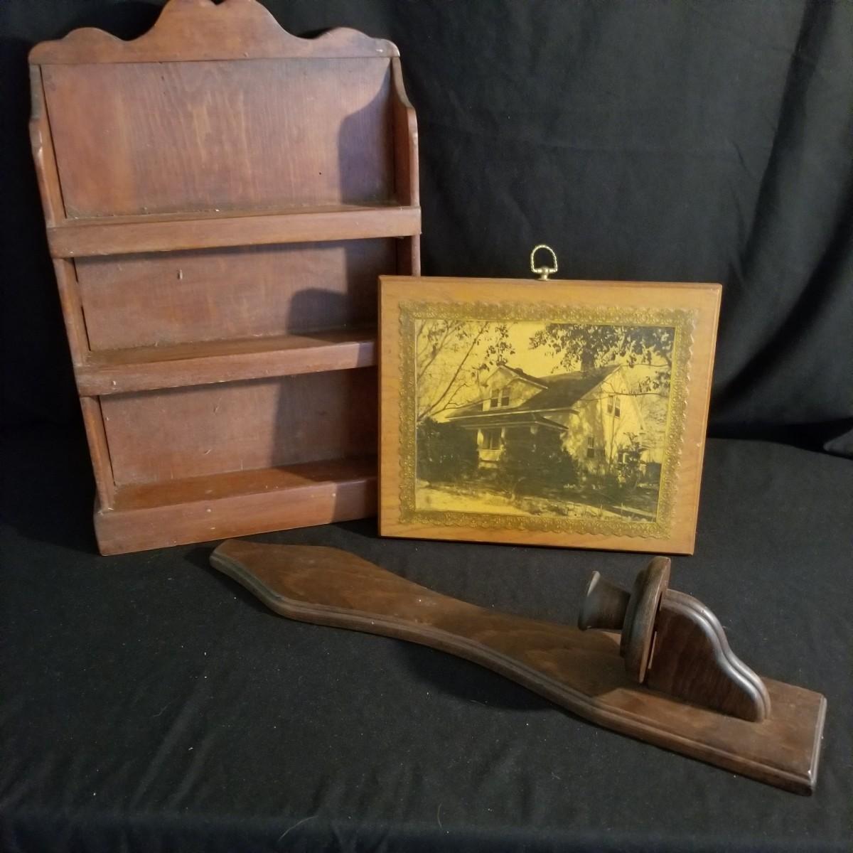 A trio of wooden pieces: a small three shelf unit, solid wood, 13" x 3.5" x 19.5".  A wooden wall candle sconce, 22" x 4" x 5". And a decoupage on wood plaque, 12.5" x 10.5".  Shipping available.