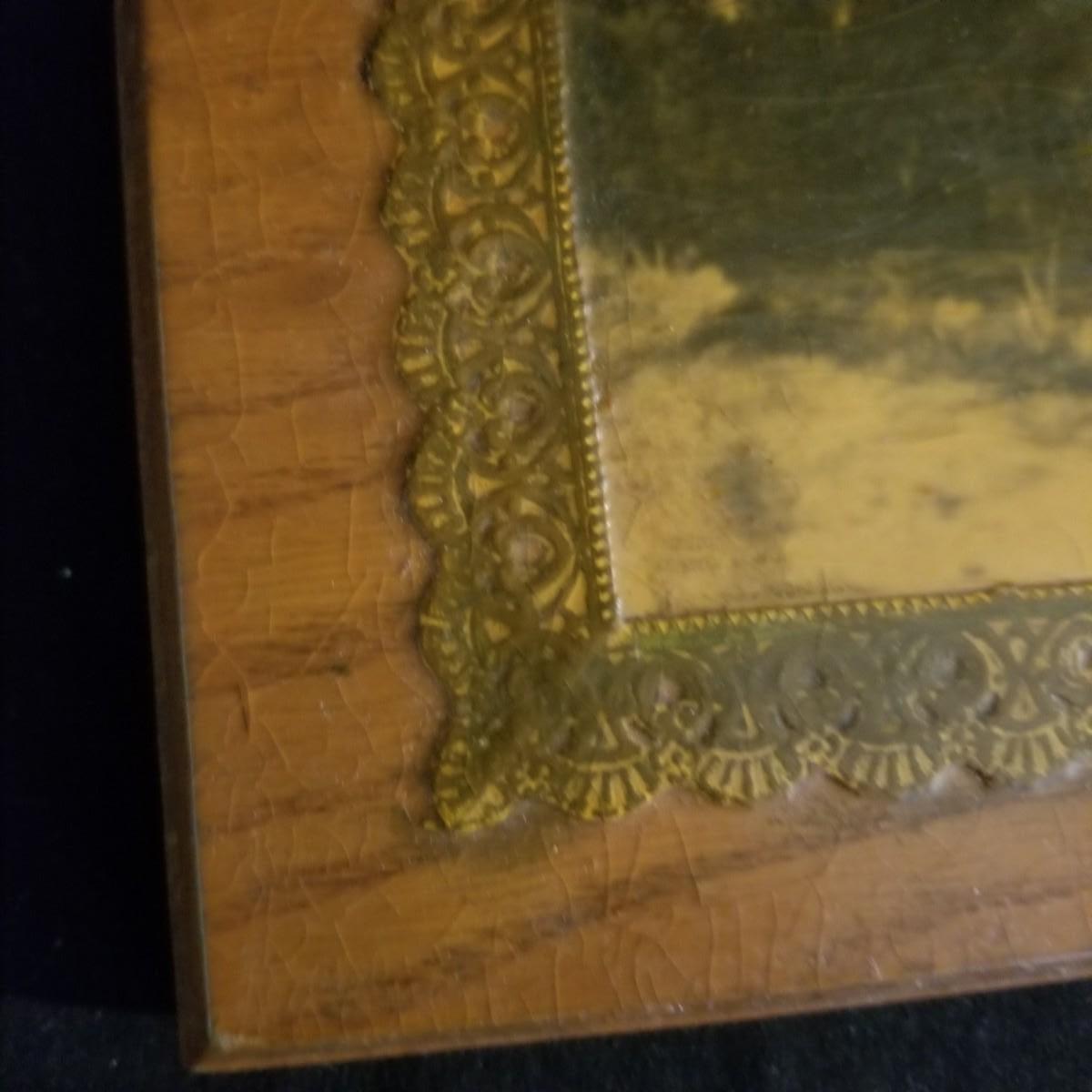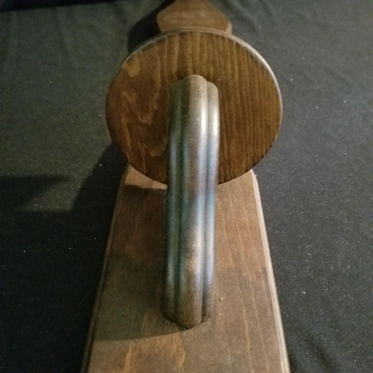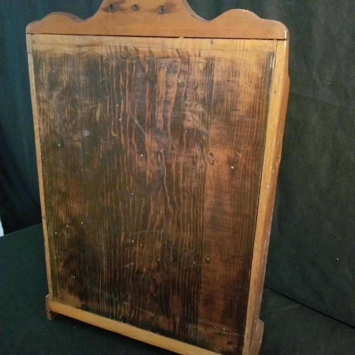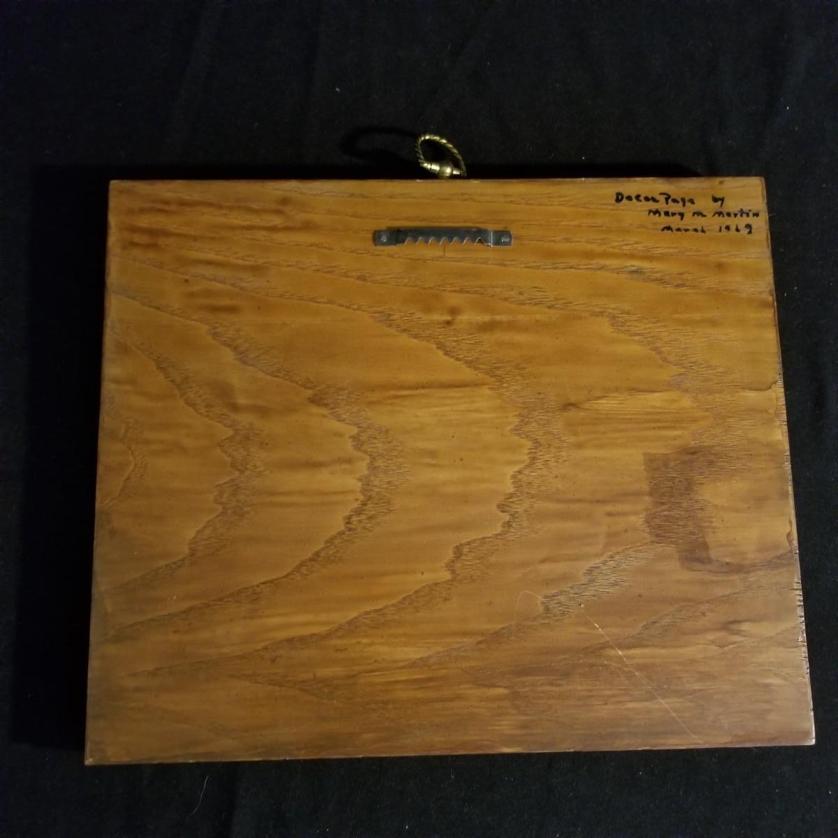 A trio of wooden pieces: a small three shelf unit, solid wood, 13" x 3.5" x 19.5".  A wooden wall candle sconce, 22" x 4" x 5". And a decoupage on wood plaque, 12.5" x 10.5".  Shipping available.