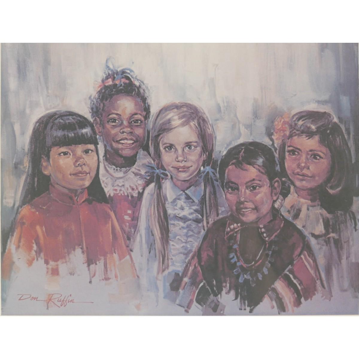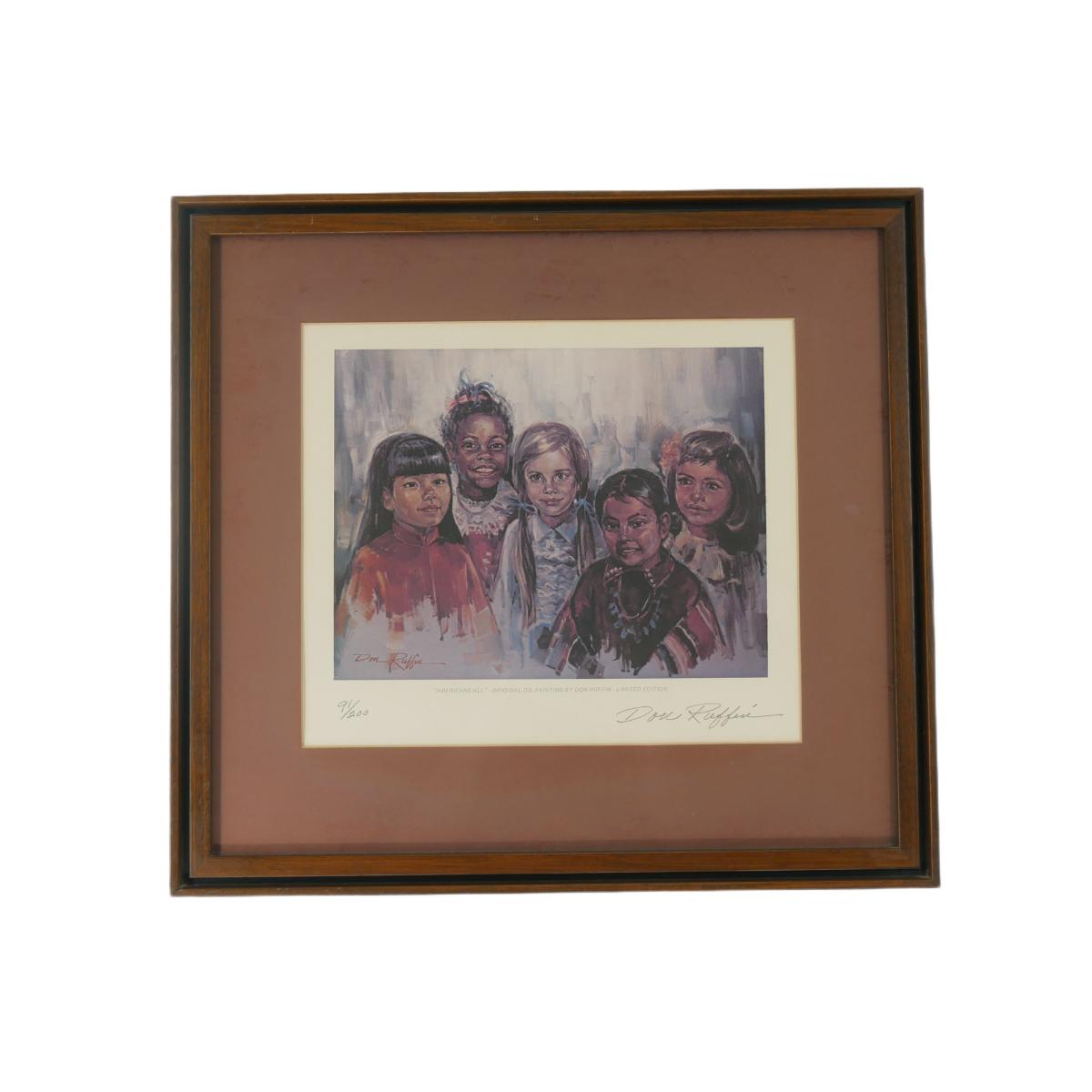 "Americans All" childrens' portraits by Don Ruffin limited edition lithograph, numbered 91/200. Double-signed, one in print and one hand-signed in pencil. Excellent condition! Art measures L 11.25" x H 8.5". Frame measures L 19.5" x H 18" x D 1". Weight is 3 lb 14 oz. (A52)