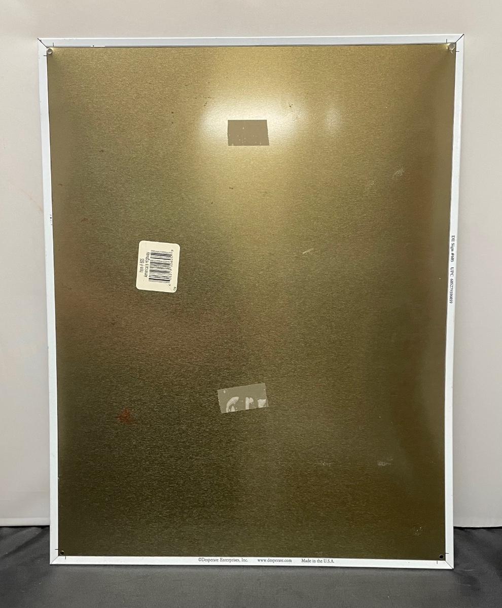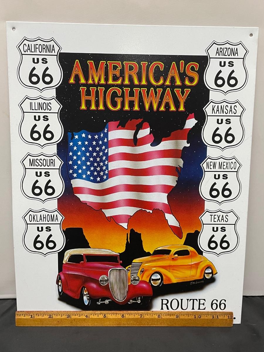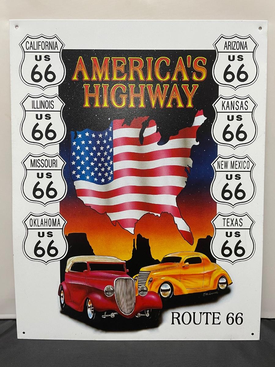This sign is in great condition. There are small holes on each corner so that it can be hung. There is small pieces of tape stuck on the back of the sign. It has all the different route 66’s in America on the front. It is approximately 13” long and 16.5” tall.
