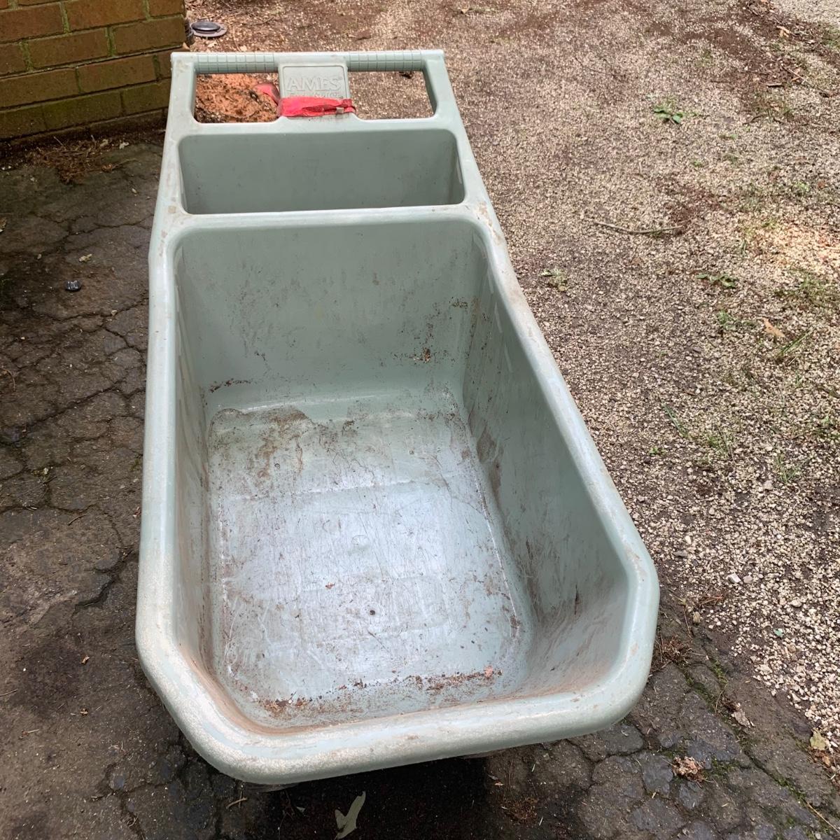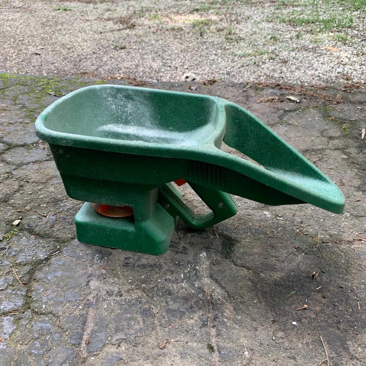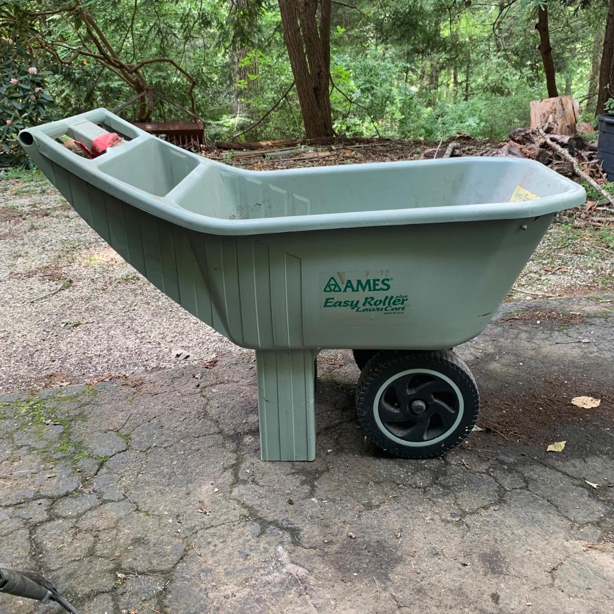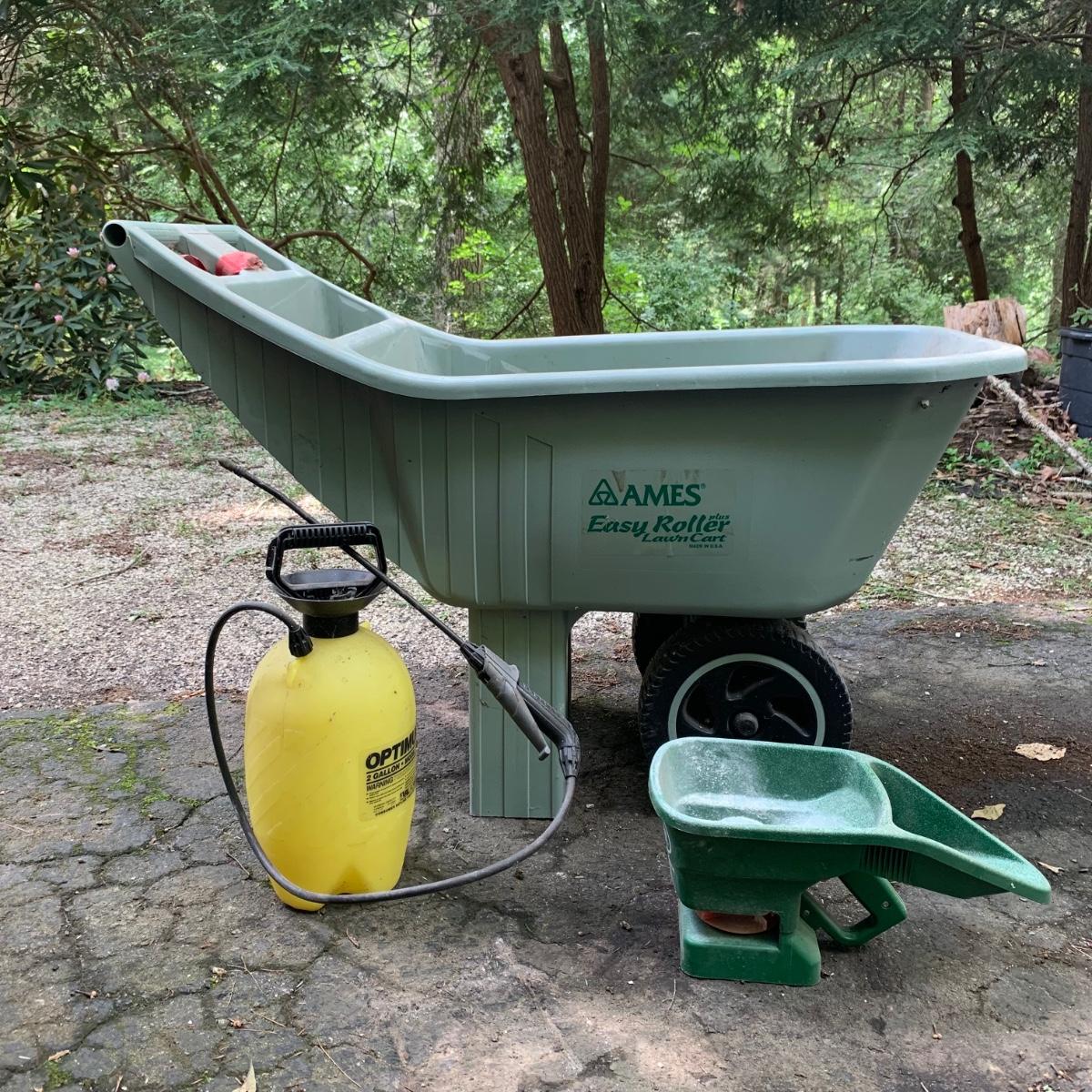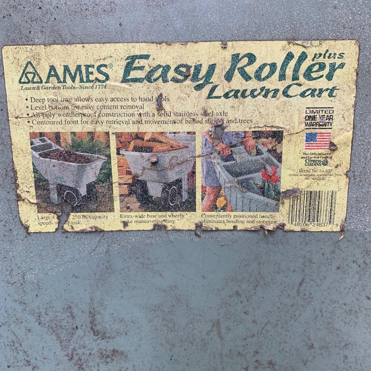 The Ames Easy Roller Plus Lawn Cart is a hard plastic cart with a 250 lb. capacity. The two wheels are also hard plastic with a stainless steel axle. It has a deep tool tray to allow easy access to hand tools. The cart measures 44” x 21” x 30”. Also included in this lot is a Flo-Master Optimum Two-Gallon Sprayer Model 1402 and a Scott's Handy Green II. All items are quite dusty/dirty from being used outside and stored in the garage. Local pickup only.